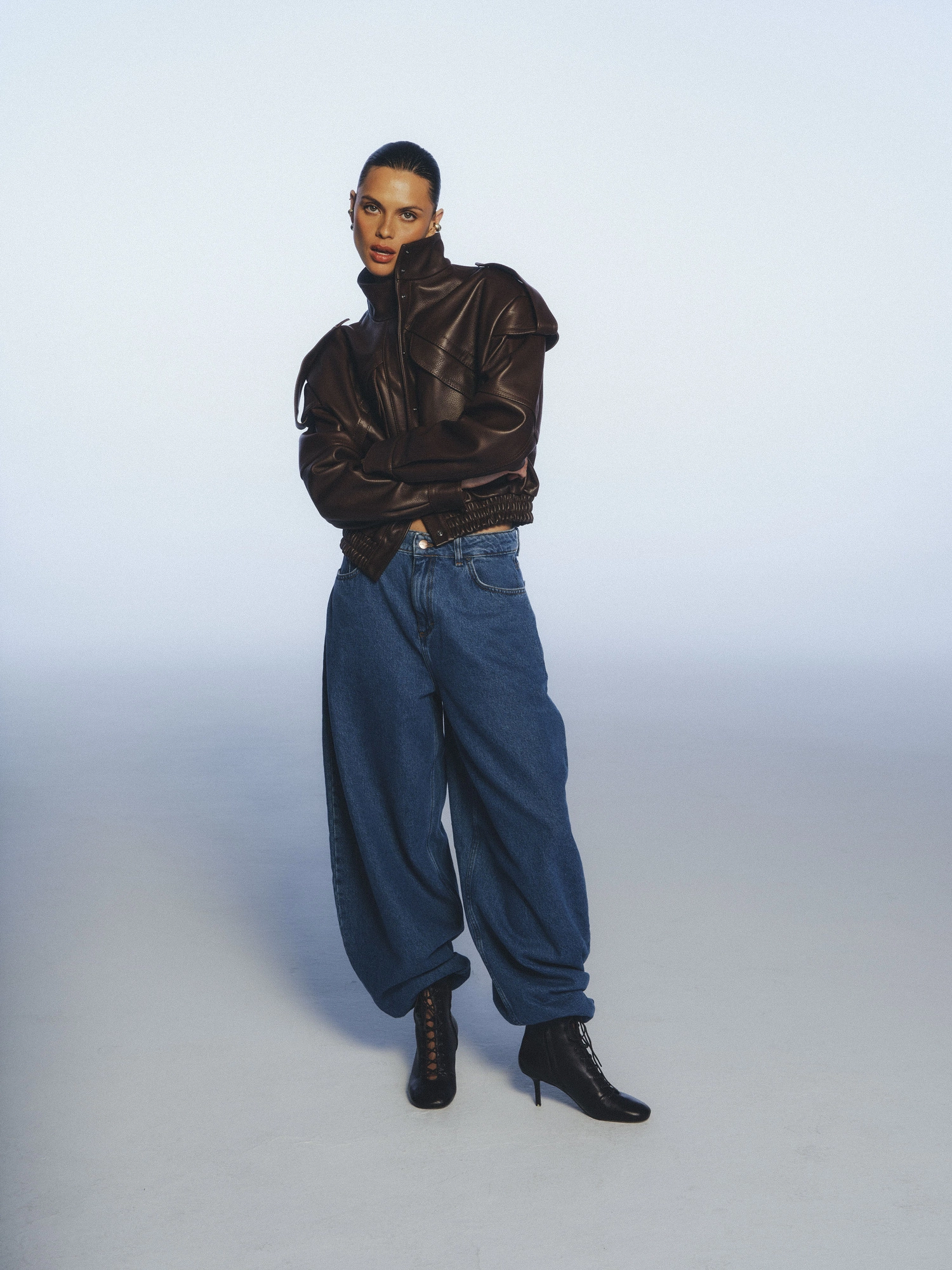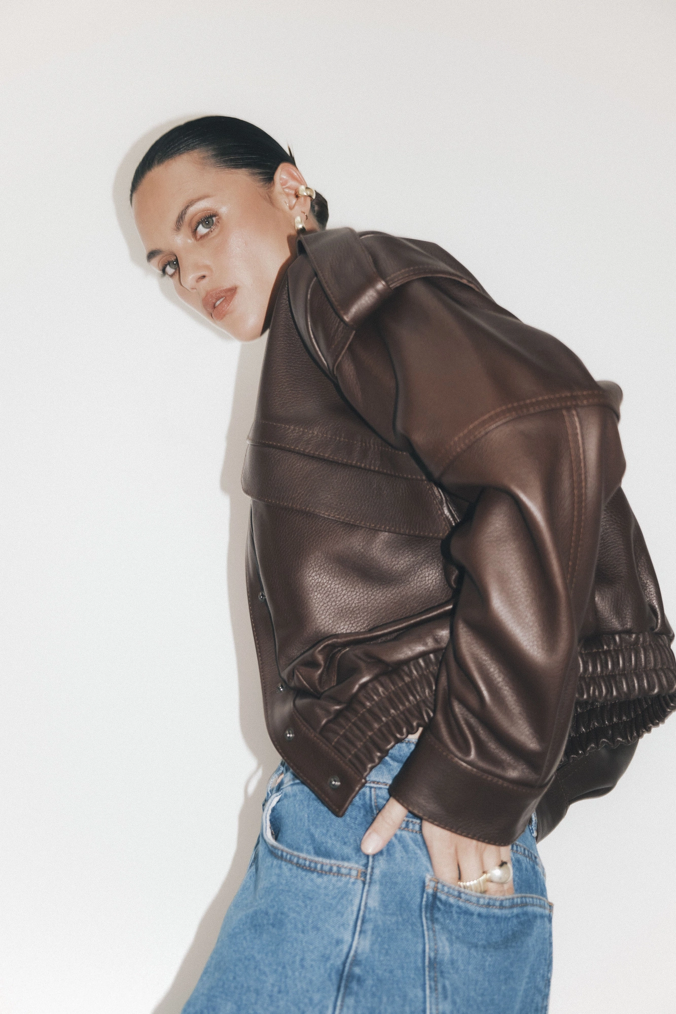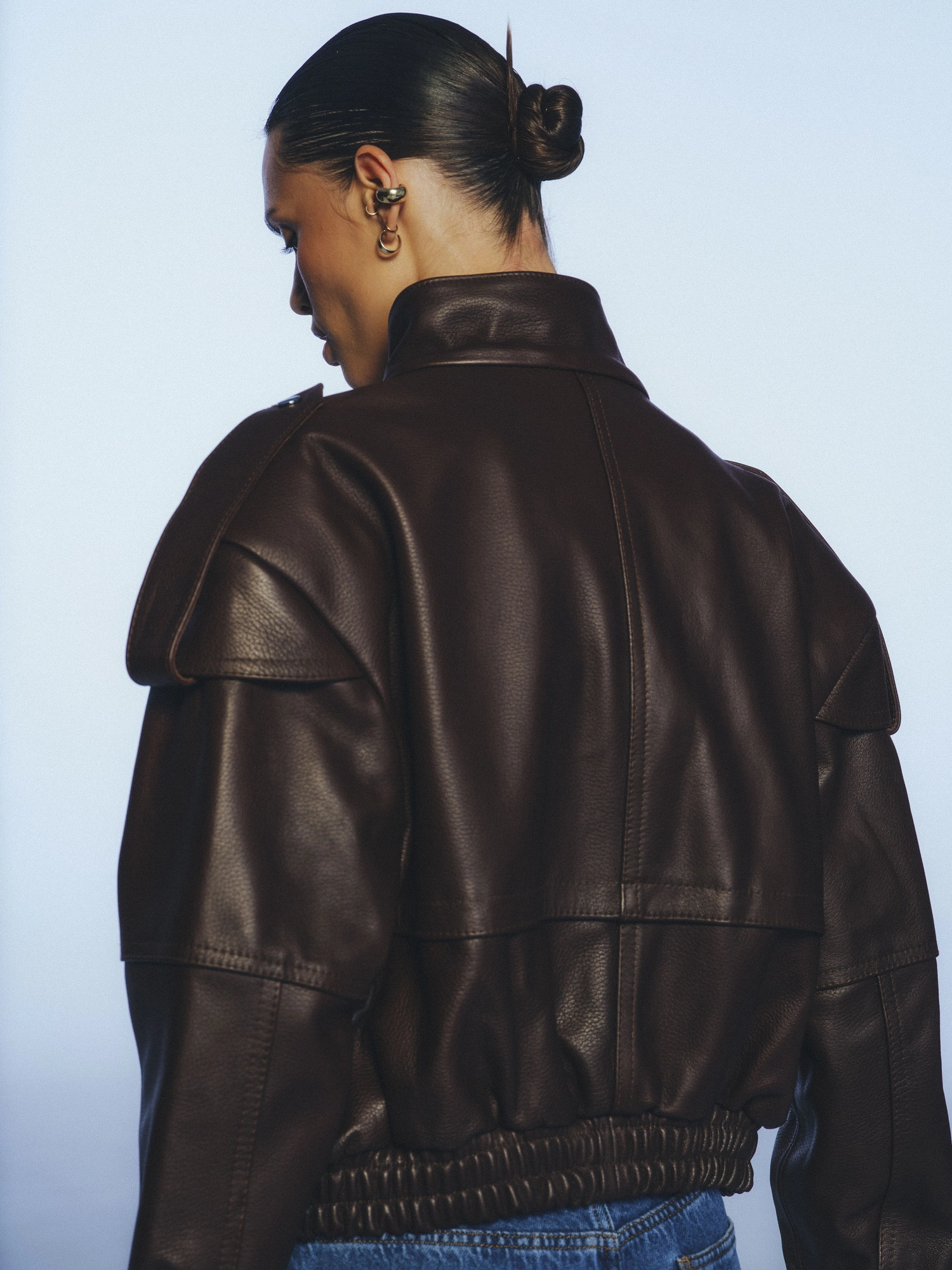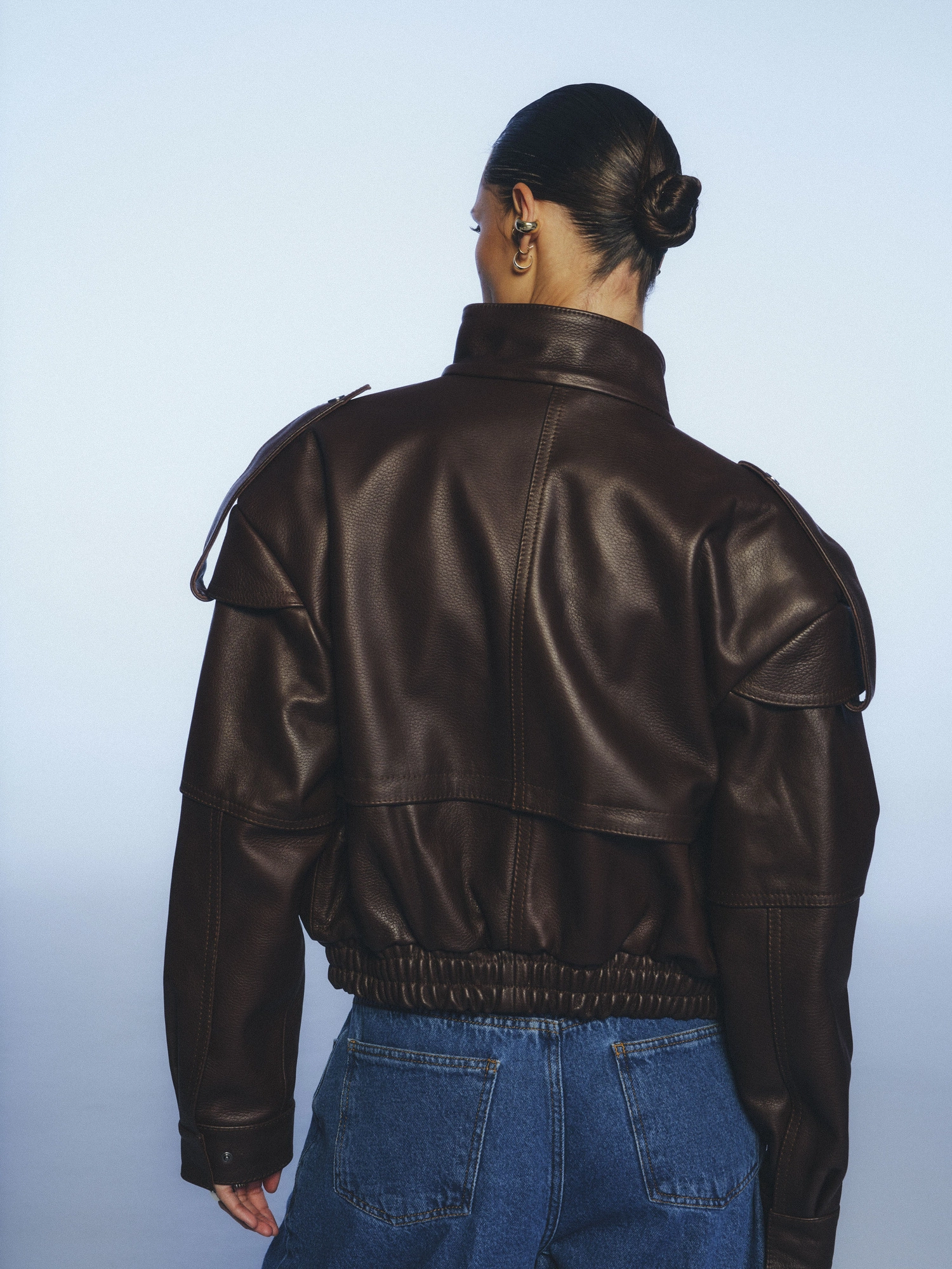 A short jacket made from 100% lamb leather in a beautiful deep chocolate shade. Designed in a bomber style, it features a slim waistband, a high collar, and unique details such as epaulettes on the shoulders, large front pockets, decorative stitching, and a distinctive texture. It fastens with snap buttons. This jacket combines stylish nonchalance with a sporty vibe, so wear it however you like—casually with jeans or dressed up with tailored trousers and a shirt. It's a timeless piece that, with proper care, will serve you for years to come.