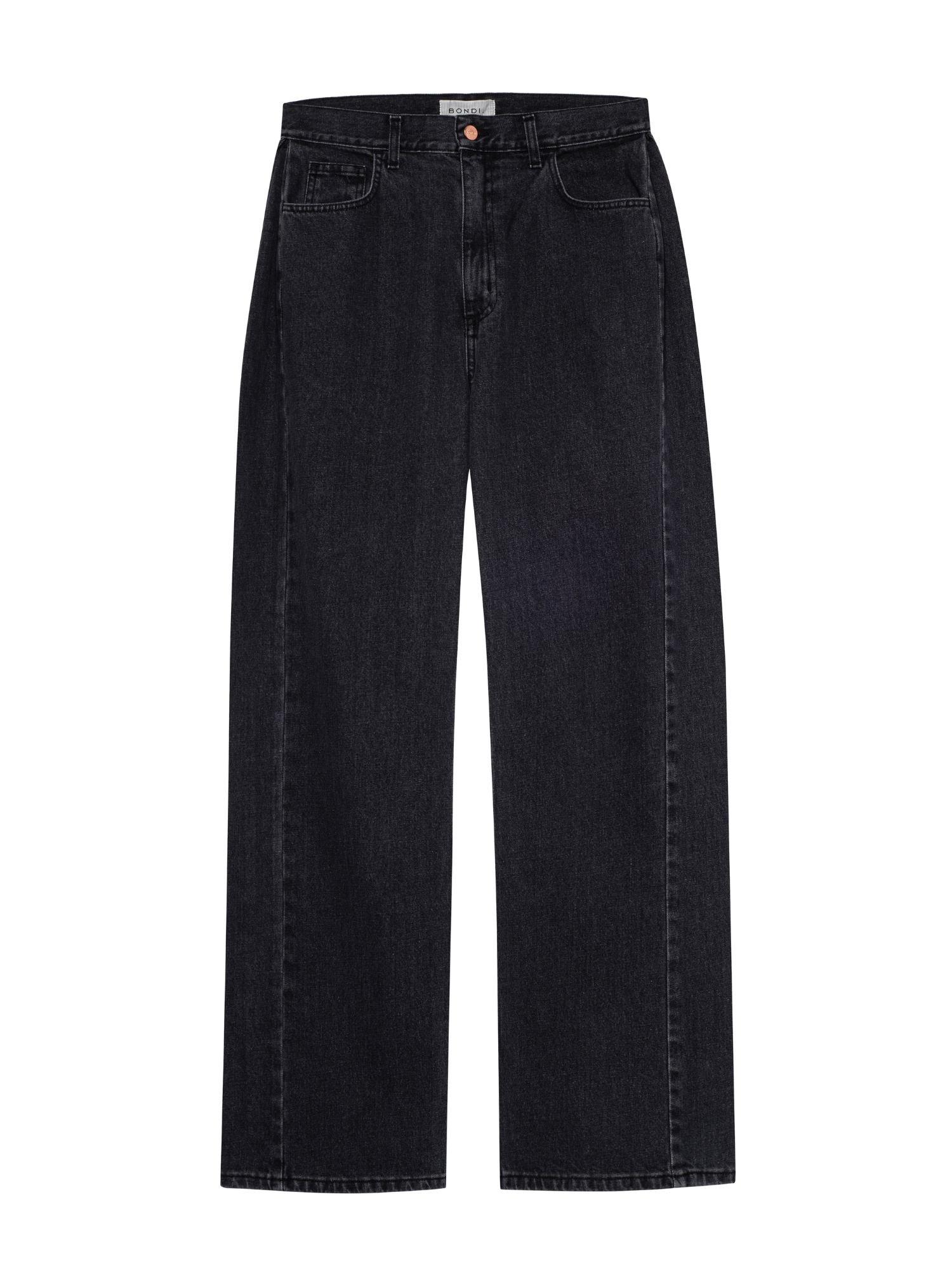 Wide-leg jeans with a low-rise fit and a distinctive side stripe. They also feature an adjustable waistband with internal elastic bands. The jeans come in a classic black shade with a vintage effect, perfect for both casual and smart outfits, adding a modern and sporty touch to your look.