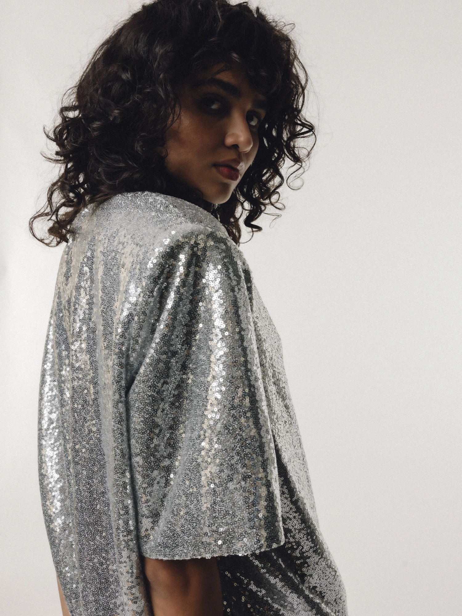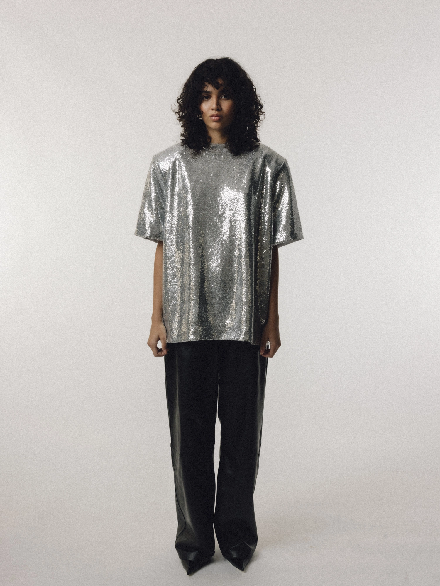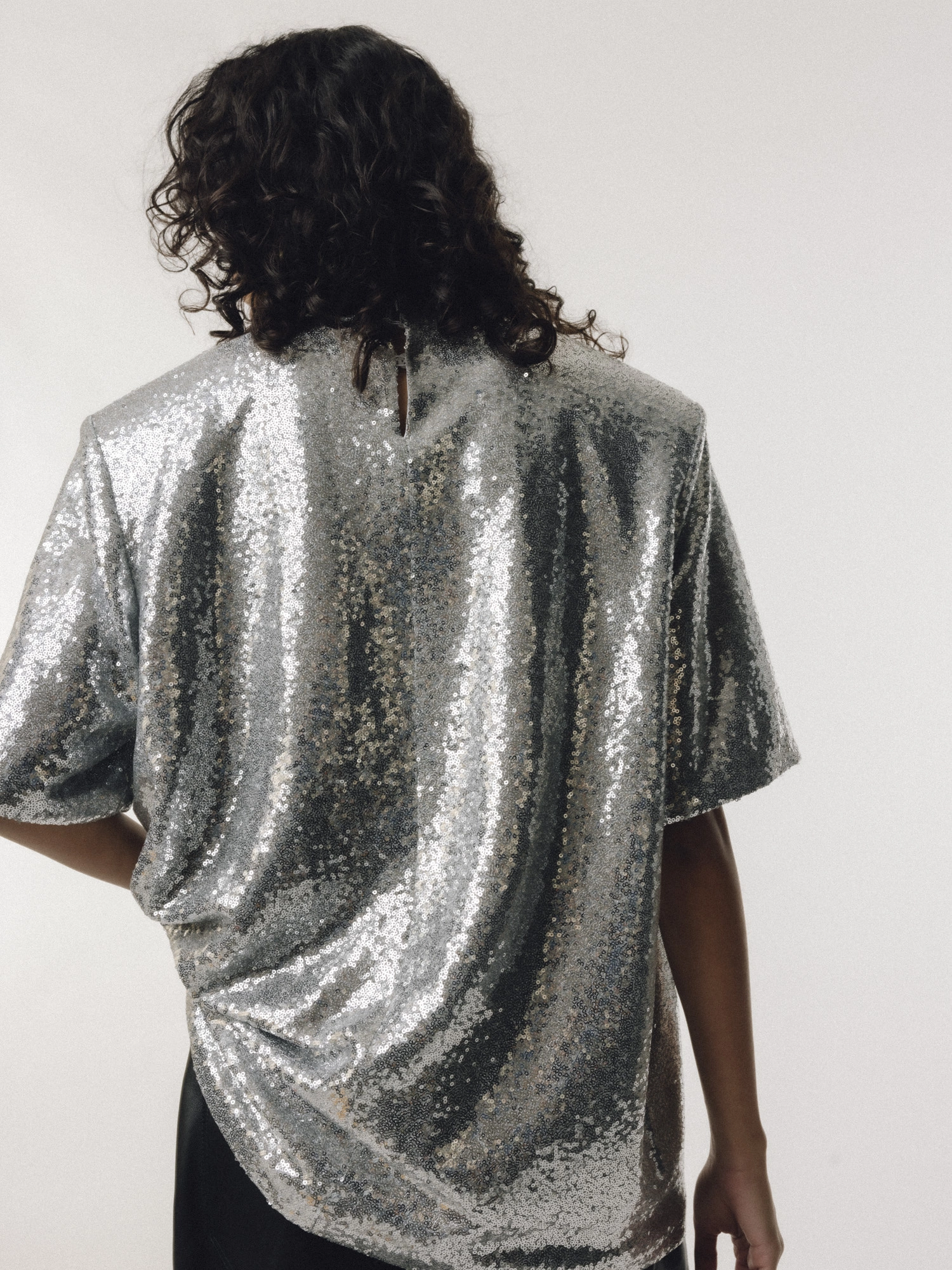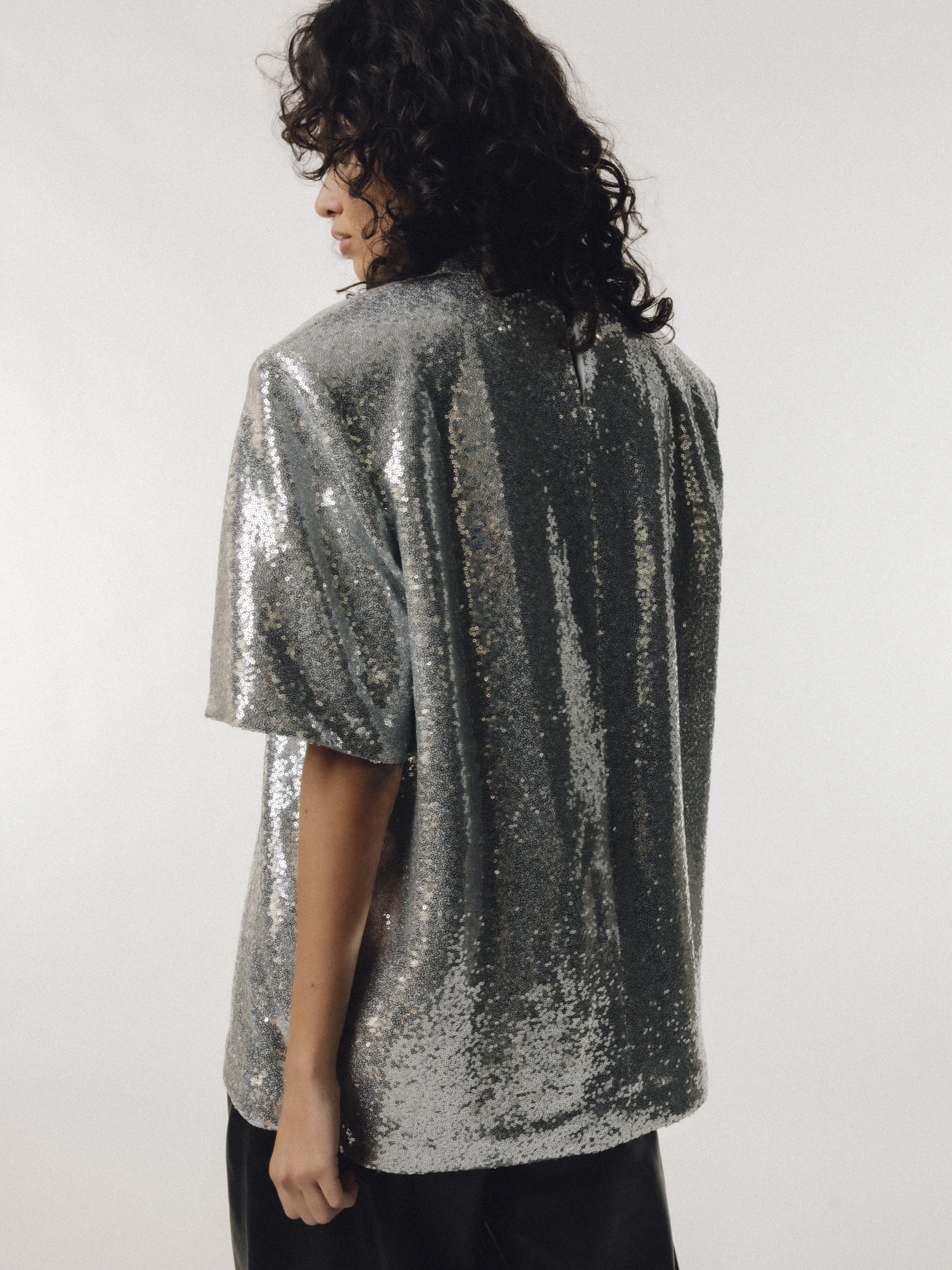 An oversized T-shirt made from soft fabric covered in sequins. It features distinctive elongated sleeves and a stand-up collar fastened with a button at the back. The bold shoulders with detachable pads add an extra fashion-forward twist. This design is perfect for fans of oversized cuts and pairs beautifully with wide jeans, leather pants, or leggings. It's an ideal choice for holiday dinners, evening outings, or New Year's Eve parties—guaranteeing you'll shine in any situation.
