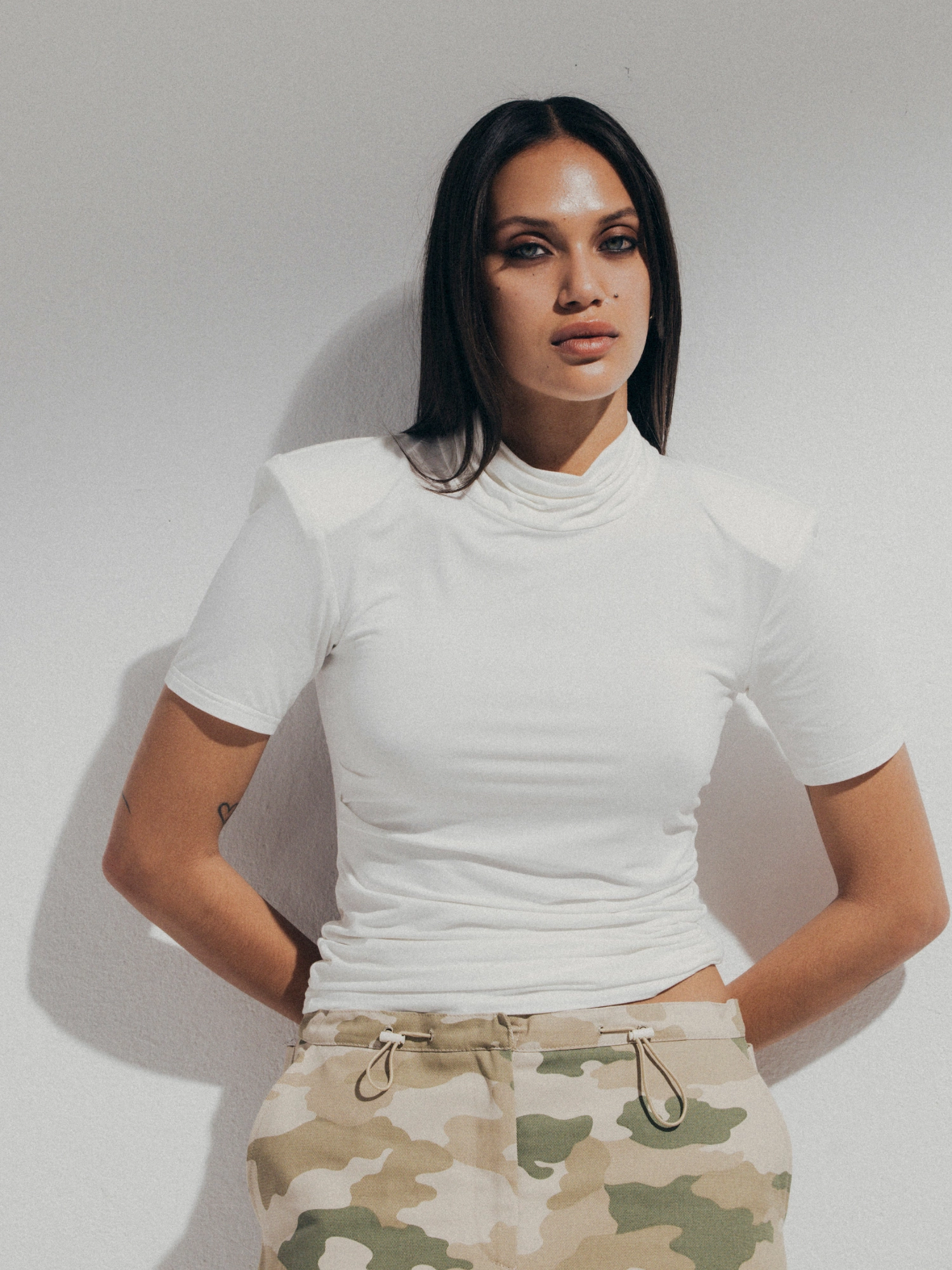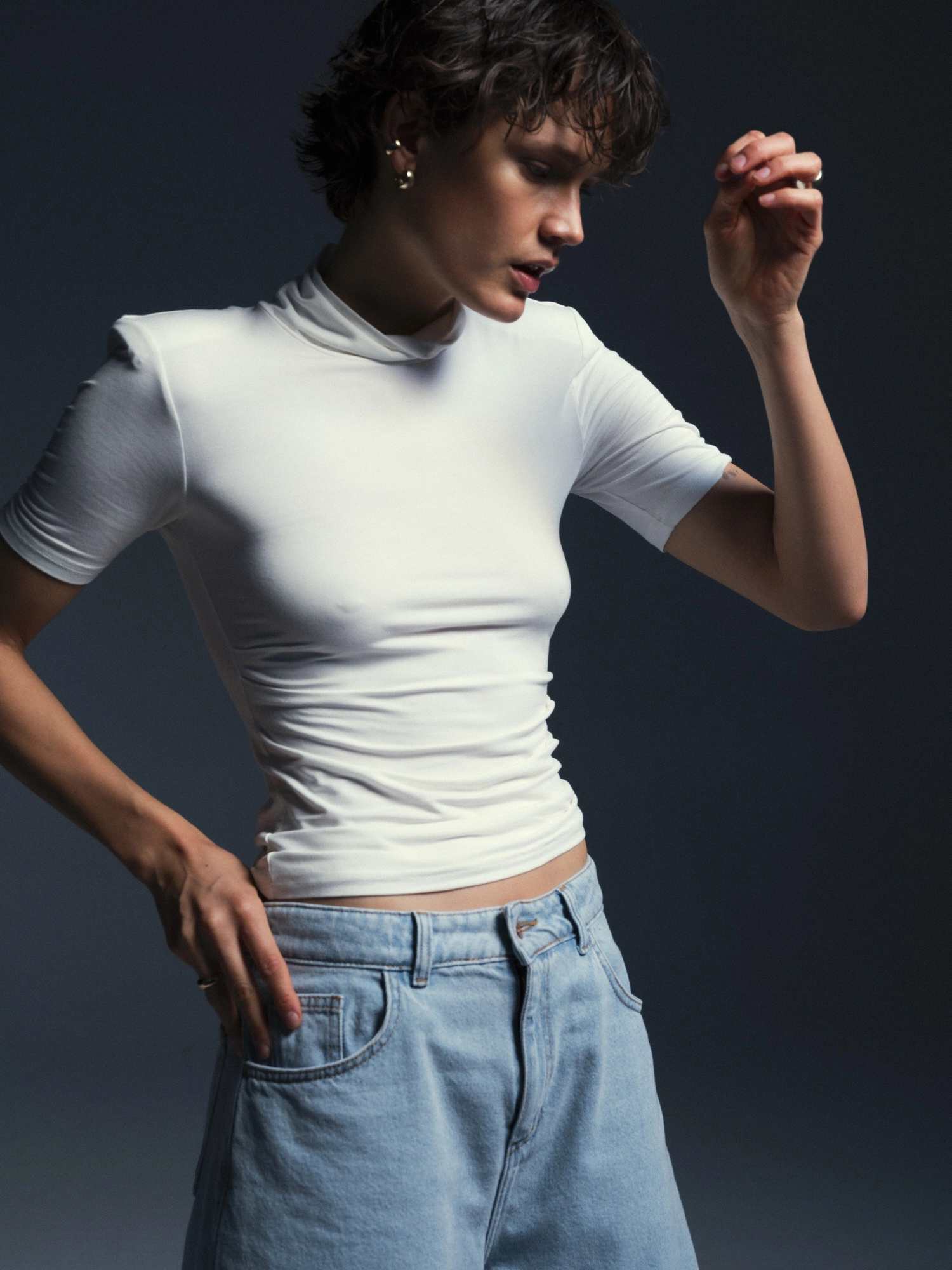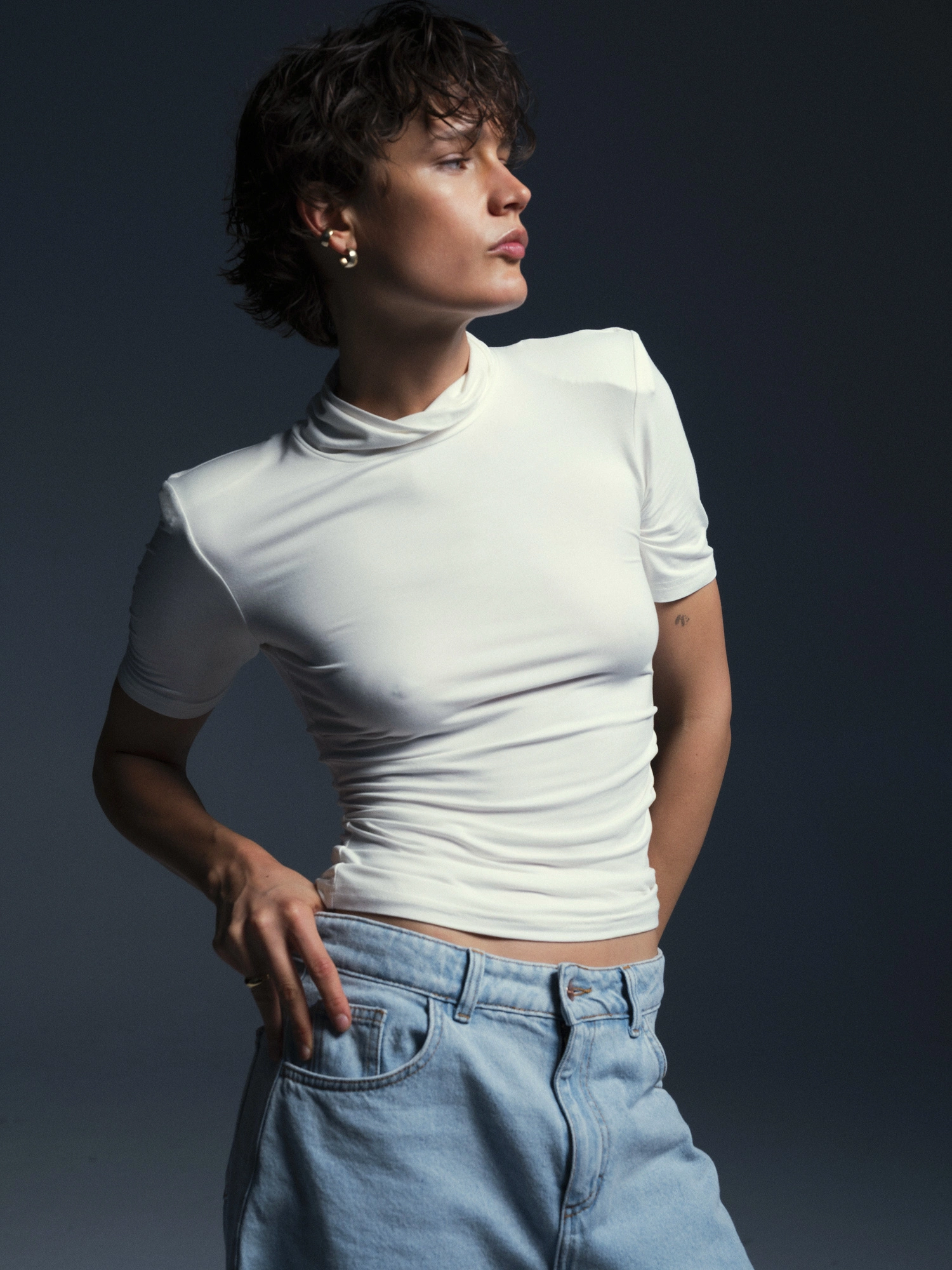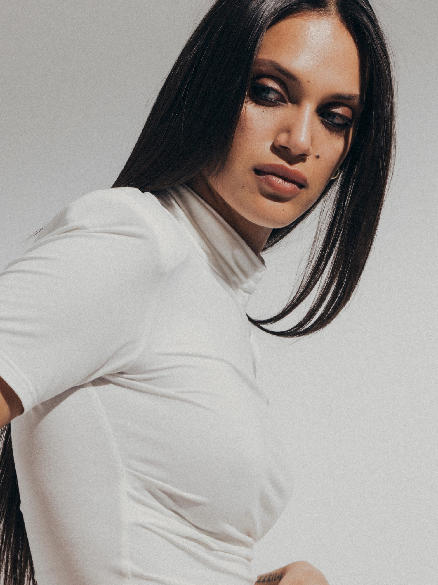 A fitted turtleneck with structured shoulder pads—minimalist in form yet elevated with signature draping at the waist and a bold, sculpted shoulder line. Made from a soft, breathable, and stretchy bamboo-blend fabric, it offers all-day comfort while perfectly adapting to your silhouette.