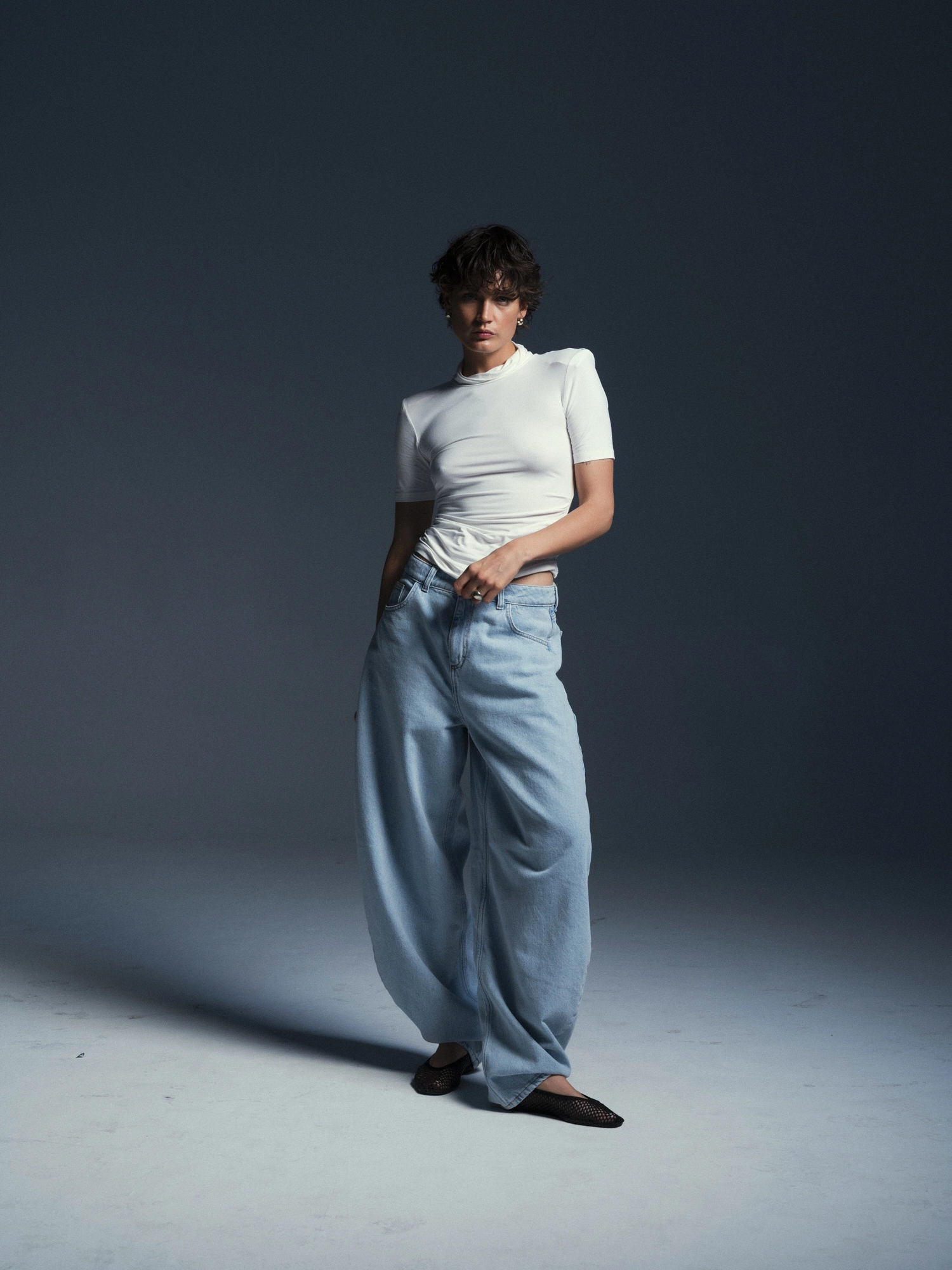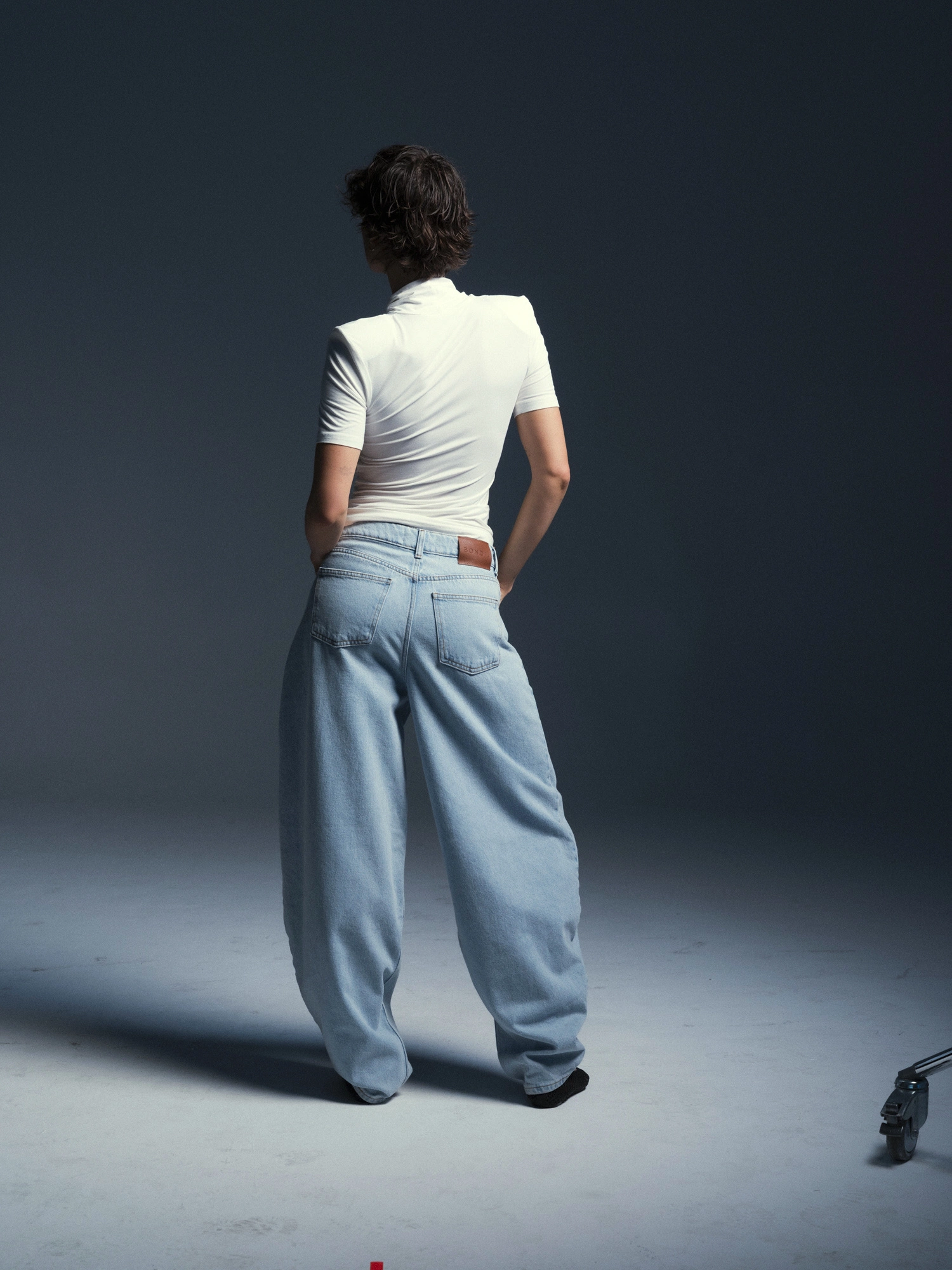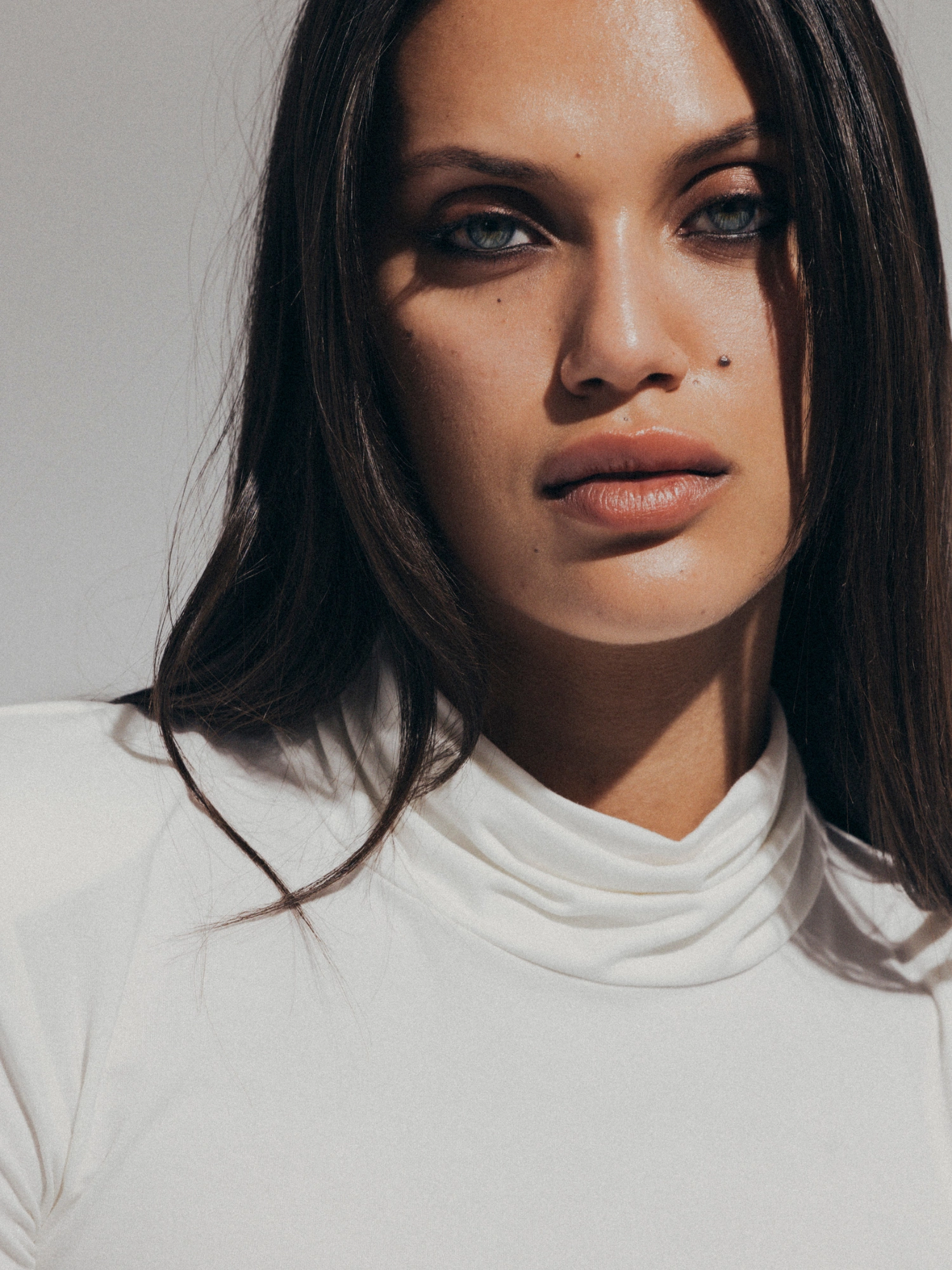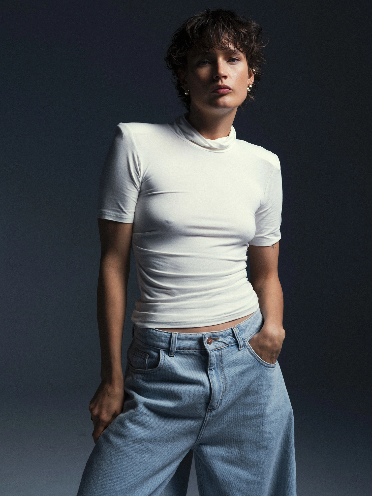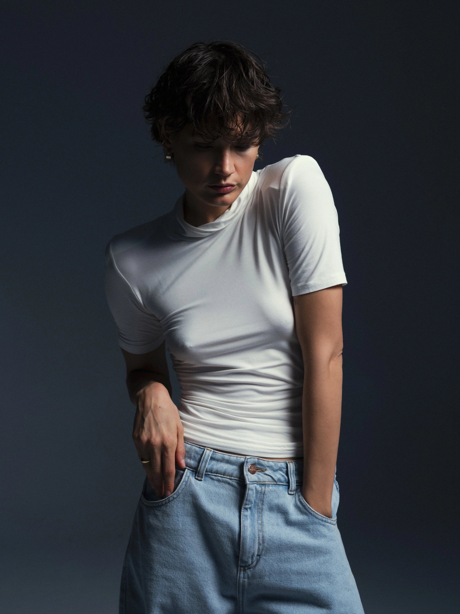 A fitted turtleneck with structured shoulder pads—minimalist in form yet elevated with signature draping at the waist and a bold, sculpted shoulder line. Made from a soft, breathable, and stretchy bamboo-blend fabric, it offers all-day comfort while perfectly adapting to your silhouette.