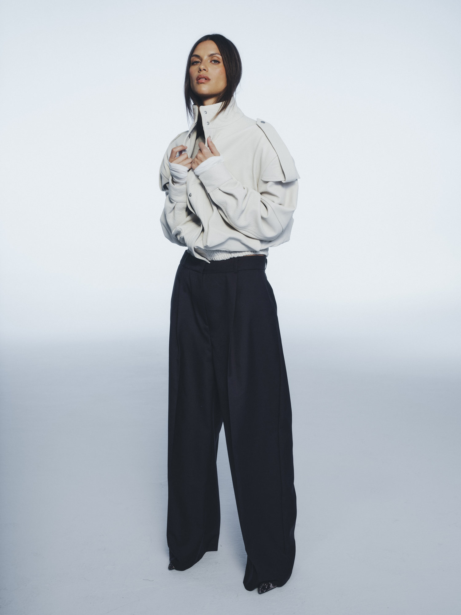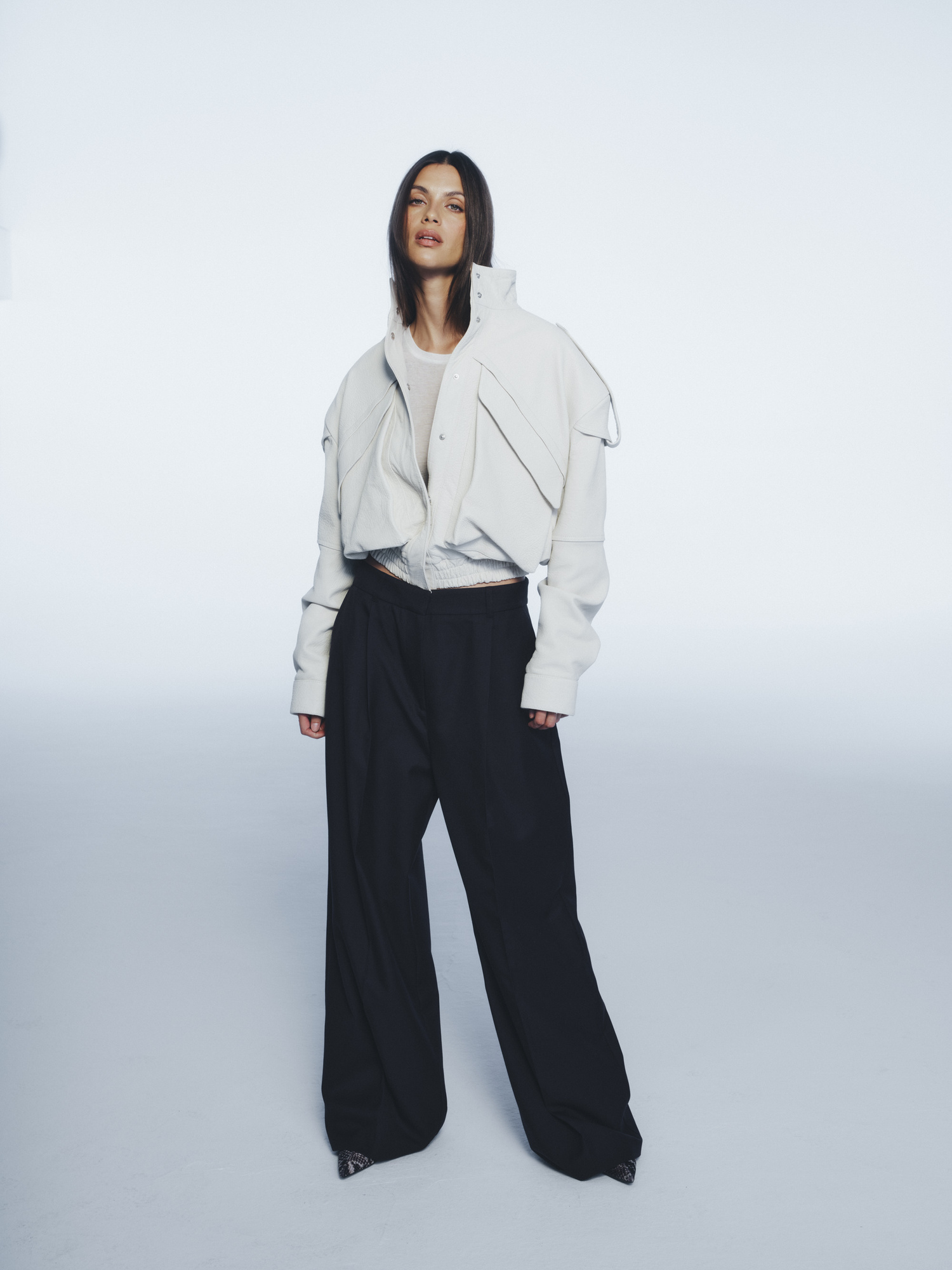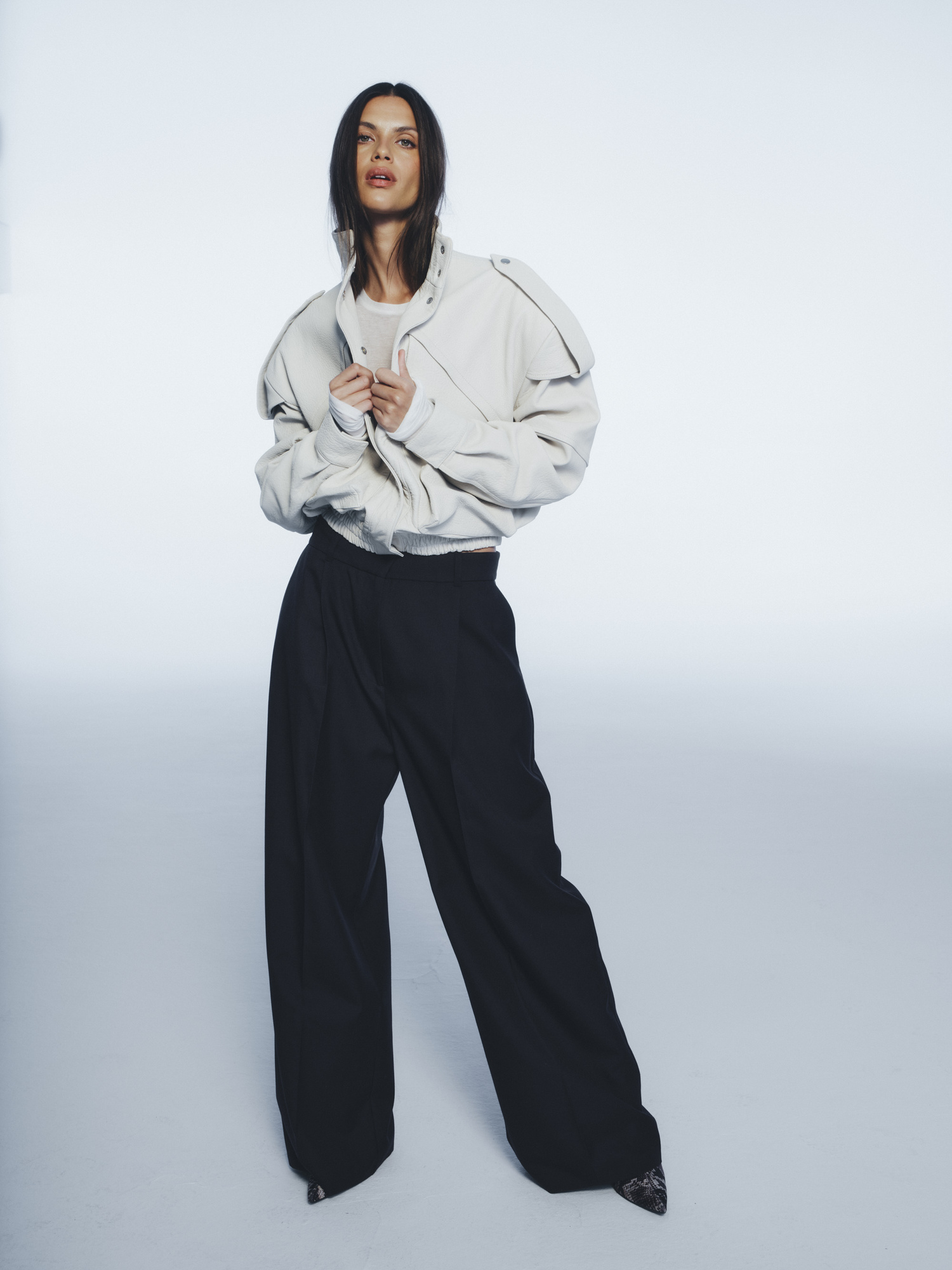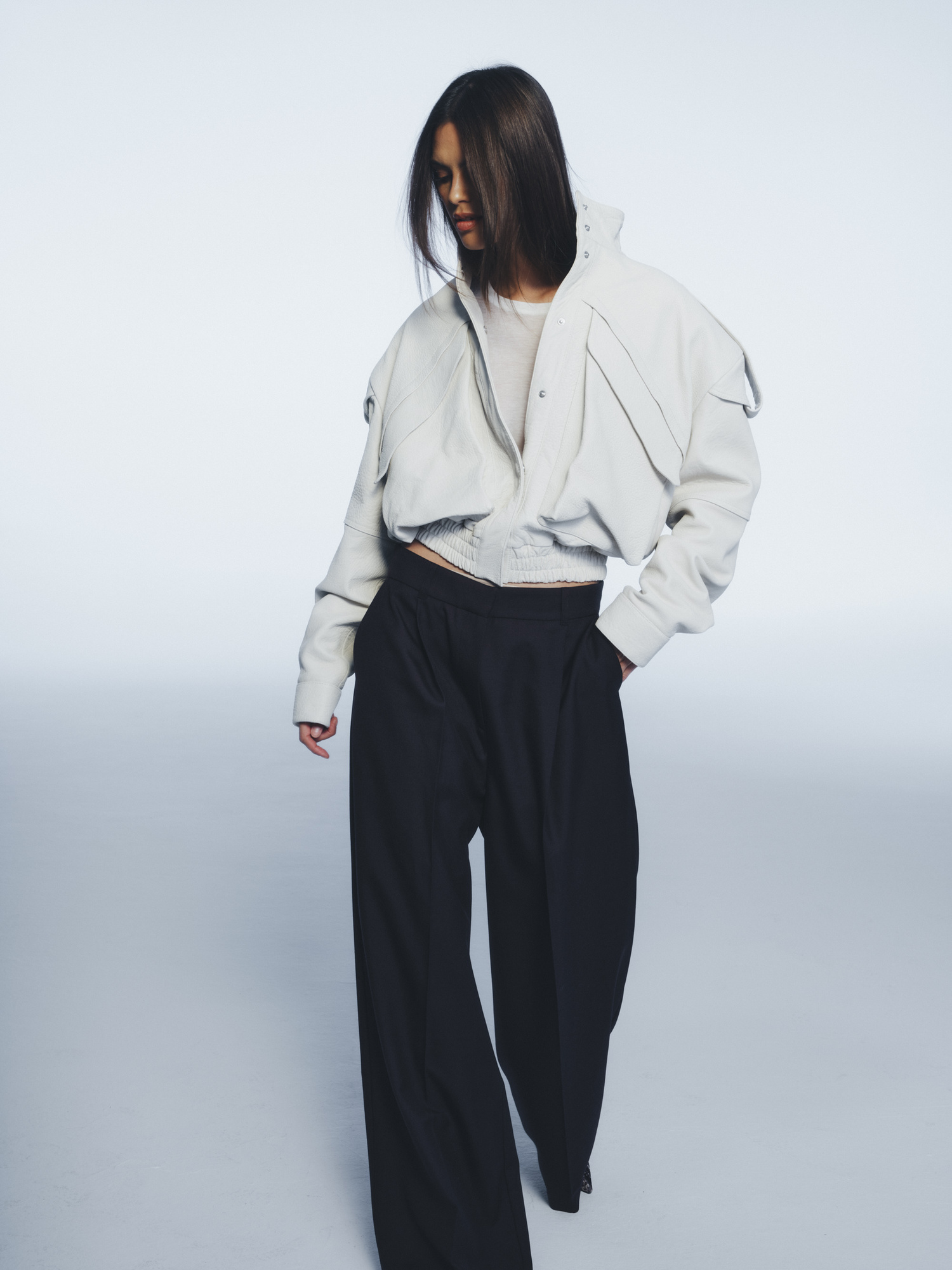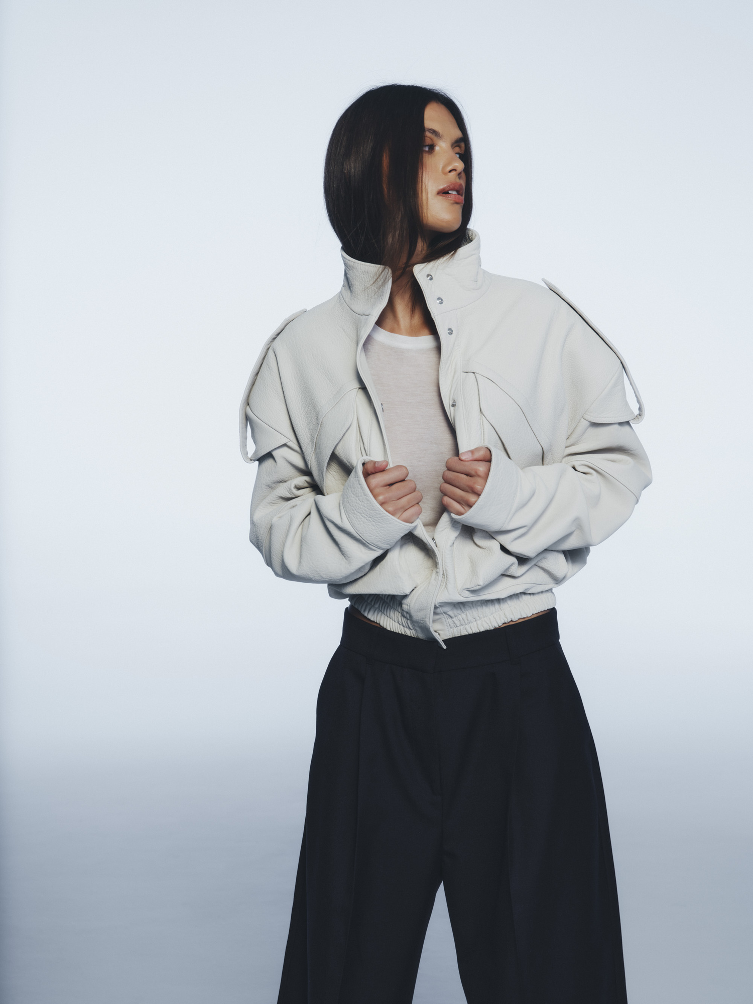 A short jacket made from 100% lamb leather in a beautiful cream shade. Designed in a bomber style, it features a slim waistband, a high collar, and unique details such as epaulettes on the shoulders, large front pockets, decorative stitching, and a distinctive texture. It fastens with snap buttons. This jacket combines stylish nonchalance with a sporty vibe, so wear it however you like—casually with jeans or dressed up with tailored trousers and a shirt. It's a timeless piece that, with proper care, will serve you for years to come.