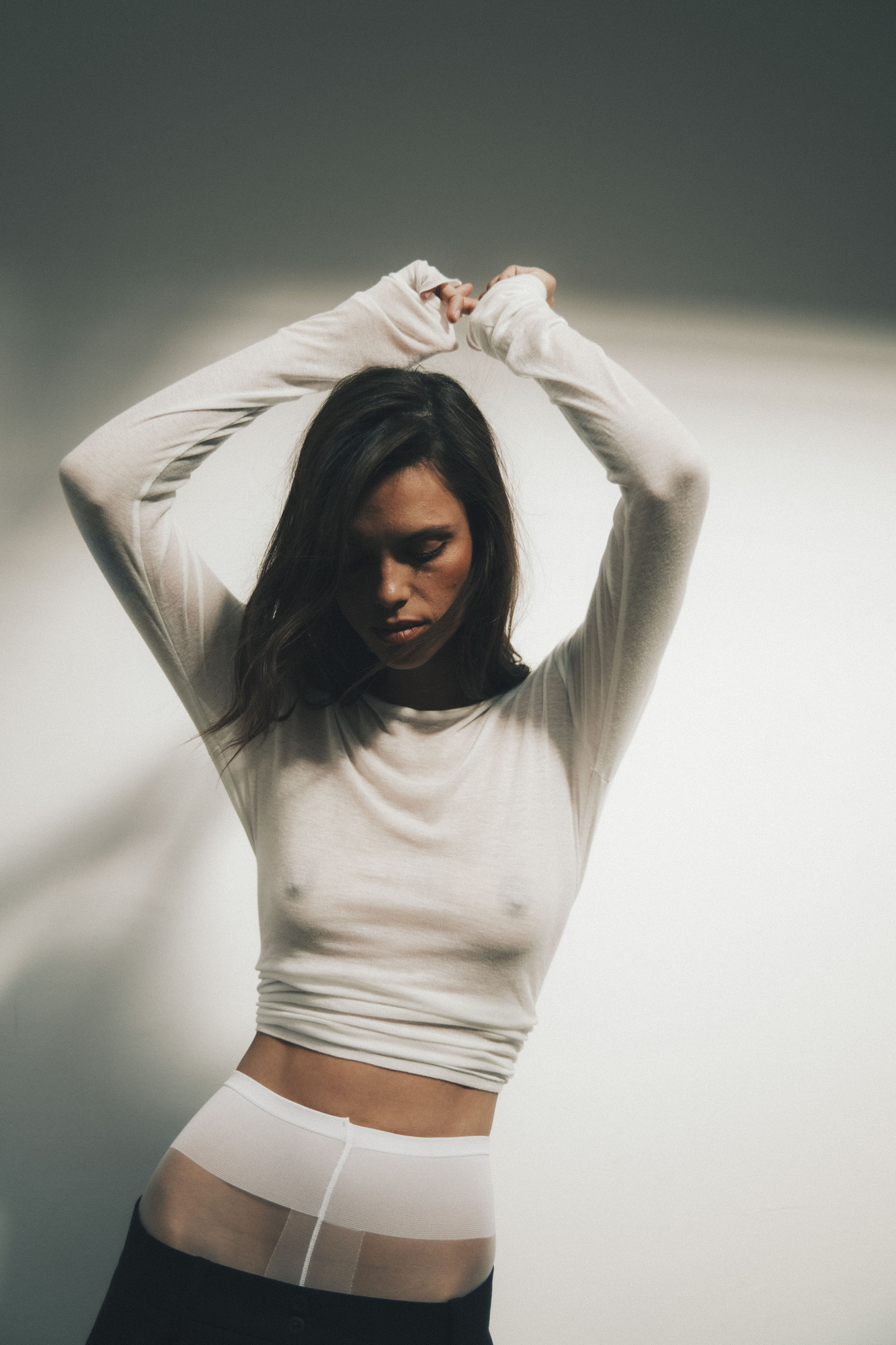 A fitted long-sleeve shirt made from a light blend of viscose and cotton with added elastane. Its minimalist design gives it a modern feel, while the slightly transparent fabric adds a bold yet subtle touch. Perfect for wearing on its own with smooth lingerie or as a base for layered outfits – under an oversized blazer, a leather jacket, or a casual shirt.