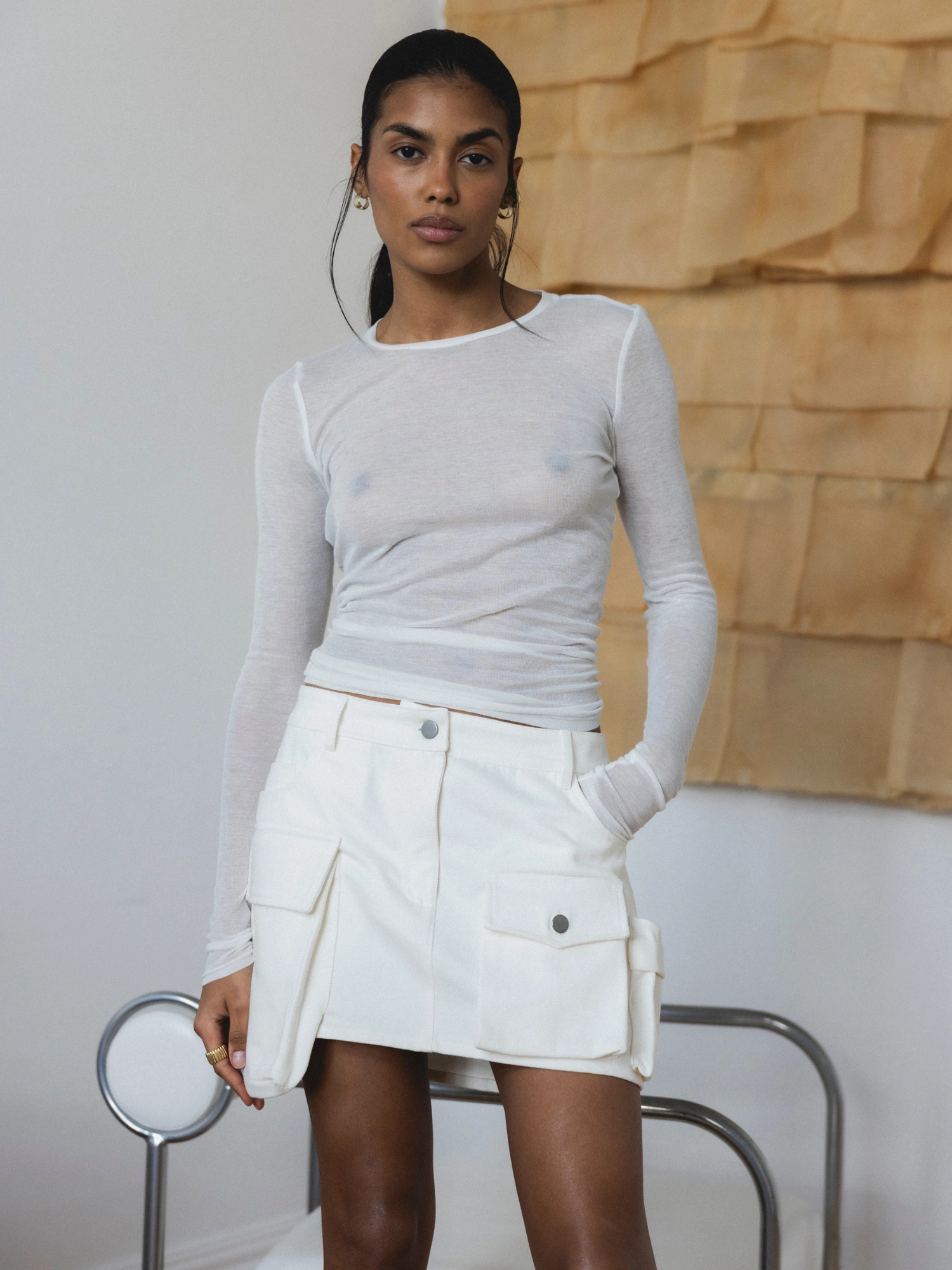 A mini skirt with a military-inspired design and a modern streetwear twist. Made from a high-quality blend of organic cotton, recycled cotton, and organic hemp, it fuses rugged cargo style with a feminine silhouette. The fitted cut accentuates the figure, while large flap pockets add functionality, utility, and bold character.