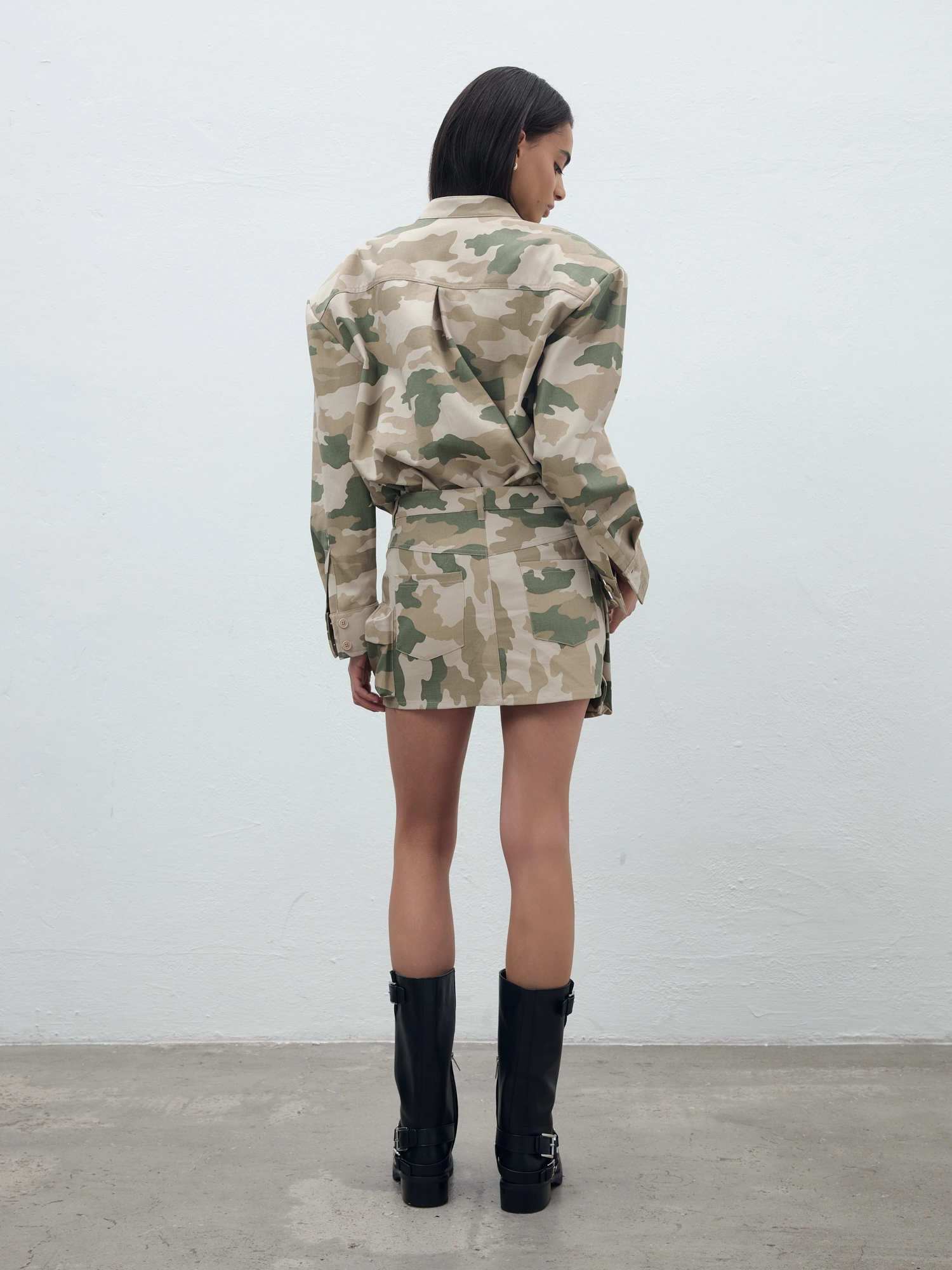 A mini skirt with a military-inspired aesthetic and a modern streetwear twist. Made from high-quality cotton in a classic camouflage pattern, it blends the rugged cargo style with a feminine silhouette. The fitted cut accentuates the figure, while large flap pockets add a functional, utilitarian edge and bold character.