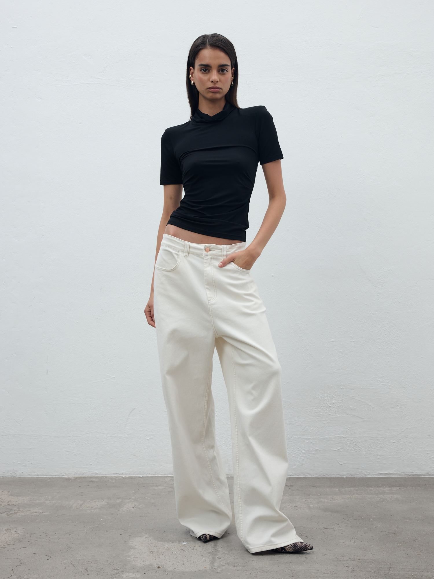 Cotton pants with a straight leg and a relaxed, low-rise fit. The fabric is soft and comfortable to wear, and an added bonus is the adjustable waistband with internal elastic bands, allowing for a perfect fit to your body shape. A timeless wardrobe staple, they work just as well for casual outfits as they do for more elegant looks.