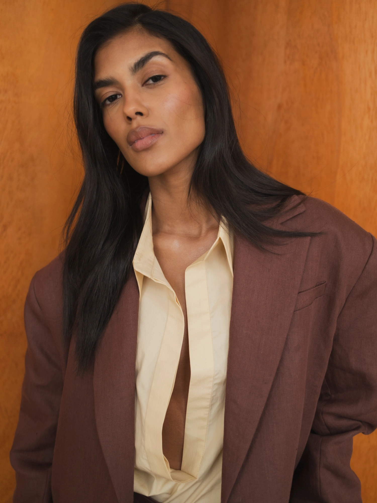 An oversized linen blazer with a straight, menswear-inspired cut. Its matte texture, soft fabric, and rich brown hue bring effortless elegance and timeless appeal to any outfit. Fastened with a single button, it features strong, defined shoulders, classic lapels, and flap pockets. A refined piece that blends formal structure with minimalist, laid-back ease.