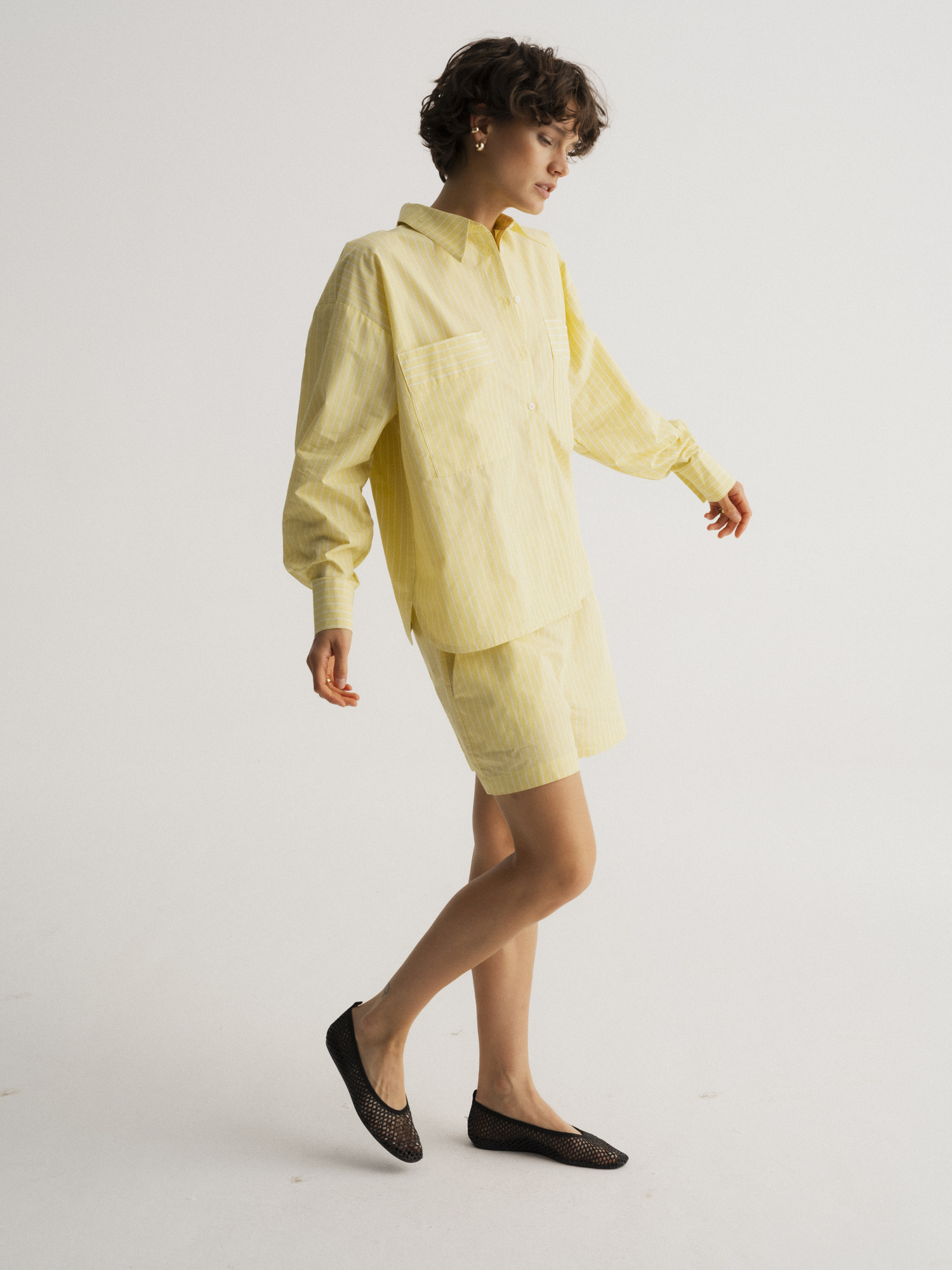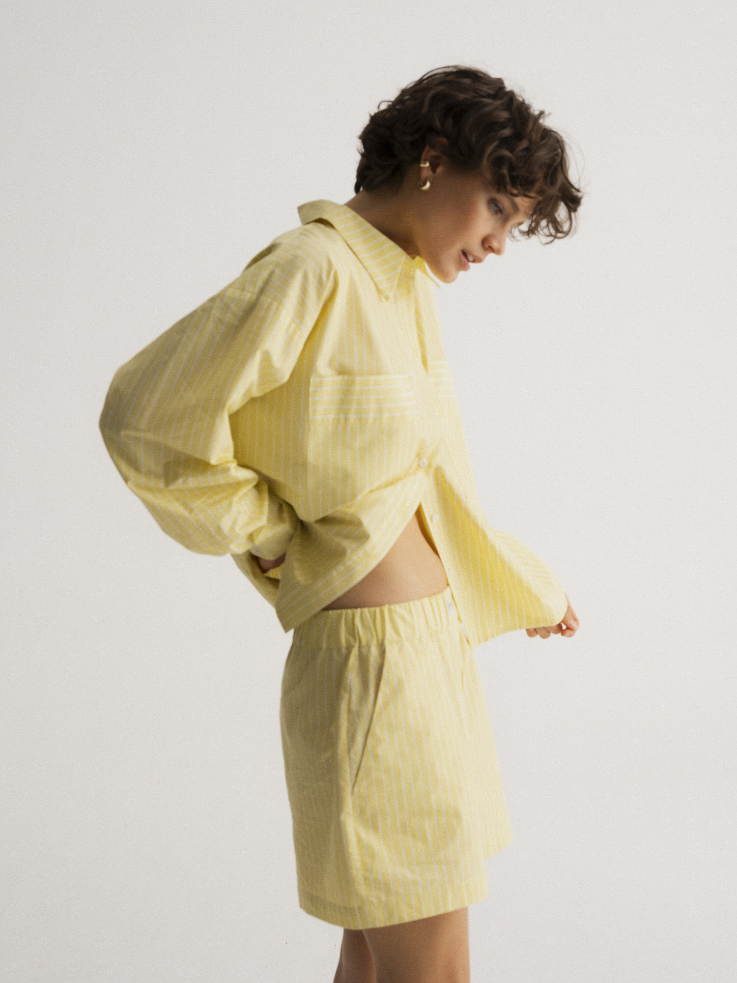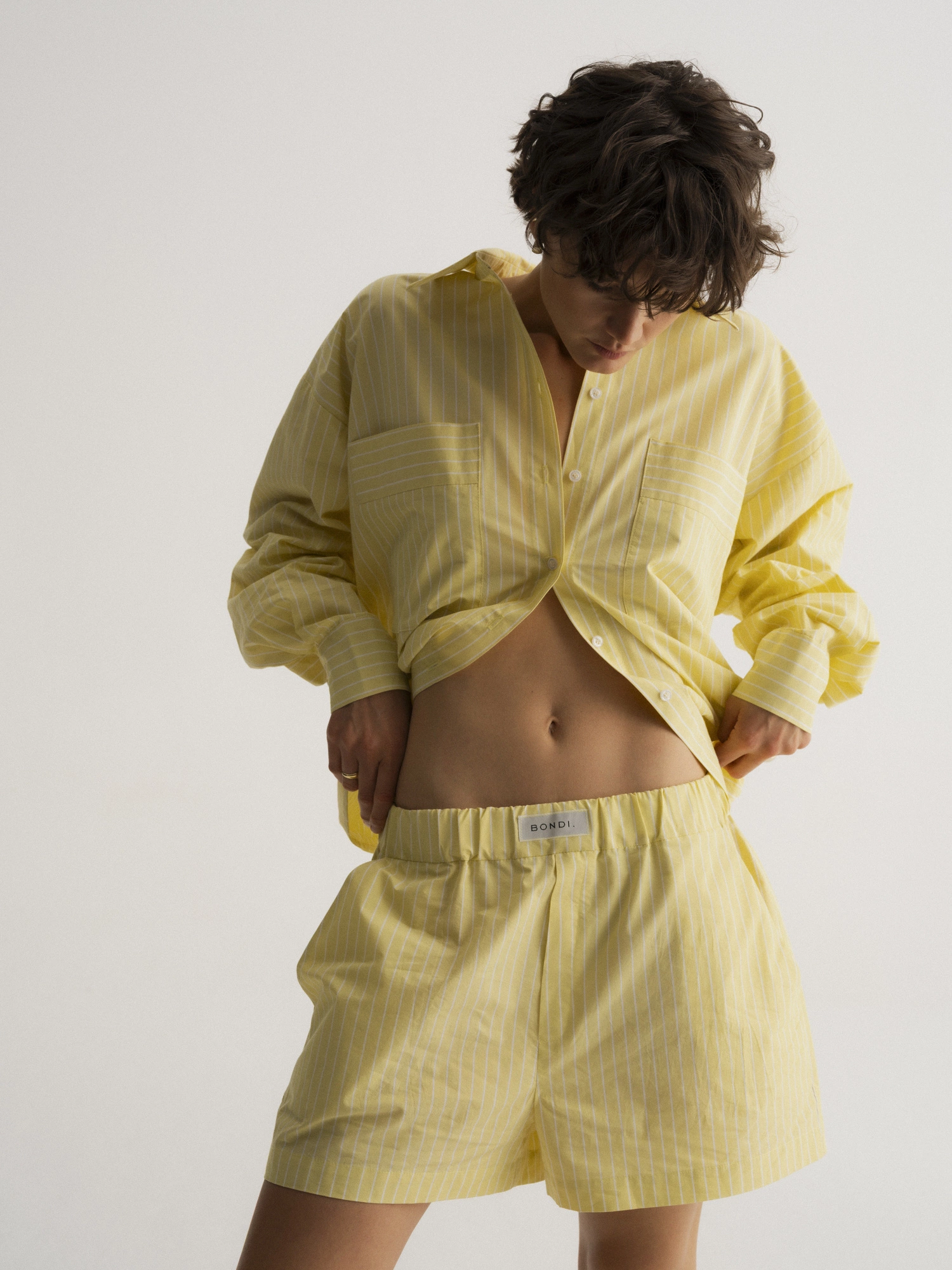 Lightweight shorts made from breathable 100% cotton in a soft pastel shade with a subtle stripe. They feature a relaxed fit, elastic waistband, and side pockets — making them not only stylish but also incredibly comfortable. Inspired by classic men's boxer silhouettes, they bring an effortless, summery vibe. Perfect worn as a set with the matching shirt, thrown over a swimsuit, or paired with a simple top. Ideal for the beach, the city, or just taking it easy — wherever comfort is key.