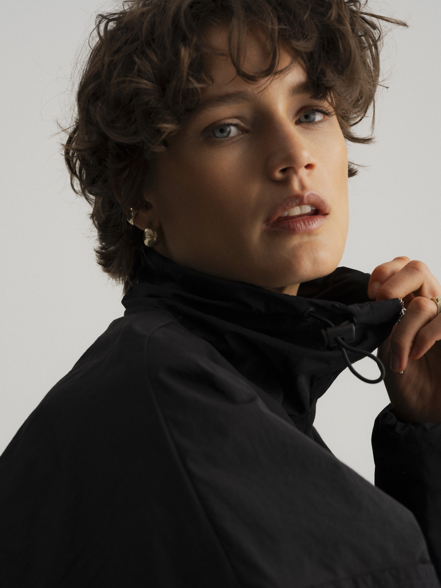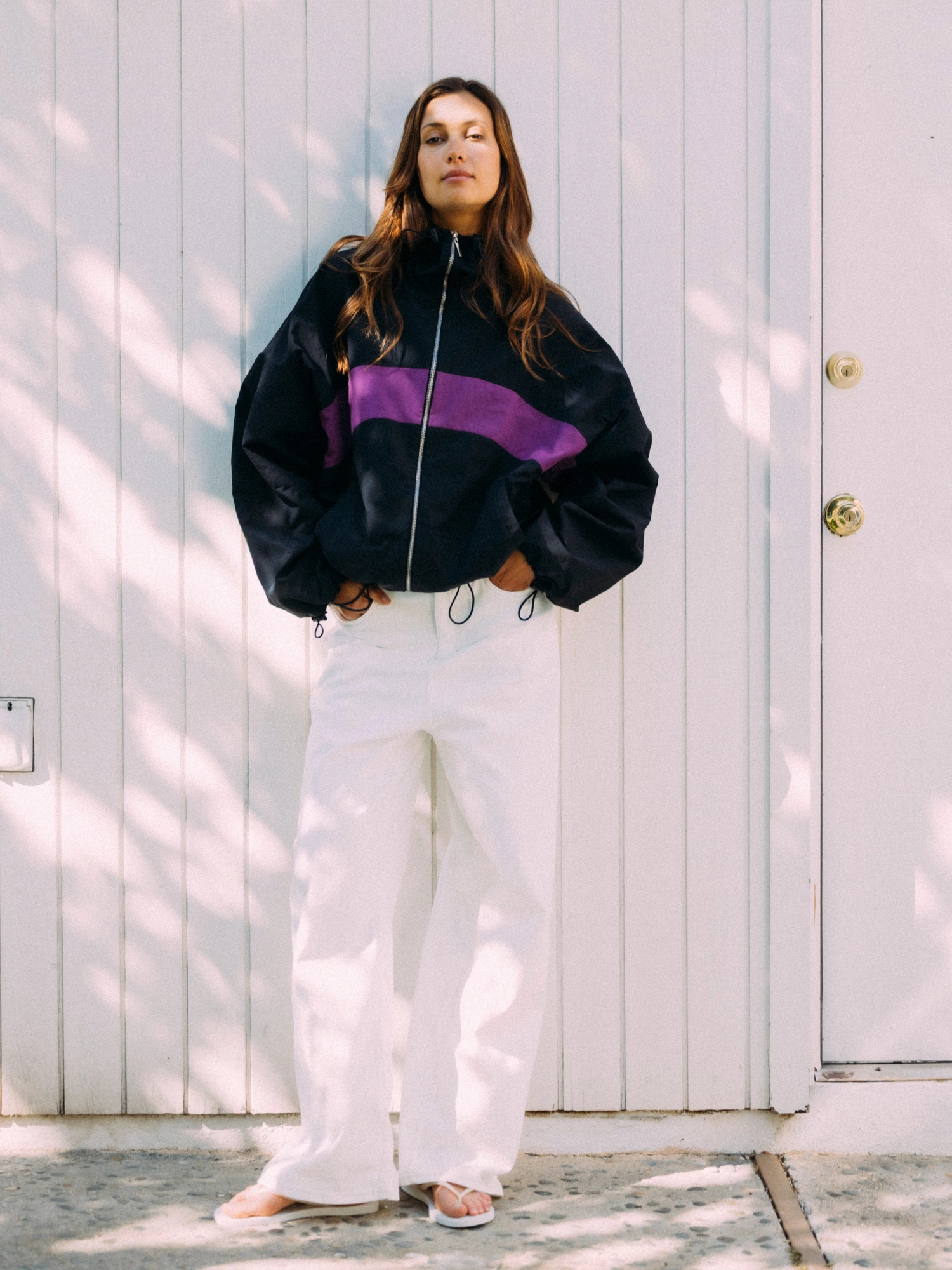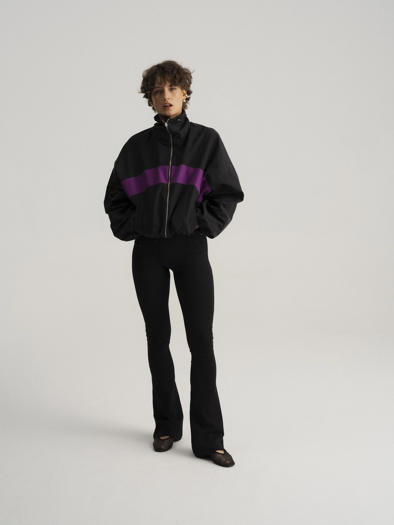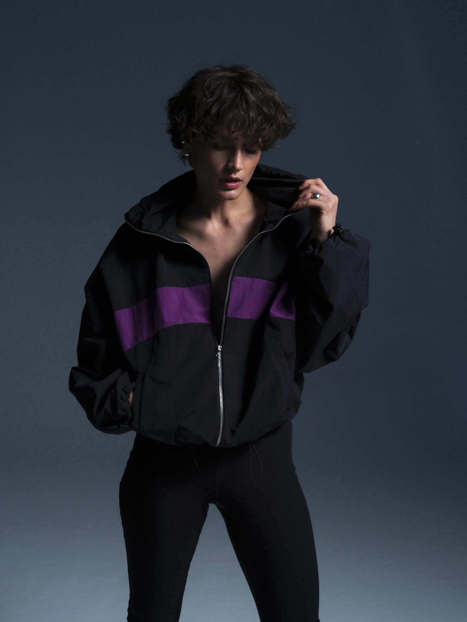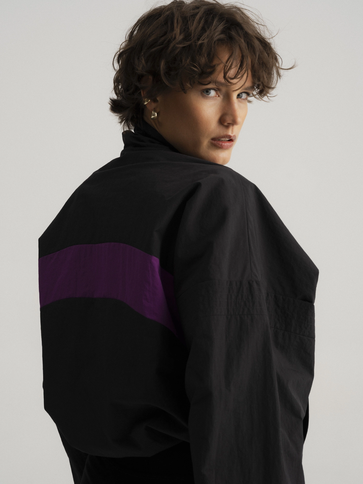 Lightweight windbreaker jacket with a relaxed, slightly oversized fit, made from 100% nylon. The fabric is wind- and moisture-resistant, making it perfect for unpredictable weather. It features a full-length zipper, high collar, and elasticated cuffs and hem for comfort and a snug fit. A bold, contrasting stripe across the chest adds a sporty, retro vibe. Wear it with leggings, jeans, or throw it over a top and shorts — a versatile piece for active days in the city or beyond.