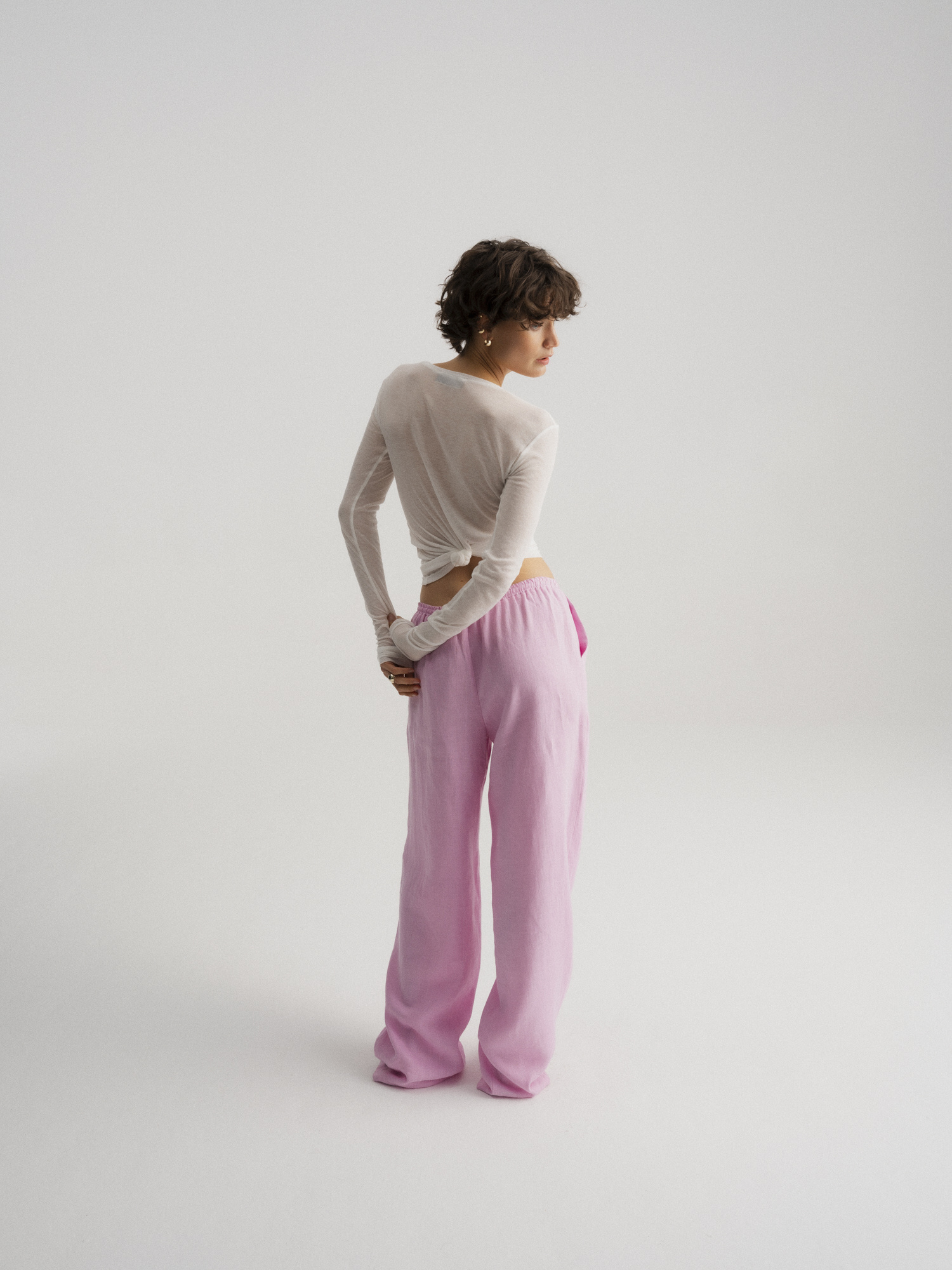 Relaxed, easy-fit trousers crafted from breathable linen in an energetic pink shade. The elasticated waistband with an adjustable drawstring ensures all-day comfort and a flexible fit, while practical side pockets add everyday functionality. The long, wide legs flow effortlessly with movement, giving the silhouette an airy, laid-back feel. Perfect for both urban and vacation-ready summer looks, paired with a fitted top and flip-flops. Style them with other pieces from the collection to create a harmonious, minimalist outfit inspired by modern simplicity.