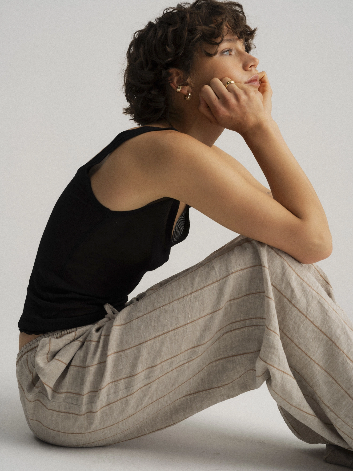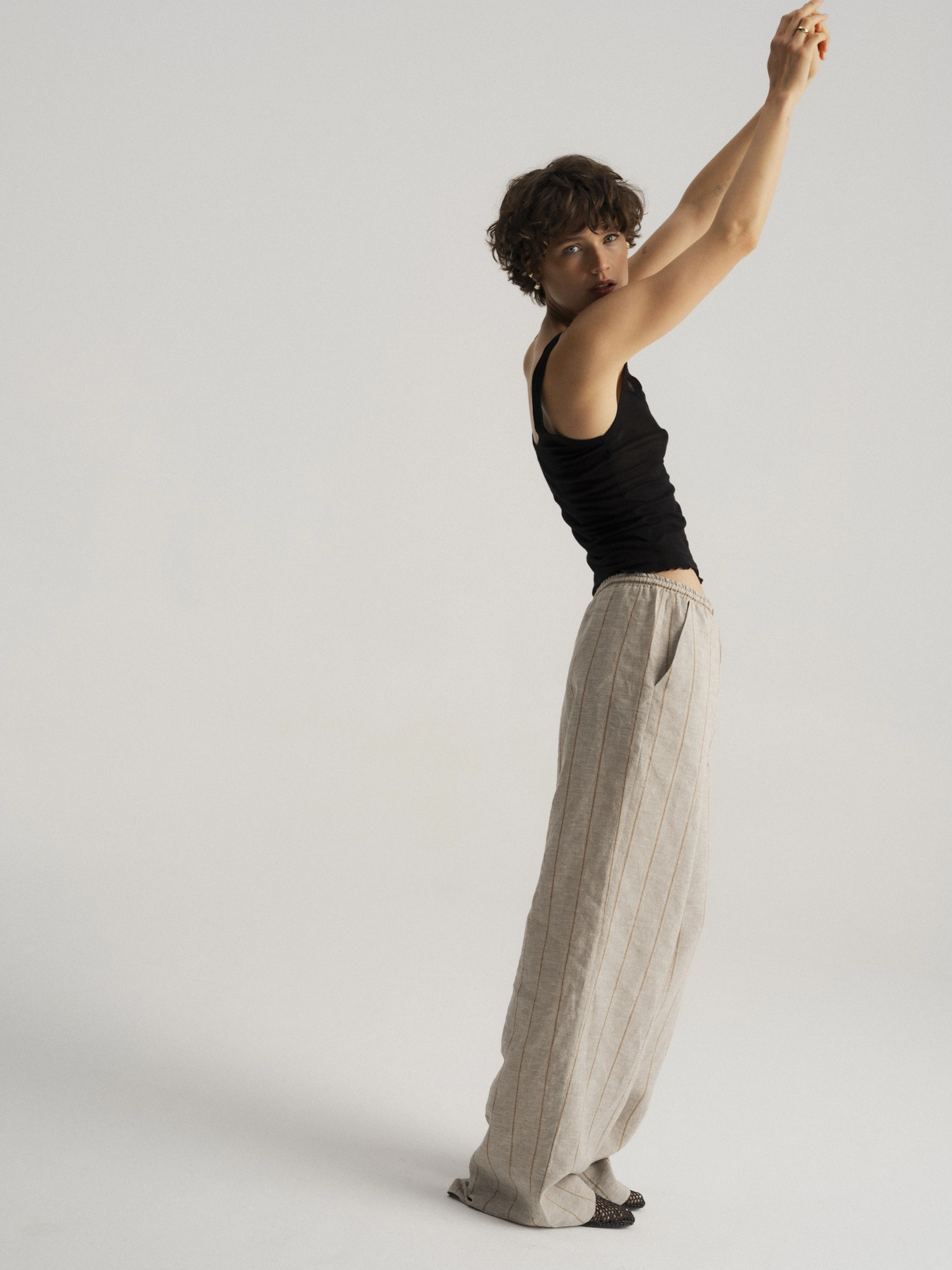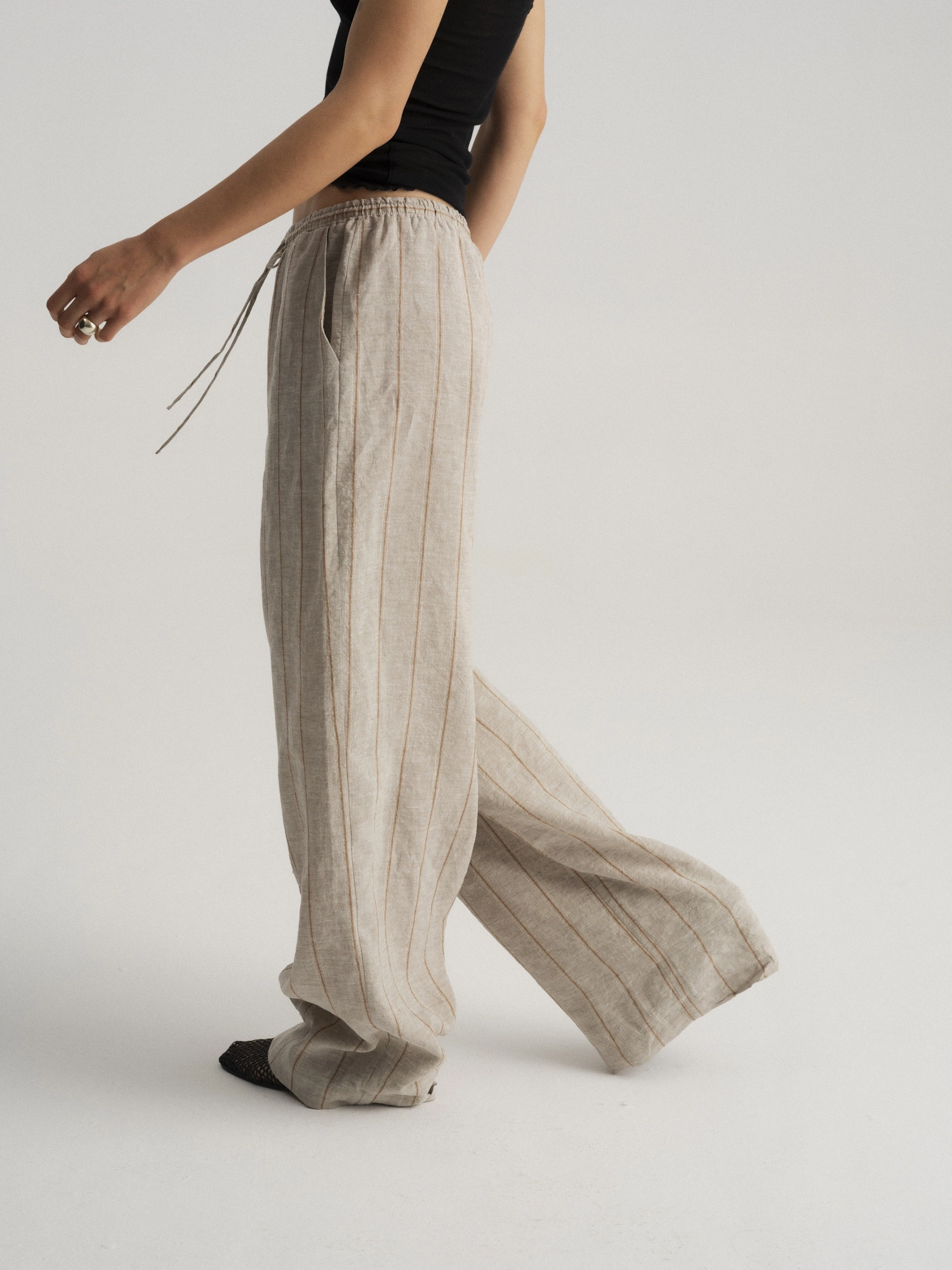 Relaxed, easy-fit trousers crafted from breathable linen in a light grey hue with subtle vertical pinstripes. The elasticated waistband with an adjustable drawstring ensures all-day comfort and a flexible fit, while practical side pockets add everyday functionality. The long, wide legs flow effortlessly with movement, giving the silhouette an airy, laid-back feel. Perfect for both urban and vacation-ready summer looks, paired with a fitted top and flip-flops. Style them with other pieces from the collection to create a harmonious, minimalist outfit inspired by modern simplicity.