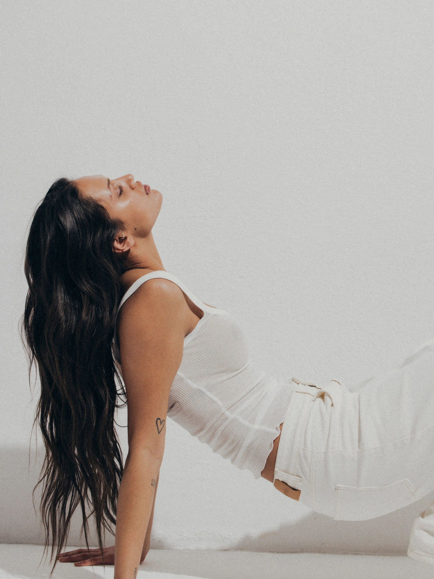 A cropped, sheer tank top crafted from a delicate viscose with a ribbed texture. The fabric offers an ultra-light feel and exceptional comfort, while the minimalist cut enhances its effortless, raw aesthetic with a sensual touch. Designed with thin straps and a deep-cut neckline and back, it exudes understated confidence.