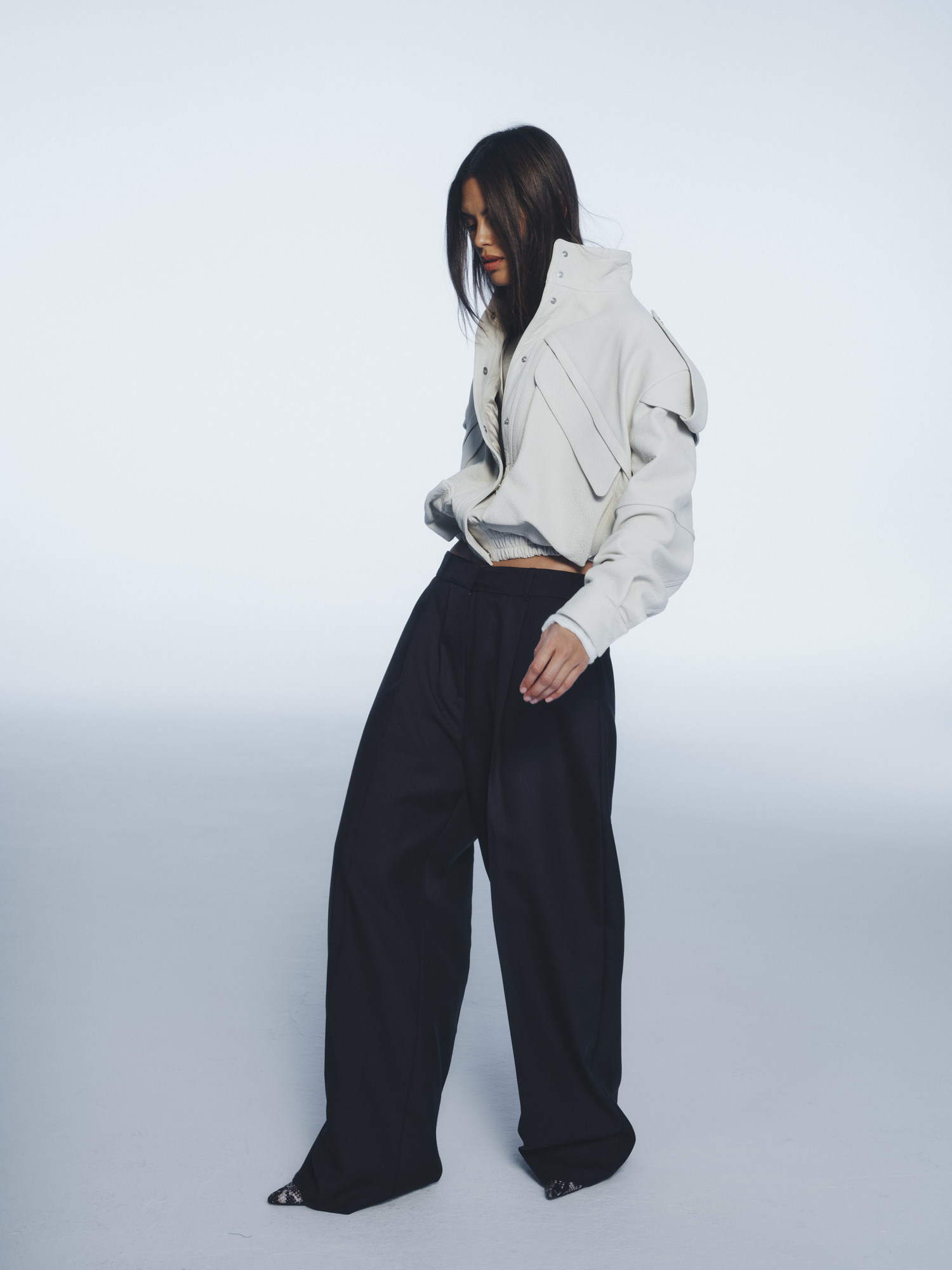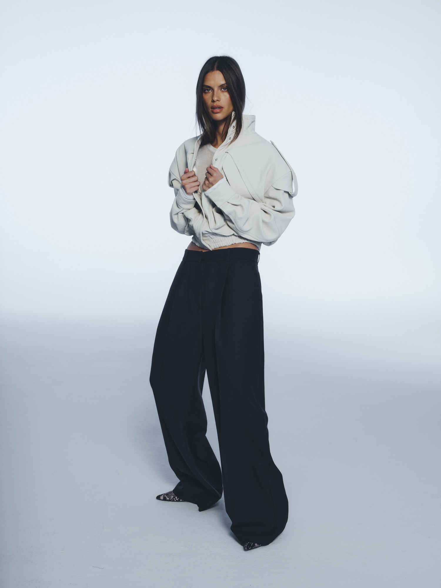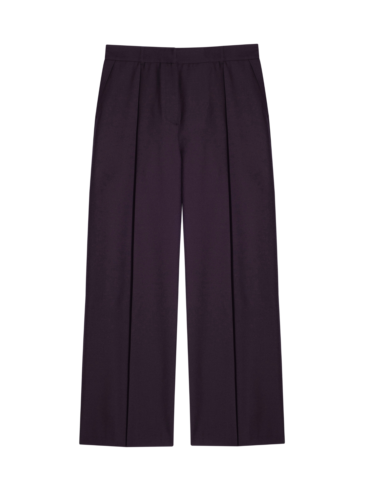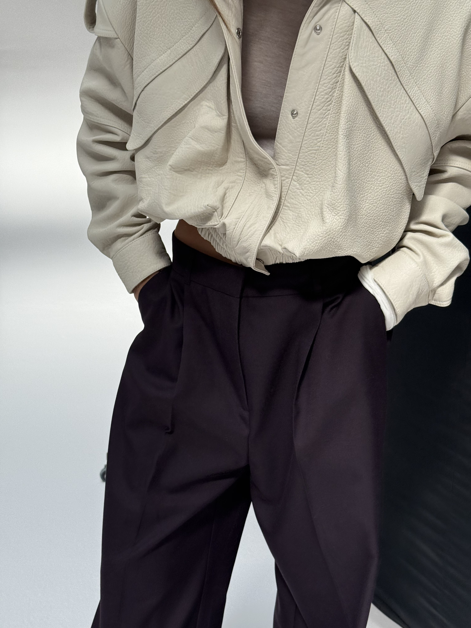 Pleated trousers with a wide, masculine-inspired cut. Made from 100% soft wool in a unique, deep burgundy shade. They feature straight, long legs, two side pockets, and fasten with a zipper and hook. They are sure to be a striking element in any outfit—whether paired with elegant pieces or styled casually with sneakers and a sweatshirt. Combine them with other pieces from the collection to create a minimalist, timeless look that won’t restrict you in any way.