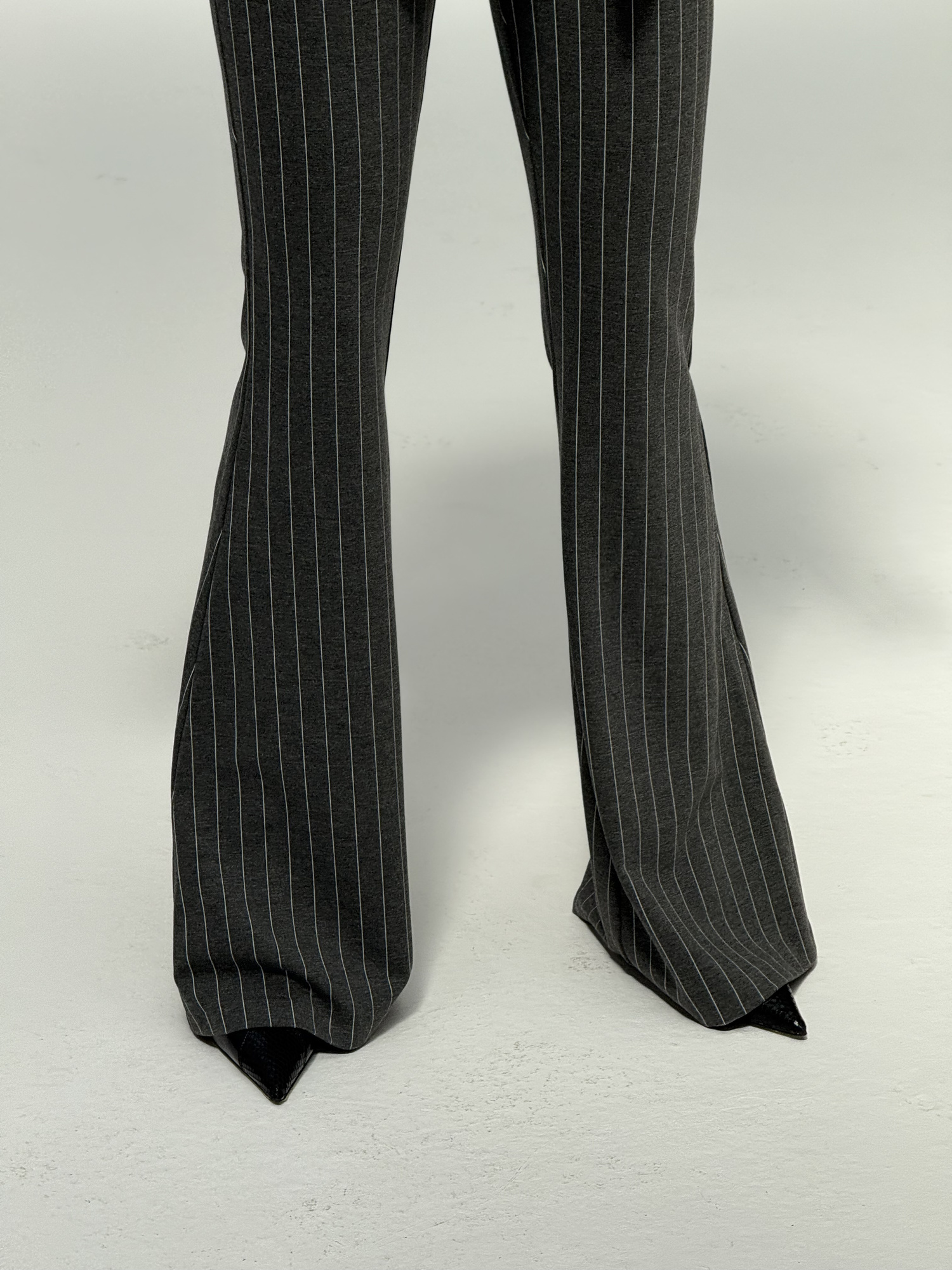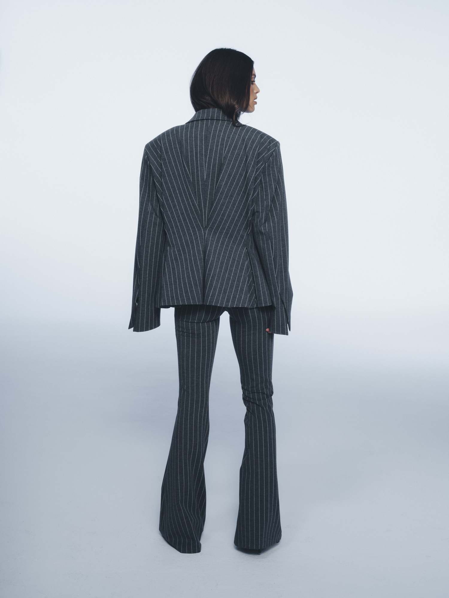 Fitted high-waist trousers fastened with a concealed side zip. They highlight the silhouette at the top and gently flare towards the bottom, creating graceful, feminine proportions. Made from a soft fabric with a subtle pinstripe pattern, they combine timeless elegance with a touch of modernity.