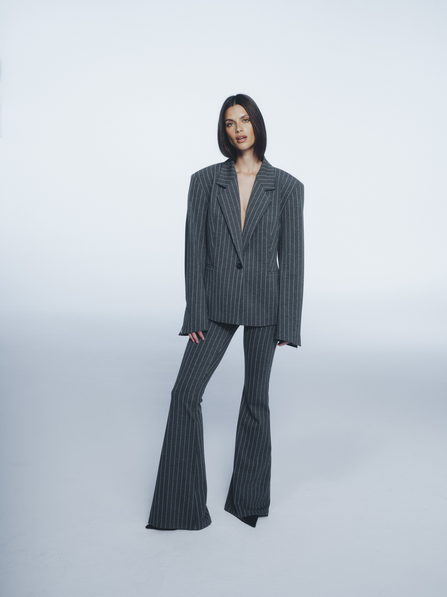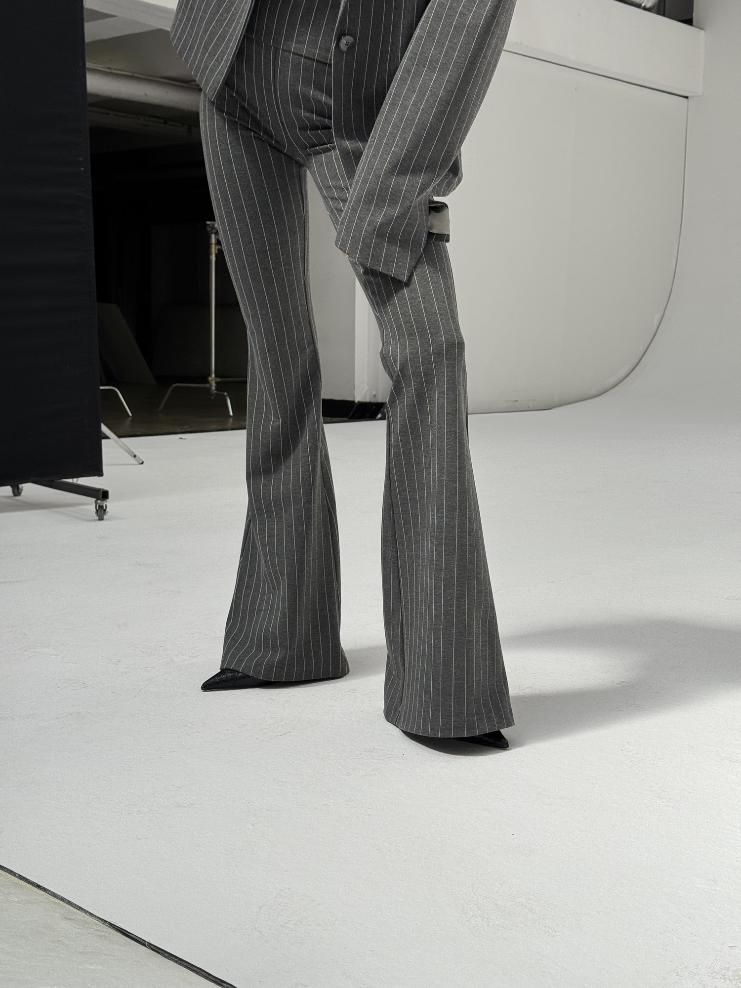 Fitted high-waist trousers fastened with a concealed side zip. They highlight the silhouette at the top and gently flare towards the bottom, creating graceful, feminine proportions. Made from a soft fabric with a subtle pinstripe pattern, they combine timeless elegance with a touch of modernity.