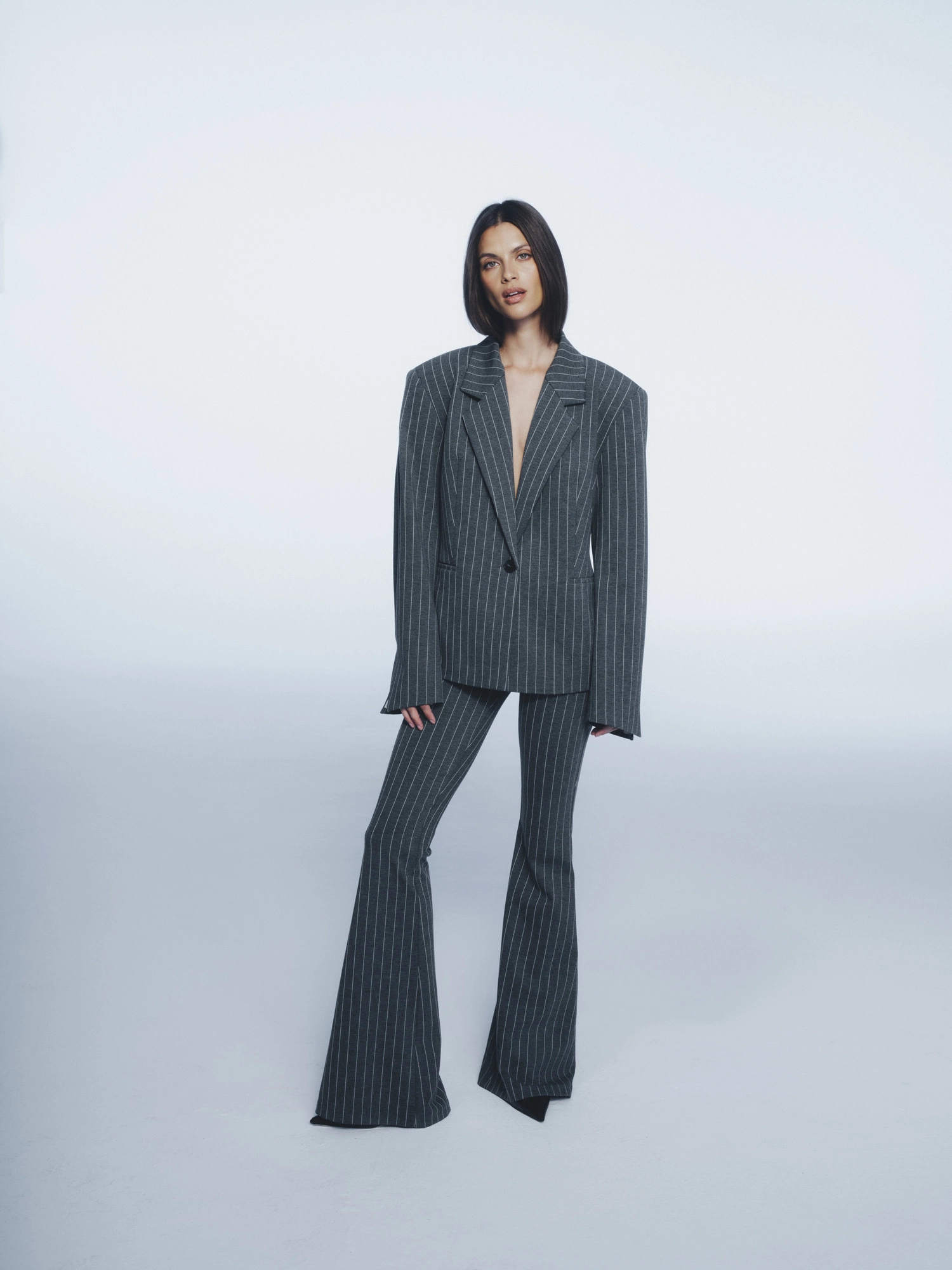 Matching trousers in the same pattern, slightly flared at the hem, complete the set. Paired with jeans, the blazer also works beautifully in a more casual edition.