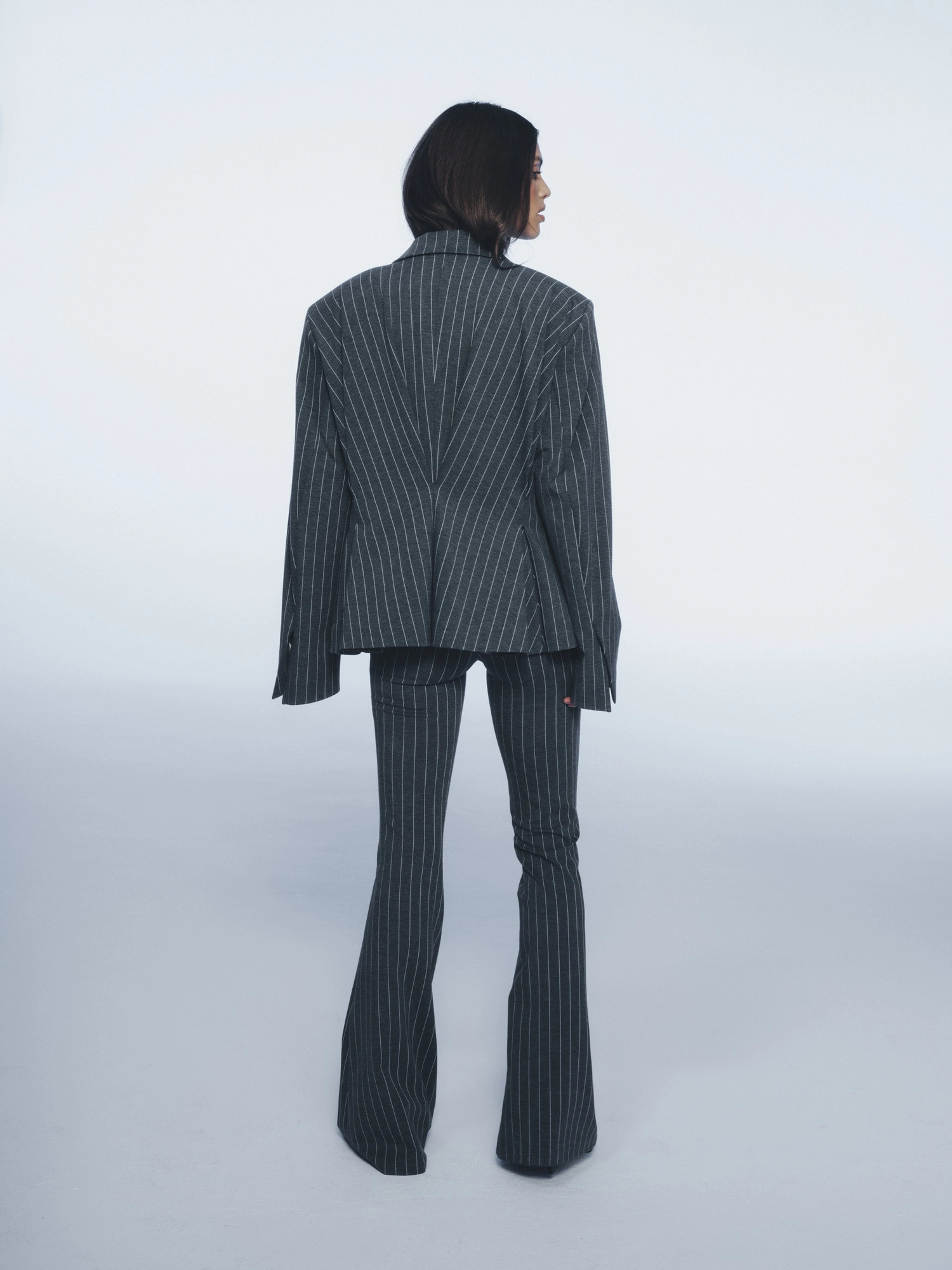 A blazer with a classic, timeless cut, enhanced by a modern detail in the form of pleats at the back. Crafted from a soft fabric in a melange shade of grey with a subtle pinstripe. With its broad shoulders and straight silhouette, it accentuates the figure while creating an elegant yet contemporary look. Perfect for business outfits as well as evening occasions, it strikes a balance between sophistication and laid-back style.