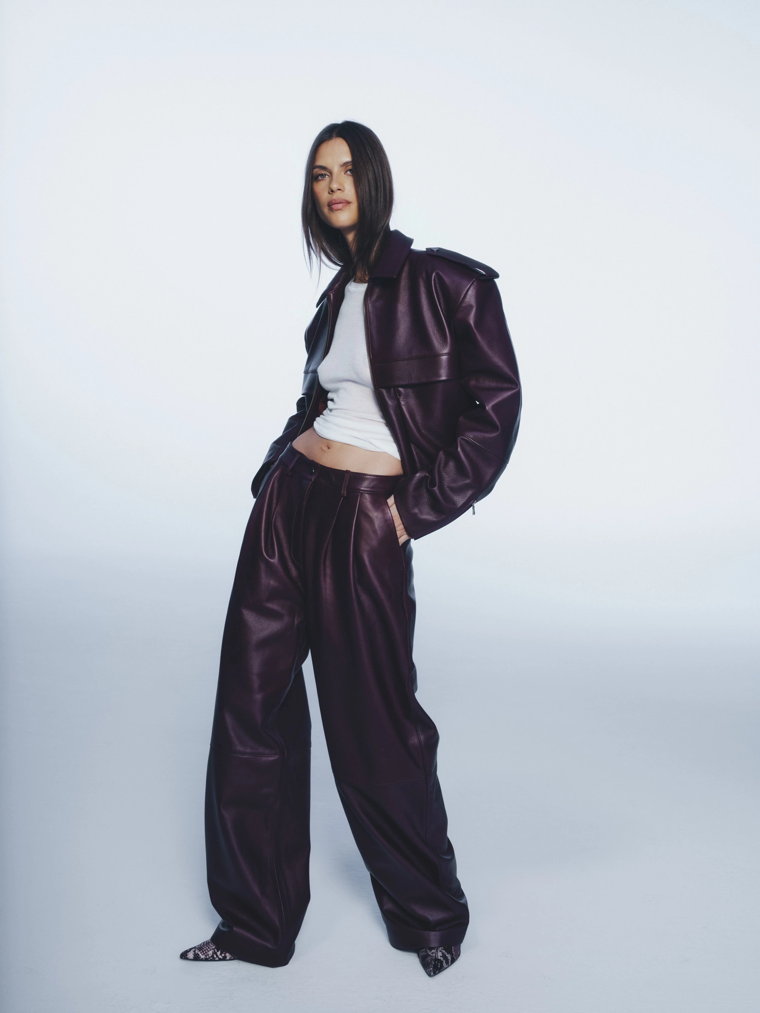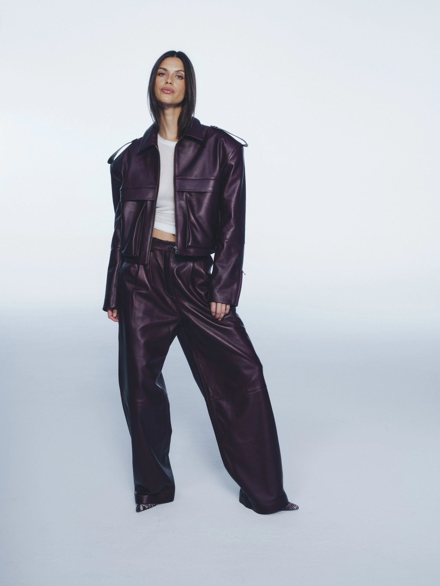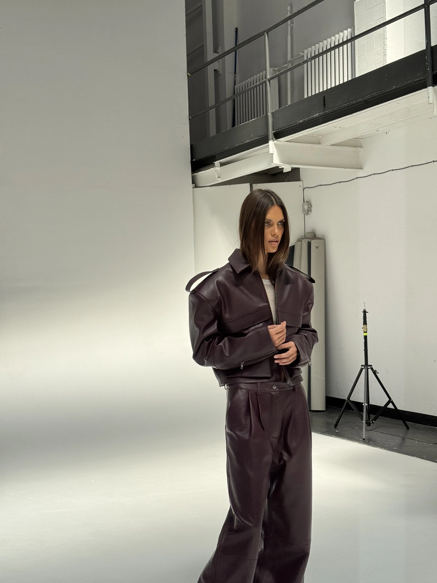 Trousers crafted from high-quality natural leather in a deep burgundy shade. Featuring a wide cut with subtle pleats that add elegance and a light, graceful touch. The thoughtfully designed silhouette flatters the figure while ensuring complete freedom of movement. The premium leather is not only durable but also exceptionally soft to the touch.