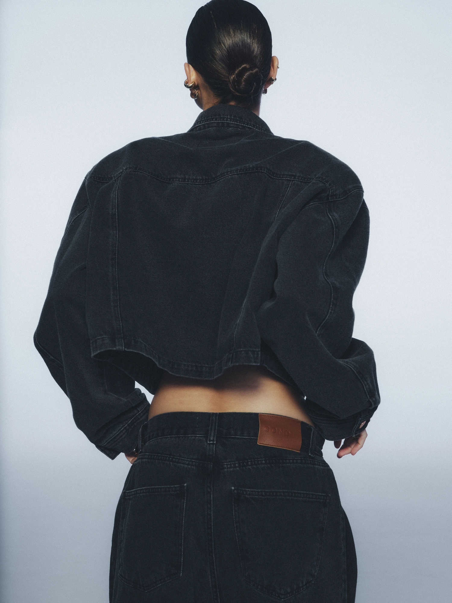 A cropped jacket made from soft denim in a graphite shade with a vintage-inspired washed effect. The classic cut is refreshed with a waist-defining length, while strong, padded shoulders add structure. Finished with branded button closures and two large front pockets. A timeless piece that pairs effortlessly with jeans, shorts, tailored trousers, or even a dress.