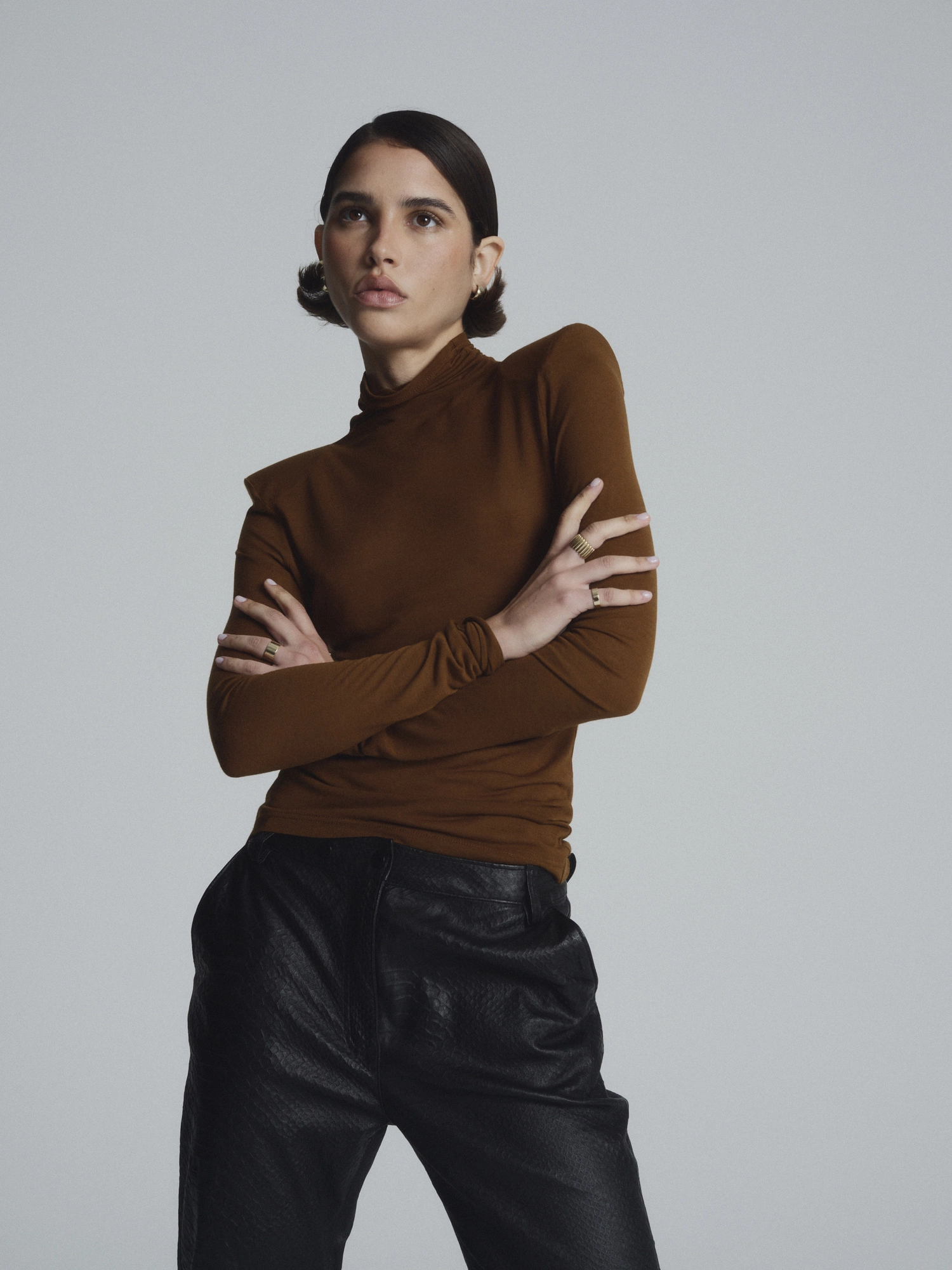 A fitted long-sleeved turtleneck made from a lightweight blend of viscose and silk. The minimalist design gives it a modern touch, while the slightly transparent fabric adds a bold yet subtle expression. Perfect for wearing on its own with plain underwear or as a base for layered outfits - under an oversized blazer, leather jacket, or casual shirt.
