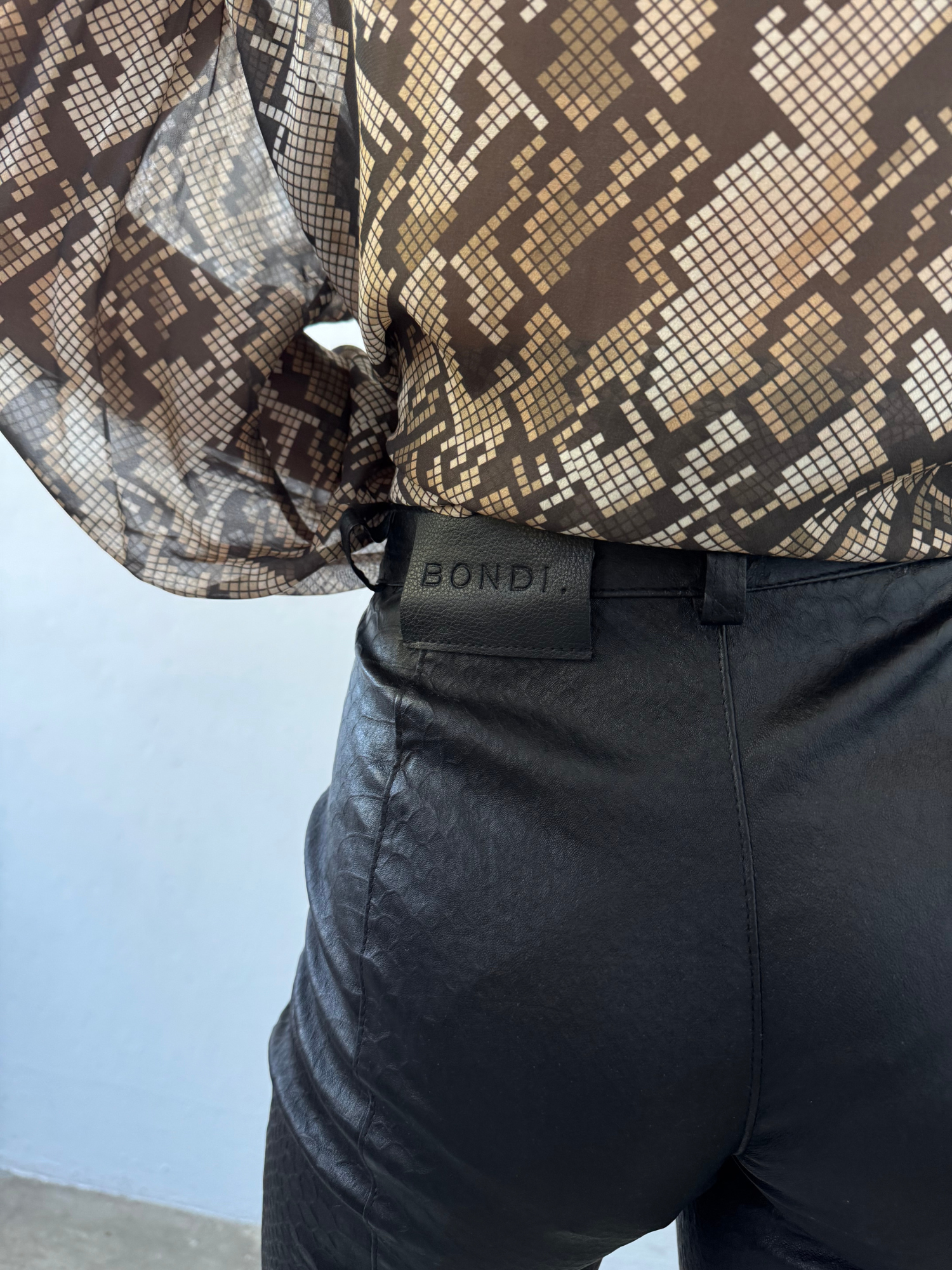 Trousers made of high-quality soft and durable lambskin with a characteristic animal print. For even greater comfort, the material has been specially treated, giving the inside a delicate cotton and elastane lining. The model has a classic waist and narrow, flared legs, finished at the back with decorative pleats. The bold stitching gives the whole piece a modern, rock-inspired character and goes perfectly with both minimalist tops in everyday outfits and jackets, creating an elegant option for more formal occasions.