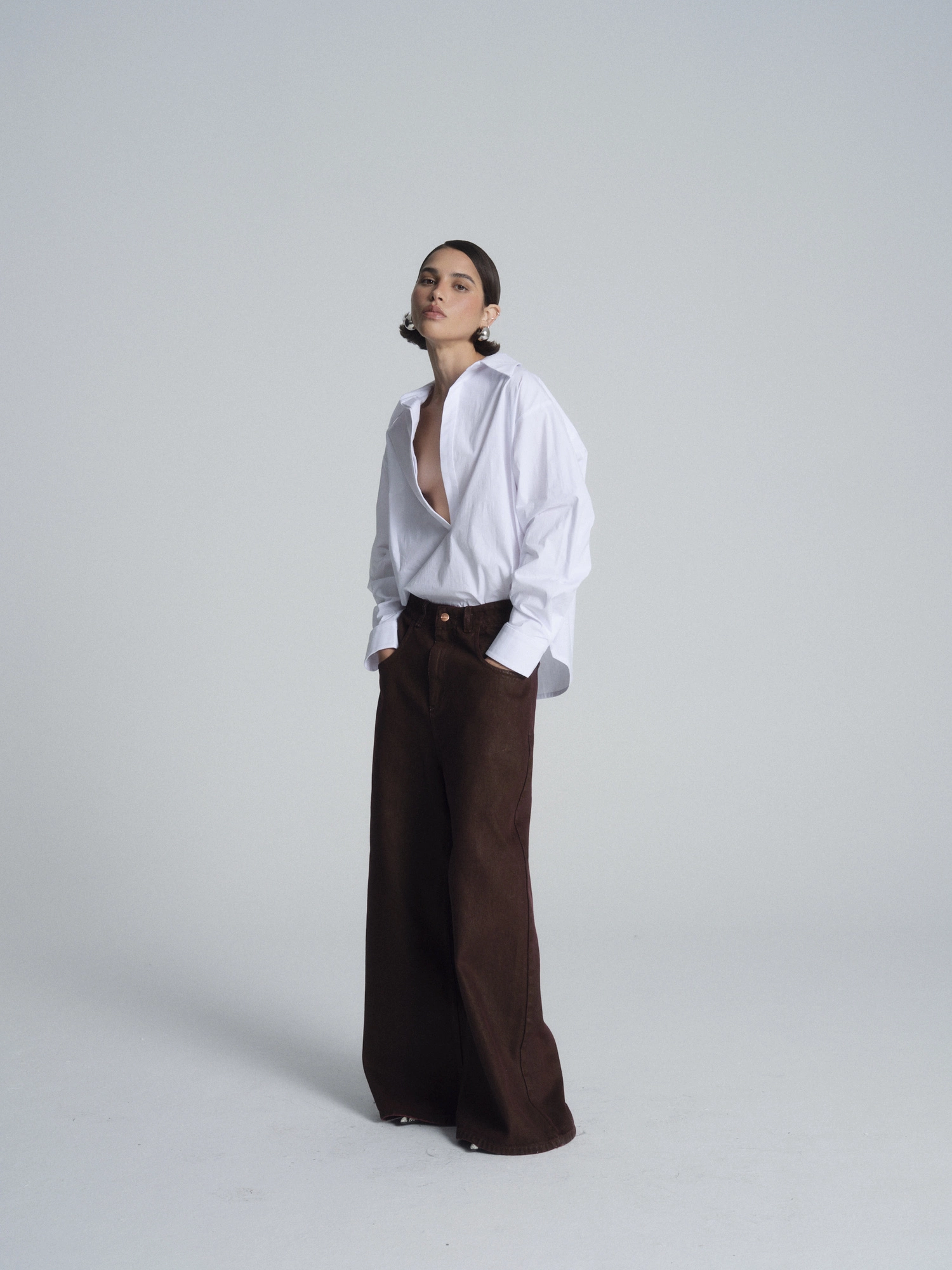 Crafted from denim with a waxed finish, these pants blend comfort with a bold, urban edge. The wide legs and low-rise waist create a relaxed, contemporary silhouette, while classic details - a button-and-zip closure, belt loops, and functional side and back pockets - ensure everyday practicality.