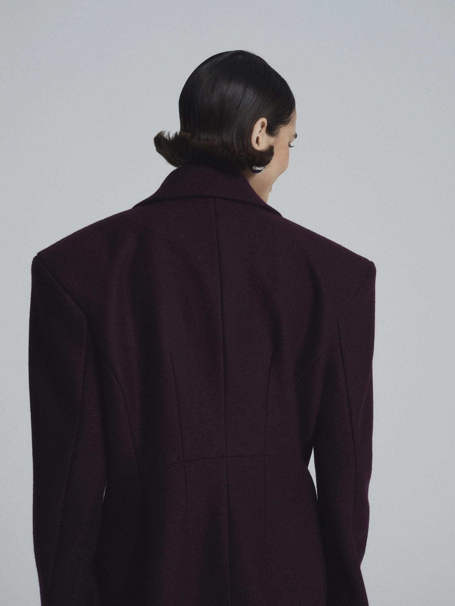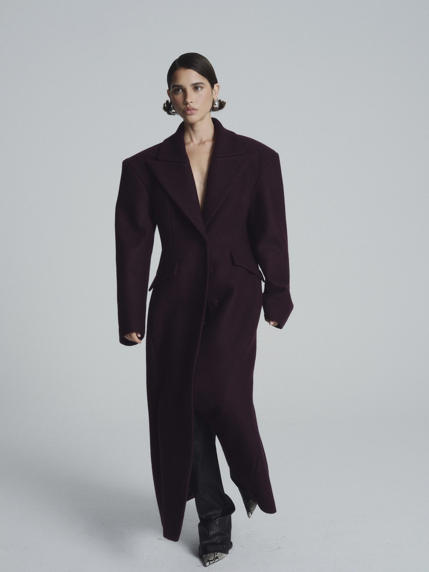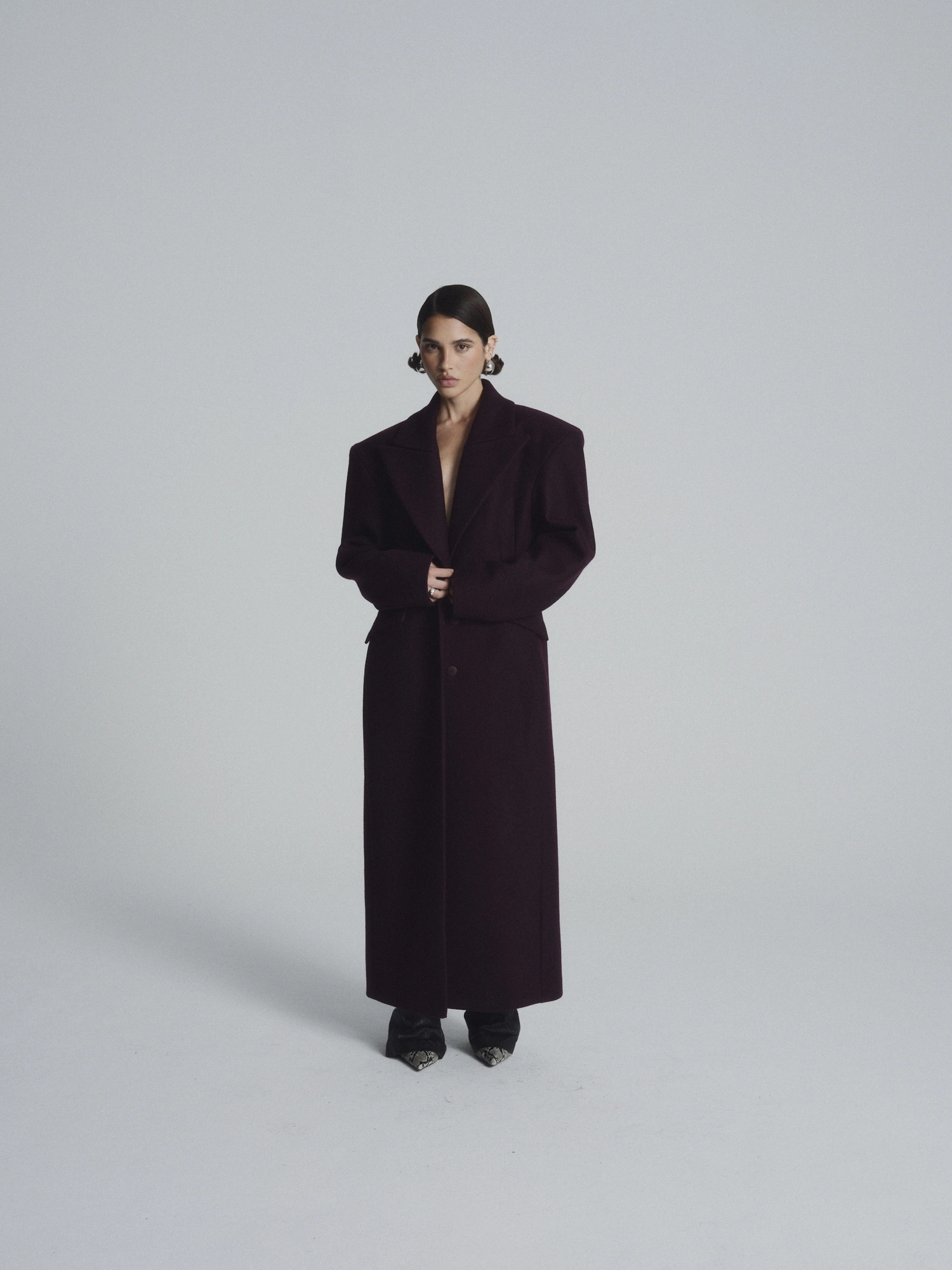 A coat with a bold, architectural silhouette that radiates modern elegance and strength of form. Crafted from premium, refined wool in a deep burgundy shade and finished inside with a viscose lining, it beautifully defines the figure through precisely structured shoulders and a tailored waist accented by signature front and back seams. Its long, fluid shape is complemented by a deep back vent, adding ease and a touch of effortless sophistication. Classic lapels and a minimalist closure harmonize with the elongated lines, creating an expression of timeless, urban elegance.