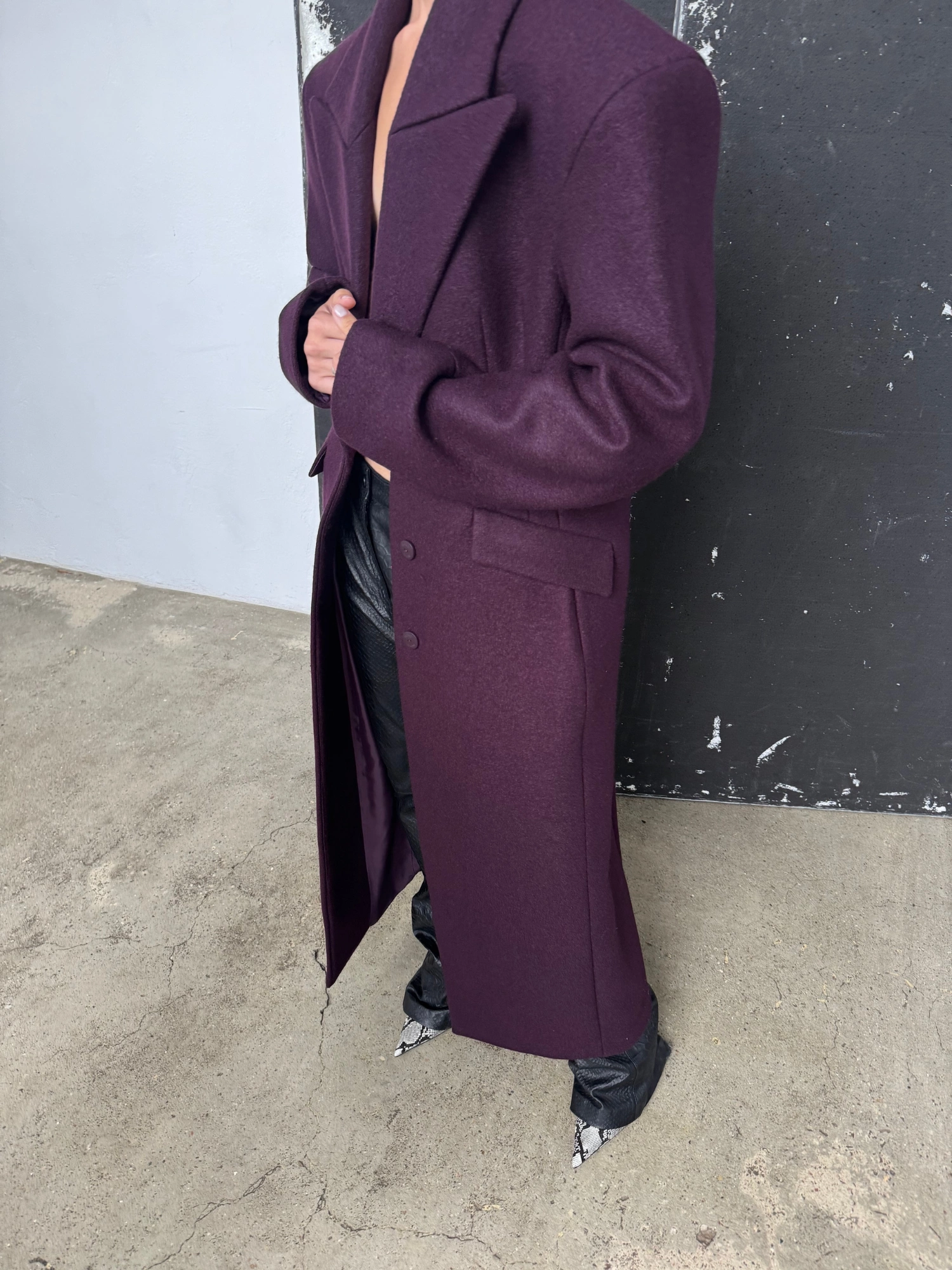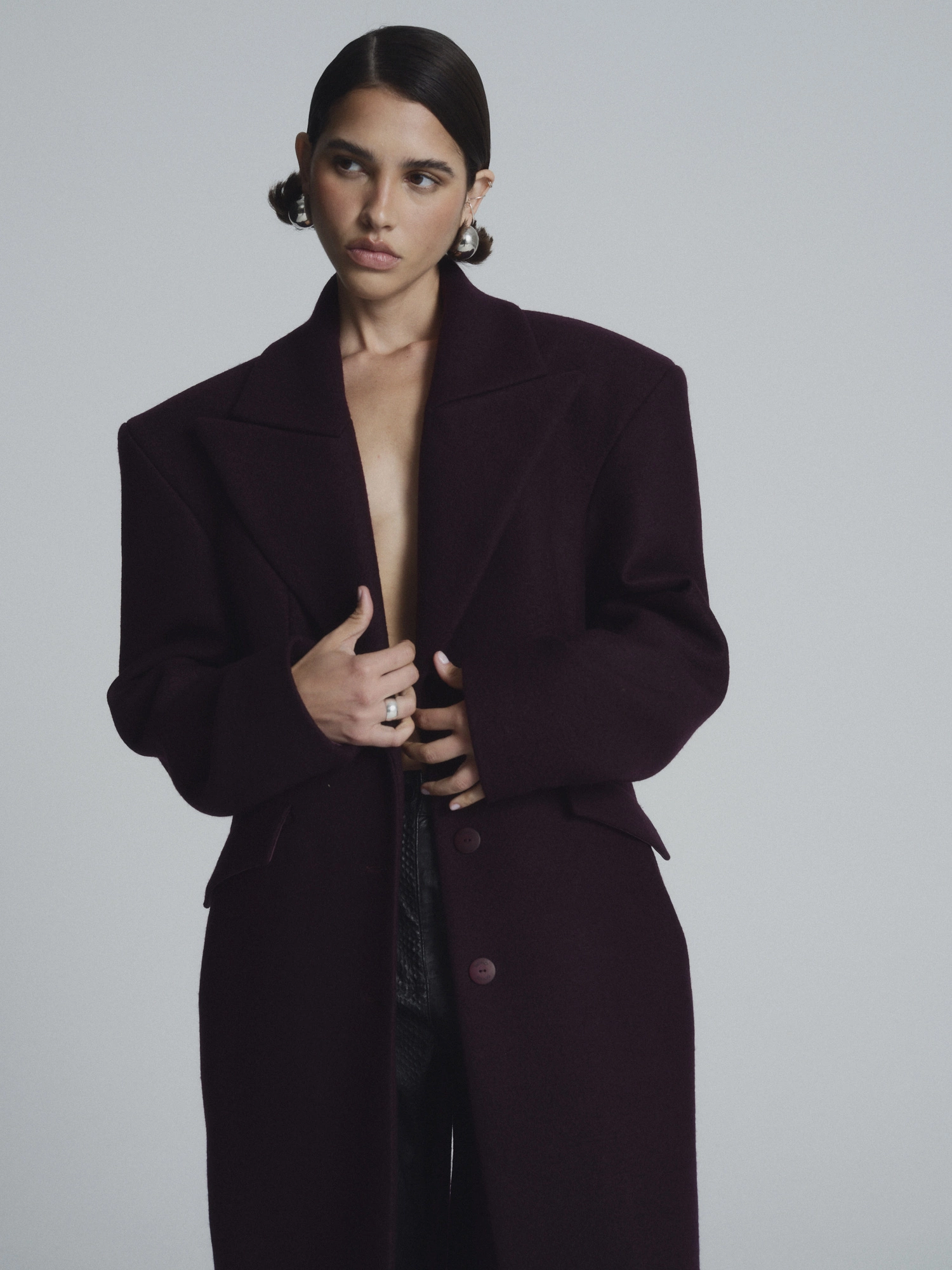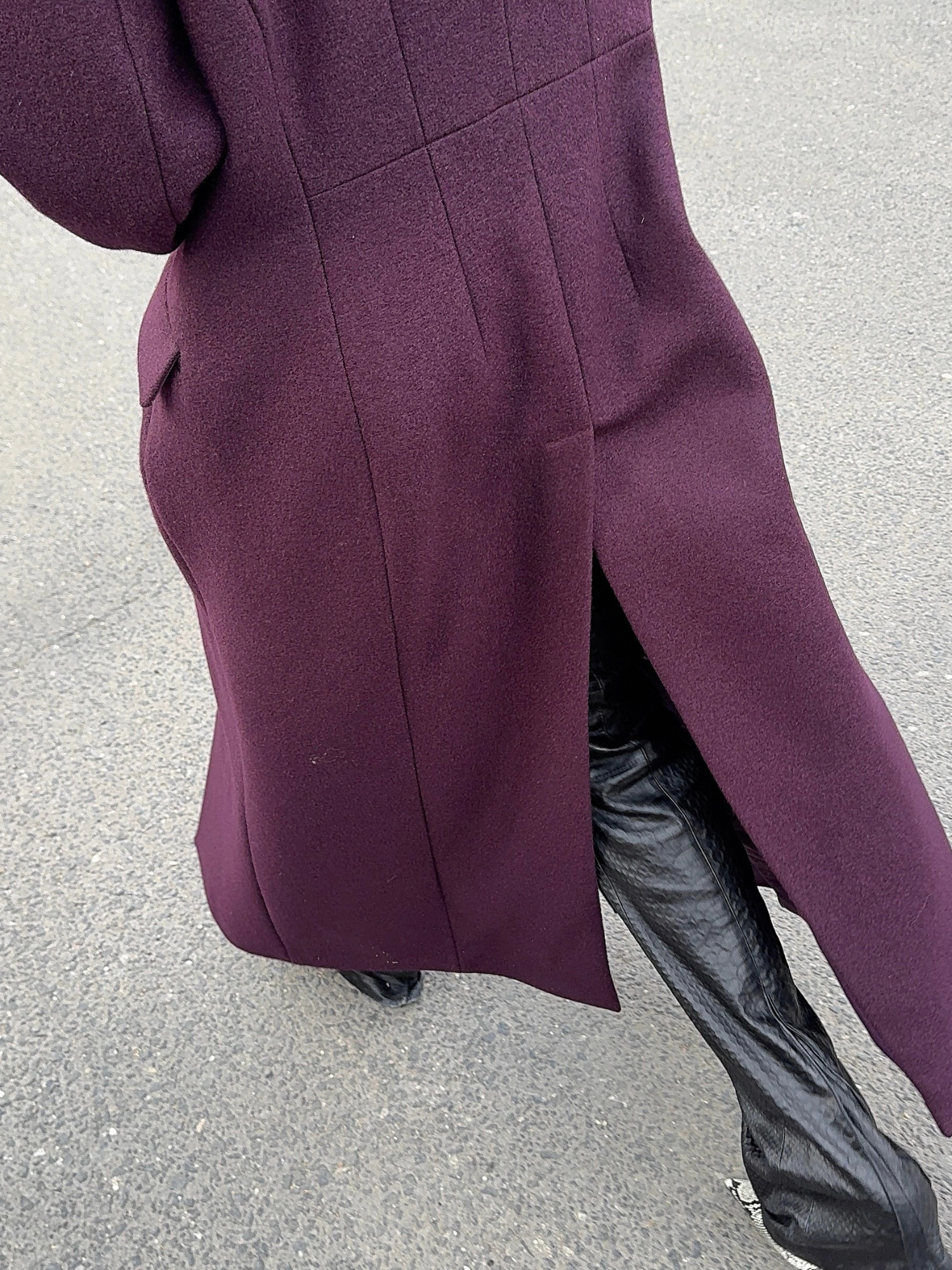 A coat with a bold, architectural silhouette that radiates modern elegance and strength of form. Crafted from premium, refined wool in a deep burgundy shade and finished inside with a viscose lining, it beautifully defines the figure through precisely structured shoulders and a tailored waist accented by signature front and back seams. Its long, fluid shape is complemented by a deep back vent, adding ease and a touch of effortless sophistication. Classic lapels and a minimalist closure harmonize with the elongated lines, creating an expression of timeless, urban elegance.