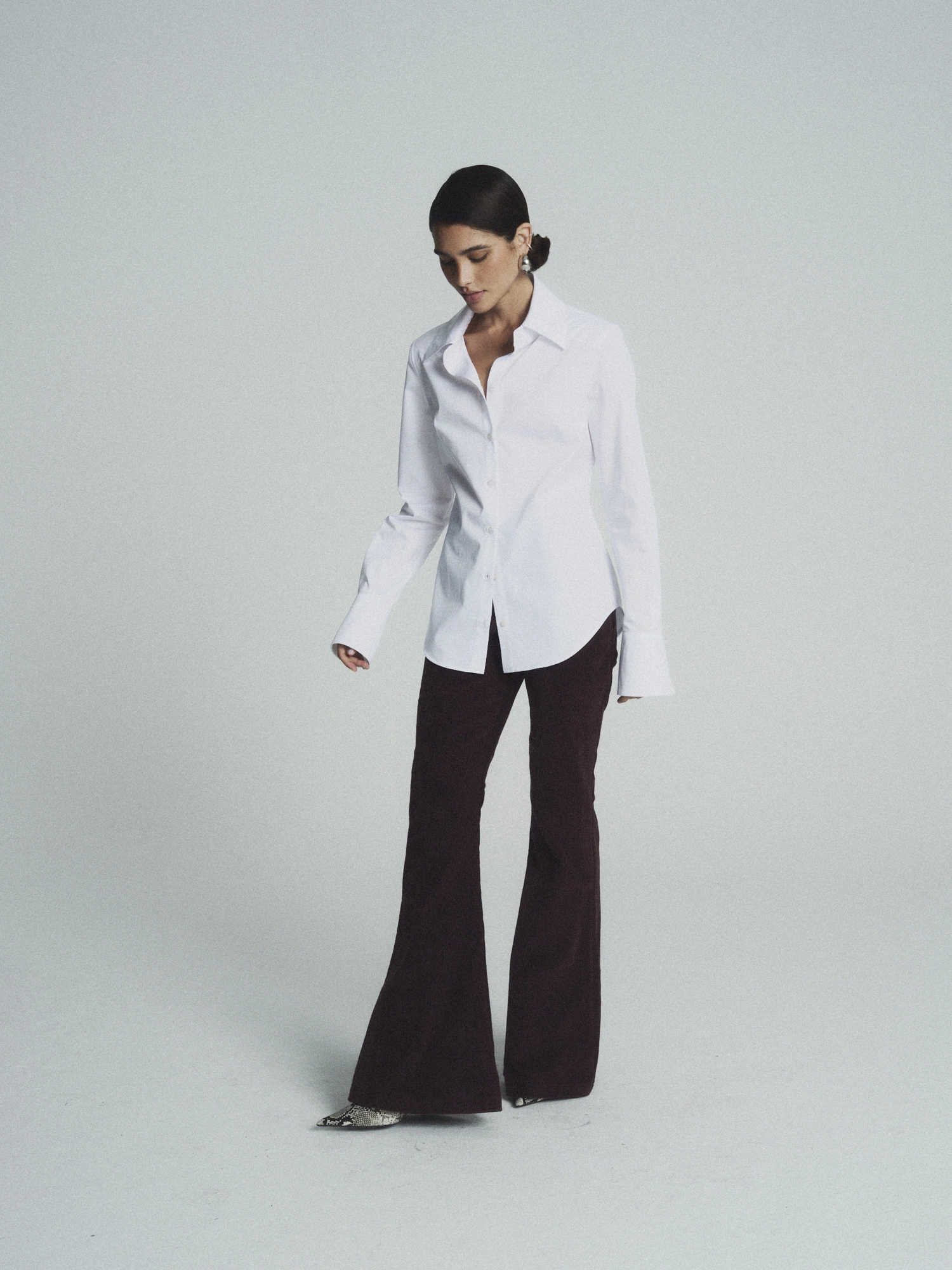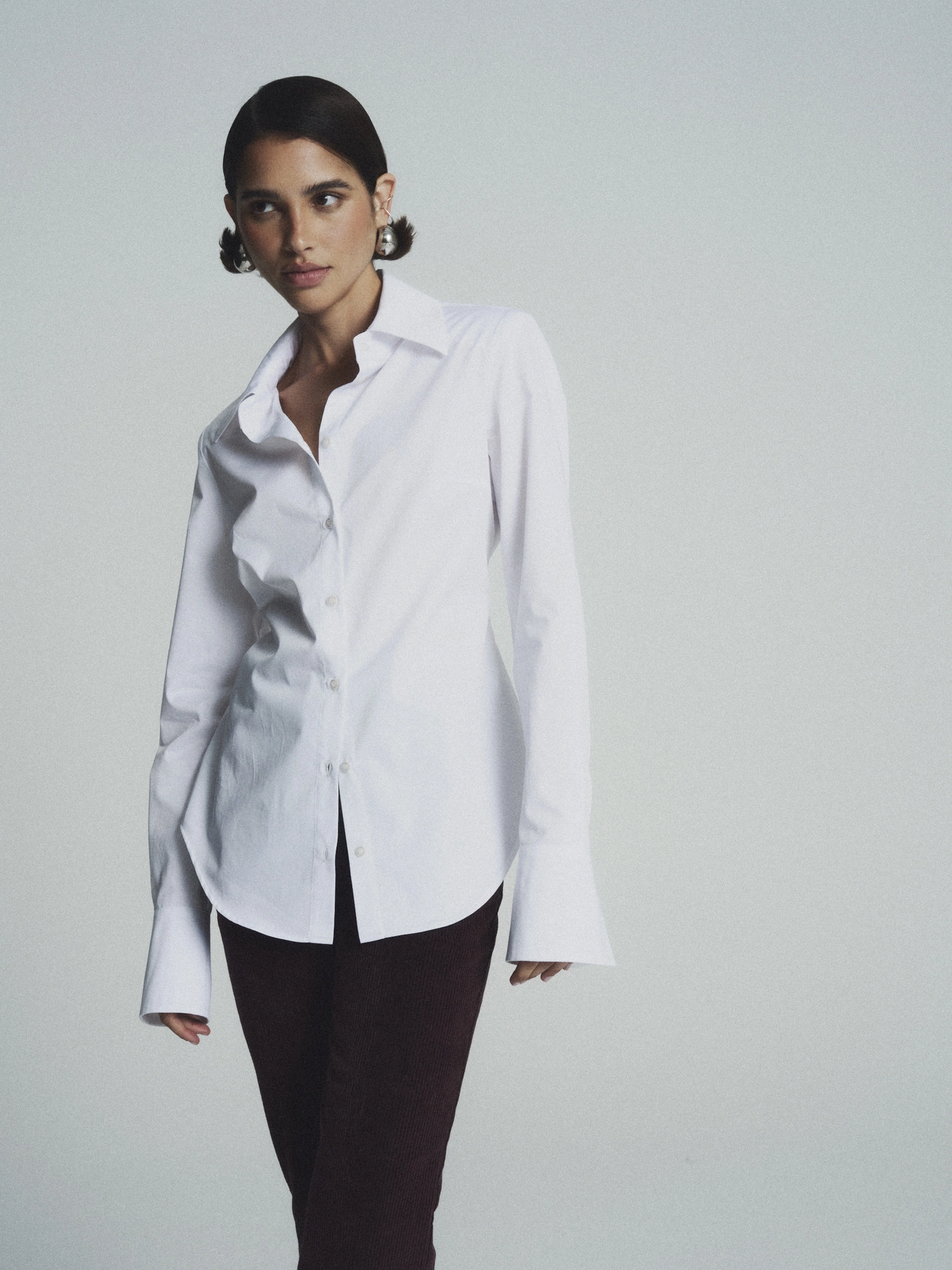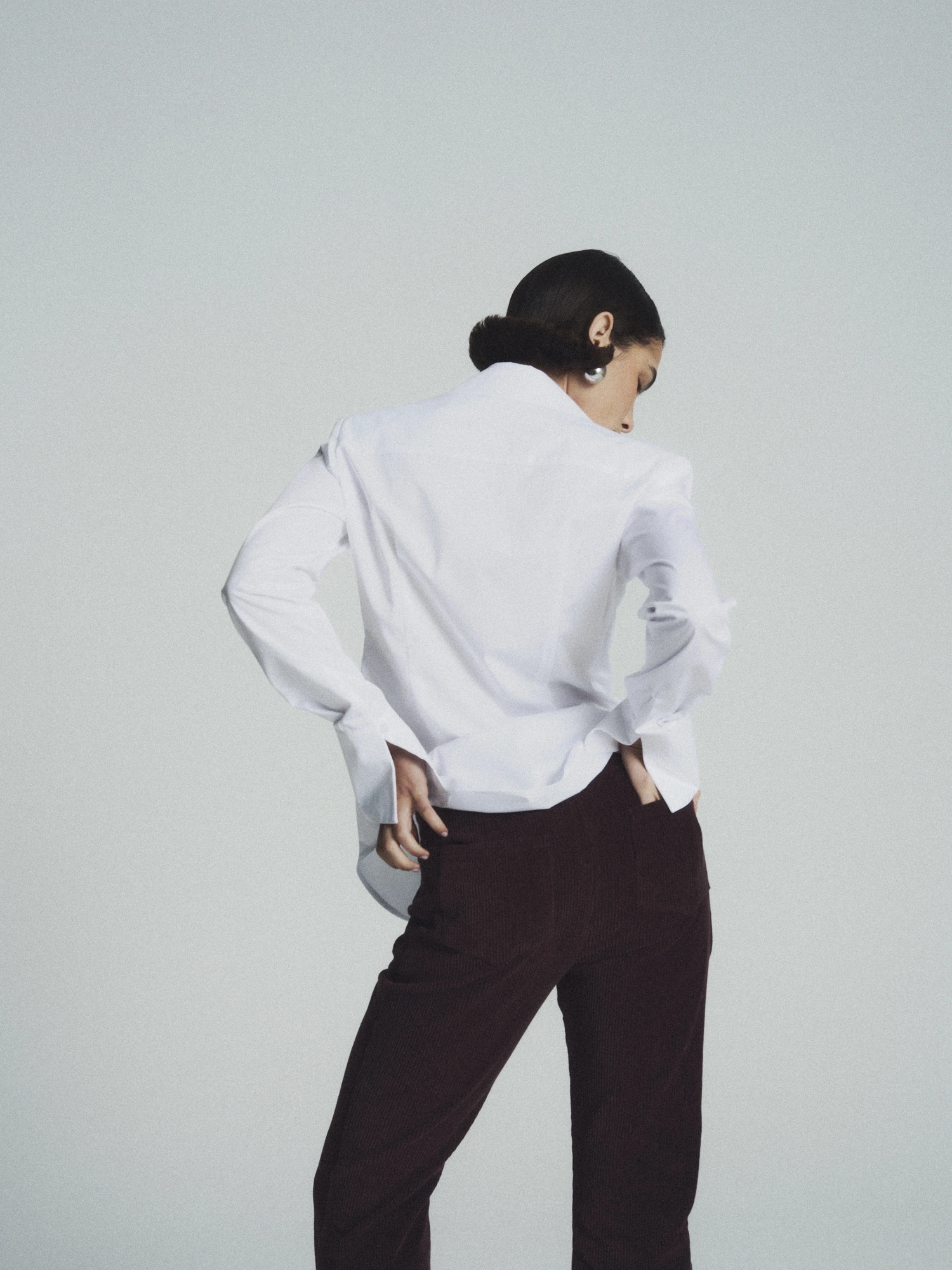 A cotton shirt that gives classic tailoring a fresh, modern interpretation. The fitted silhouette highlights the body’s natural lines, while the subtly defined shoulder pads add confidence and balanced elegance. A refined collar, wide cuffs, and a clean front construction create a harmonious look where every detail matters.