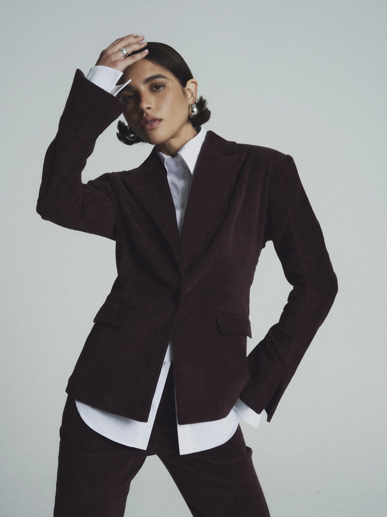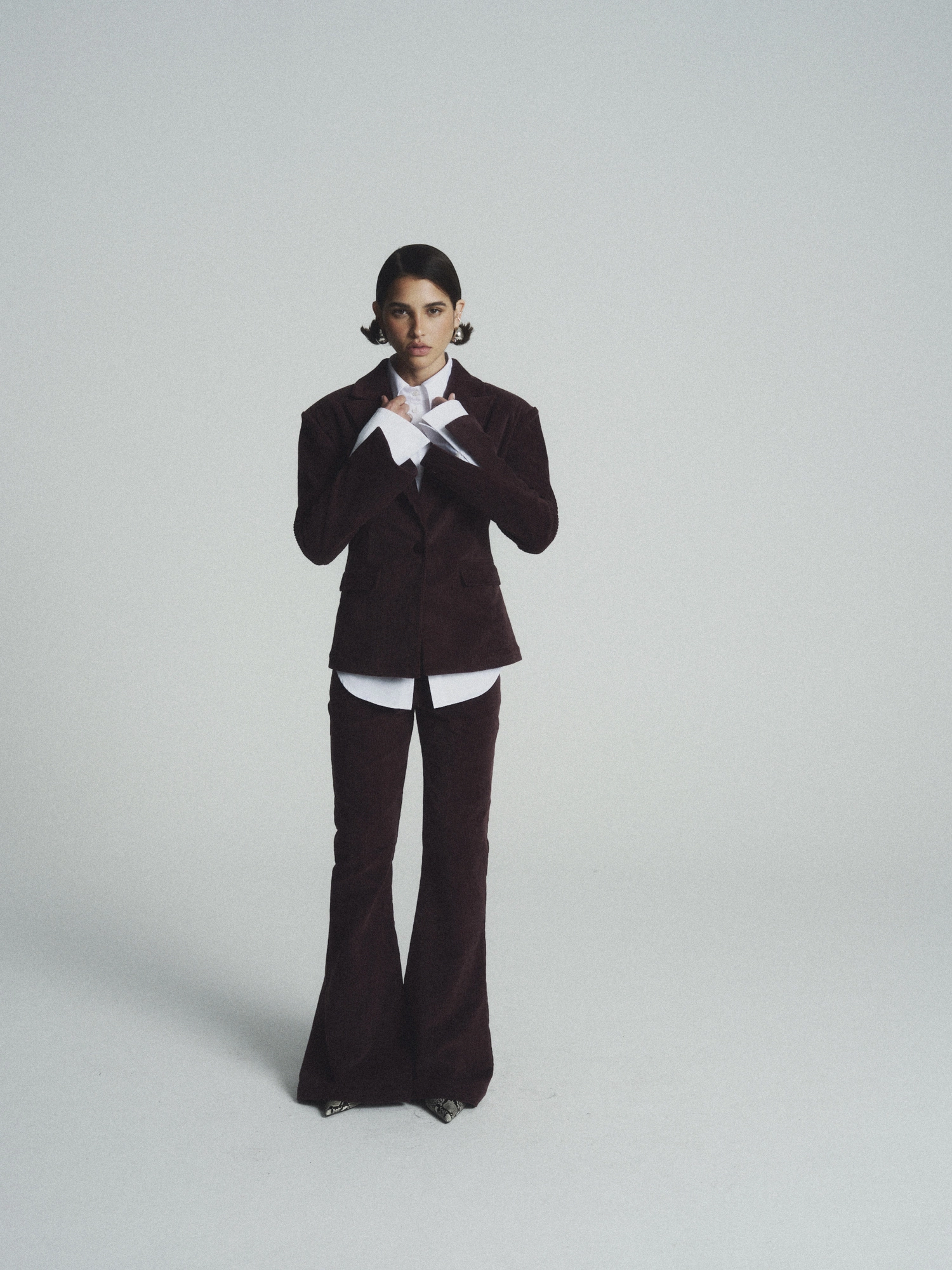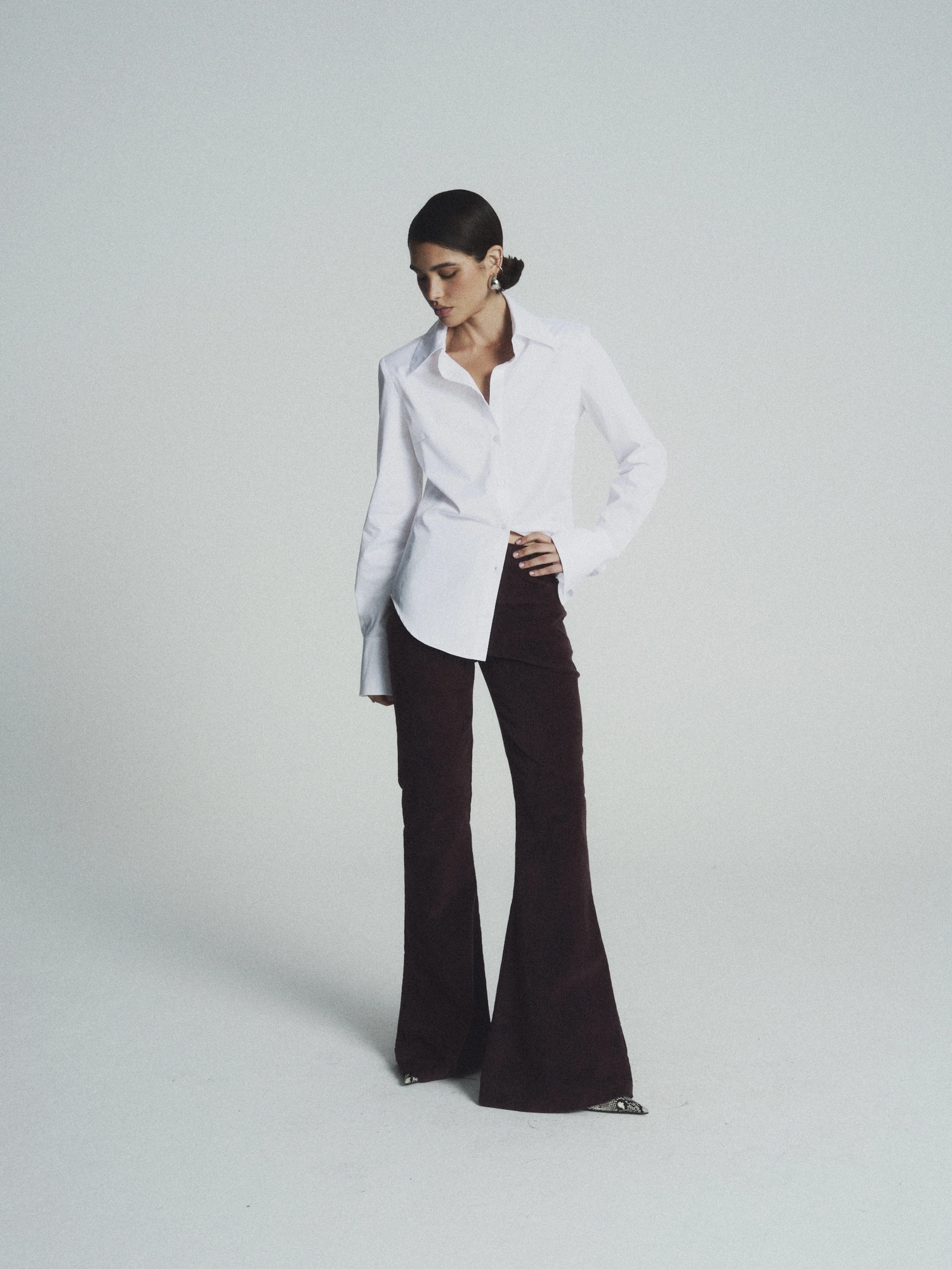 A cotton shirt that gives classic tailoring a fresh, modern interpretation. The fitted silhouette highlights the body’s natural lines, while the subtly defined shoulder pads add confidence and balanced elegance. A refined collar, wide cuffs, and a clean front construction create a harmonious look where every detail matters.