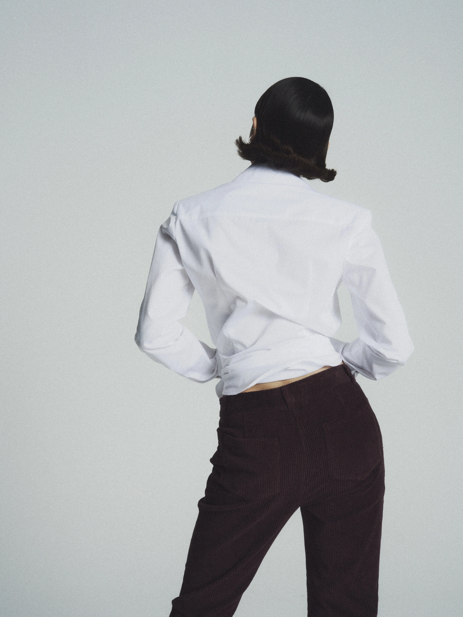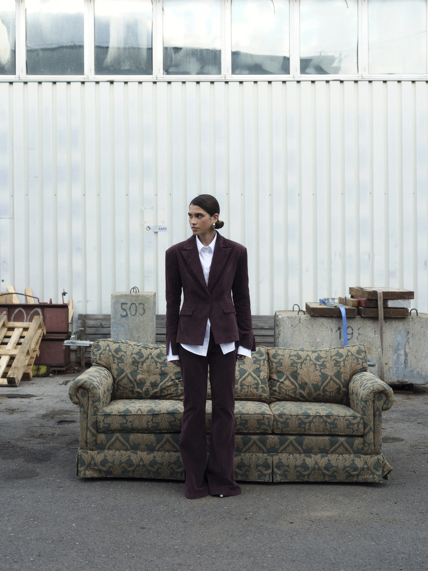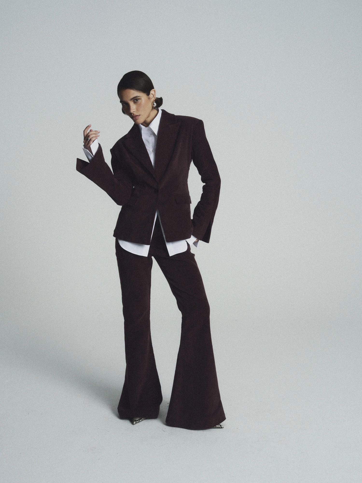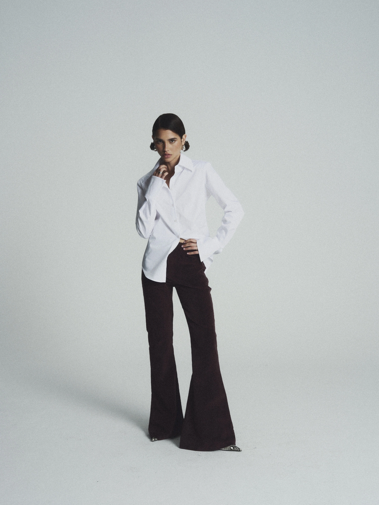 Corduroy trousers with a refined silhouette that flatter the figure while offering exceptional comfort. The fitted upper smoothly transitions into flared legs, creating an elegant, elongated shape. The soft, premium fabric in a deep burgundy shade adds richness and definition, while the high-rise waist beautifully highlights the silhouette.