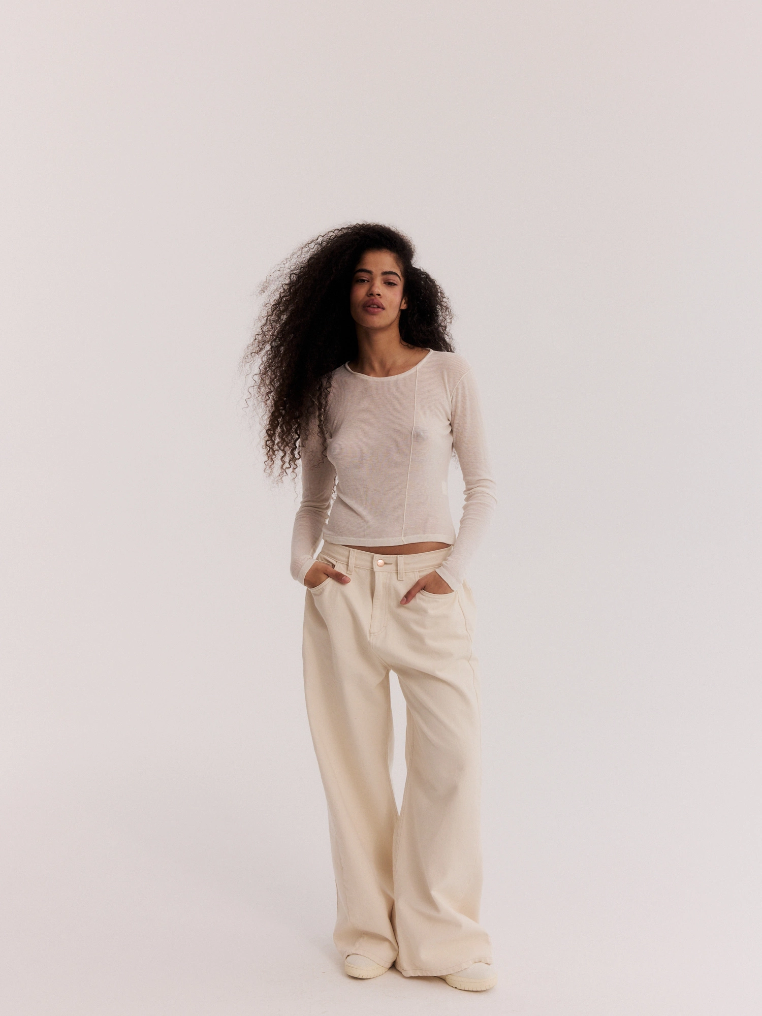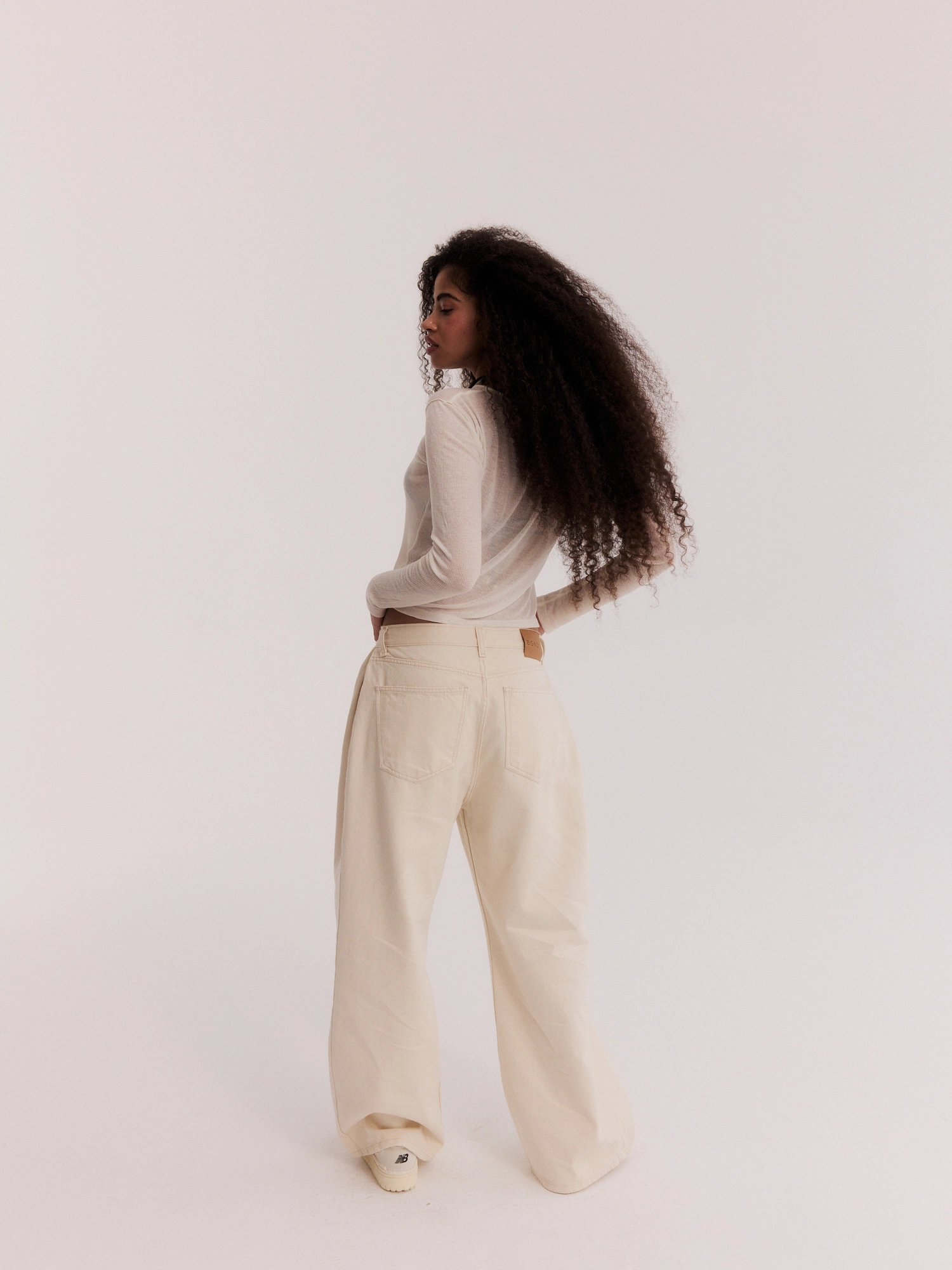 Szerokie jeansy z obniżonym stanem i charakterystycznym lampasem po boku. Mają piękny kremowy odcień, który sprawdzi się zarówno w stylizacjach codziennych jak i eleganckich, nadając całości świeżości i sportowego luzu.