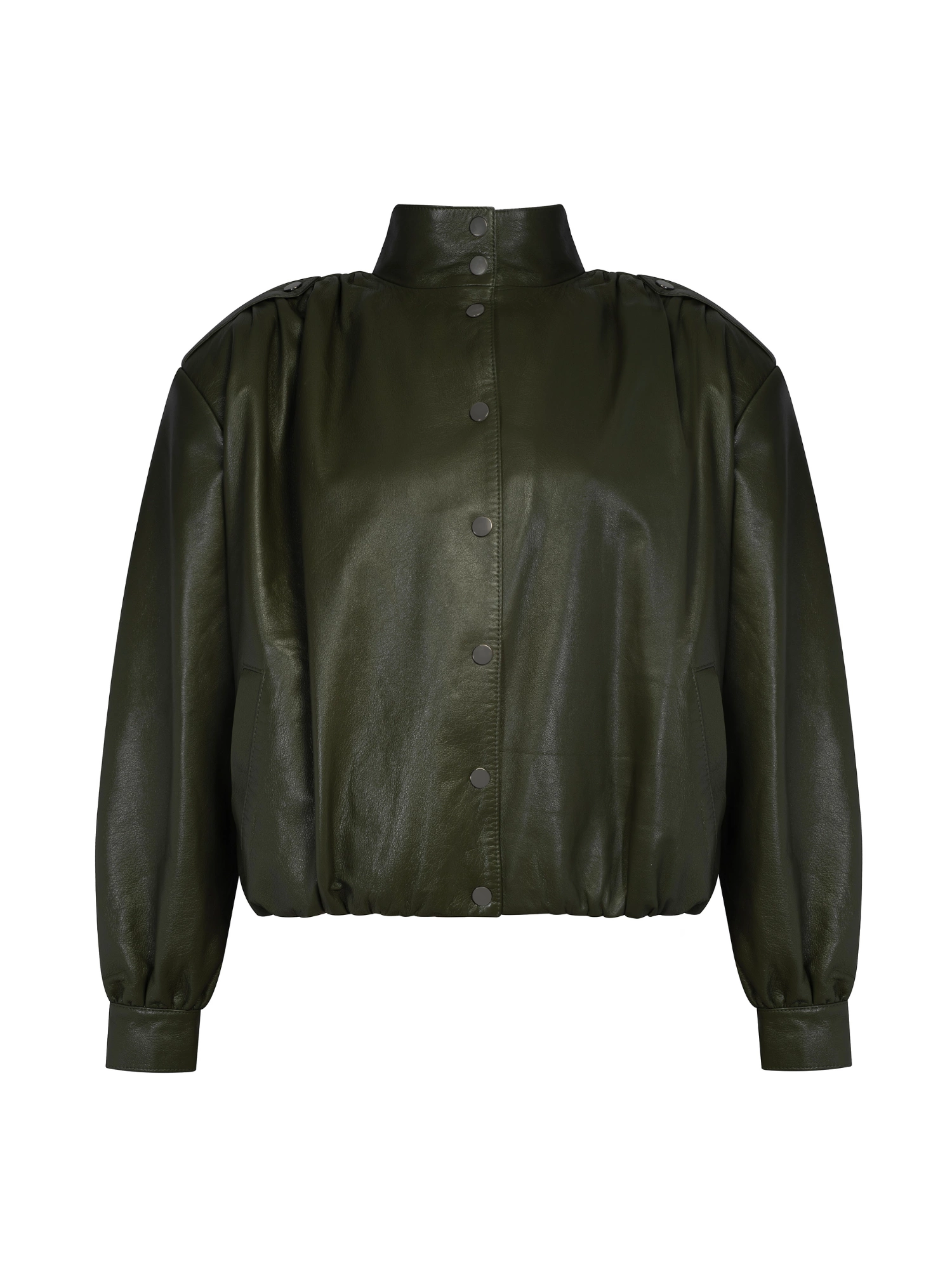 Krótka kurtka wykonana z naturalnej i miękkiej skóry owczej. Ma pudełkowy fason z wąskim ściągaczem w pasie i dopasowanymi mankietami. Ramiona mocne, podkreślone poduszkami z charakterystycznym marszczeniem i ozdobnymi pagonami. Całość zapinana na zatrzaski z wysoką stójką pod szyją. Wewnątrz wykończona podszewką z wiskozy w tym samym kolorze. Jest niezwykle kobieca, a jednocześnie doda charakteru każdej stylizacji.