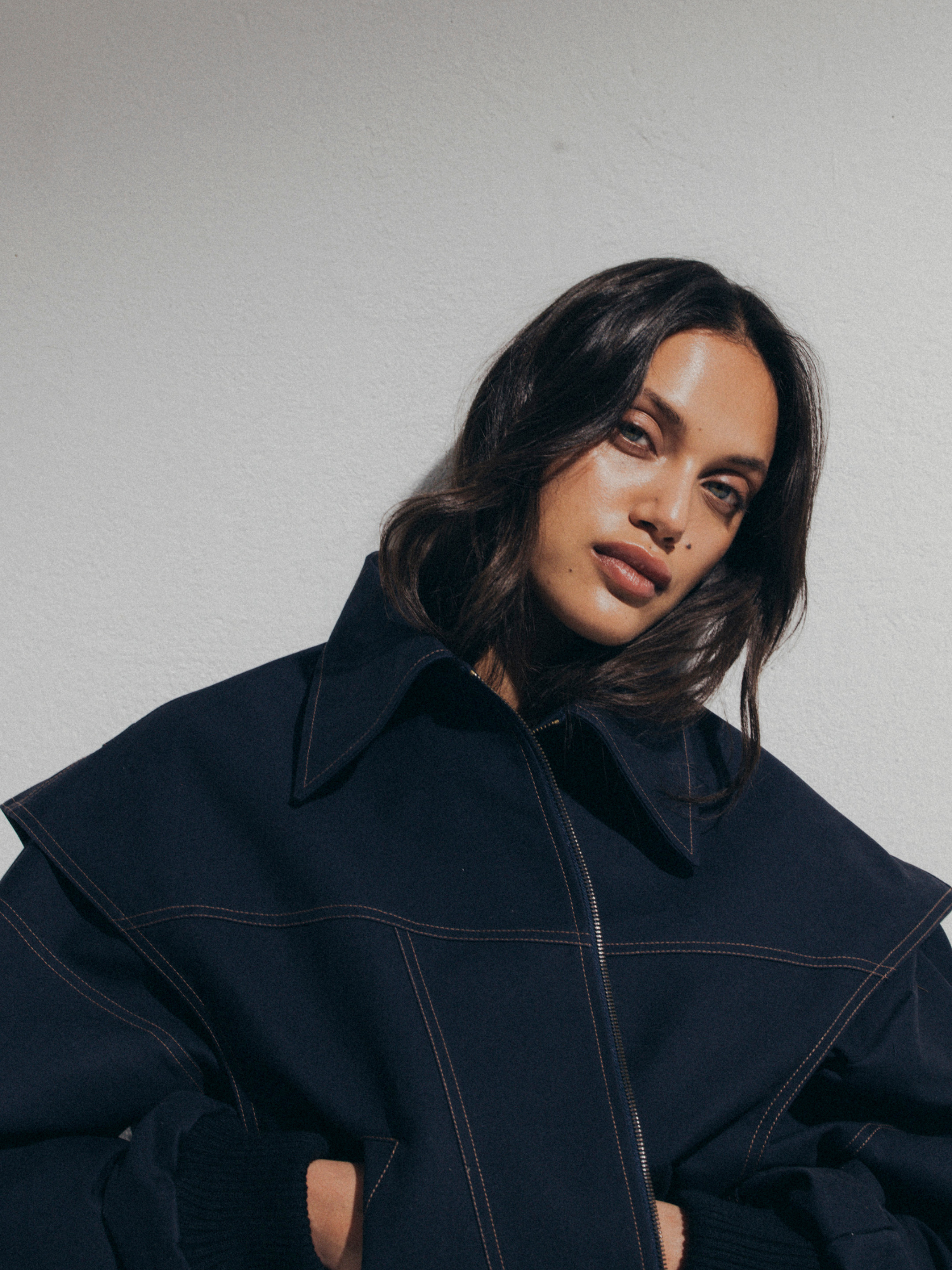 Kurtka o fasonie bomberki. Wykonana w 100% z wysokiej jakości bawełny, przyciąga uwagę rzeźbiarskim krojem i starannie przemyślanymi przeszyciami. Poszerzona linia ramion i strukturalna forma nadają jej nowoczesnego, wyrazistego charakteru, a szwy w kontrastowym kolorze podkreślają jej geometryczną konstrukcję. To ubranie, które nie tylko uzupełni stylizację, ale nada jej niepowtarzalnego twistu. Zakończona jest typowymi dla tego fasonu ściągaczami przy mankietach i pasie. Wewnątrz podszewka z wiskozy.