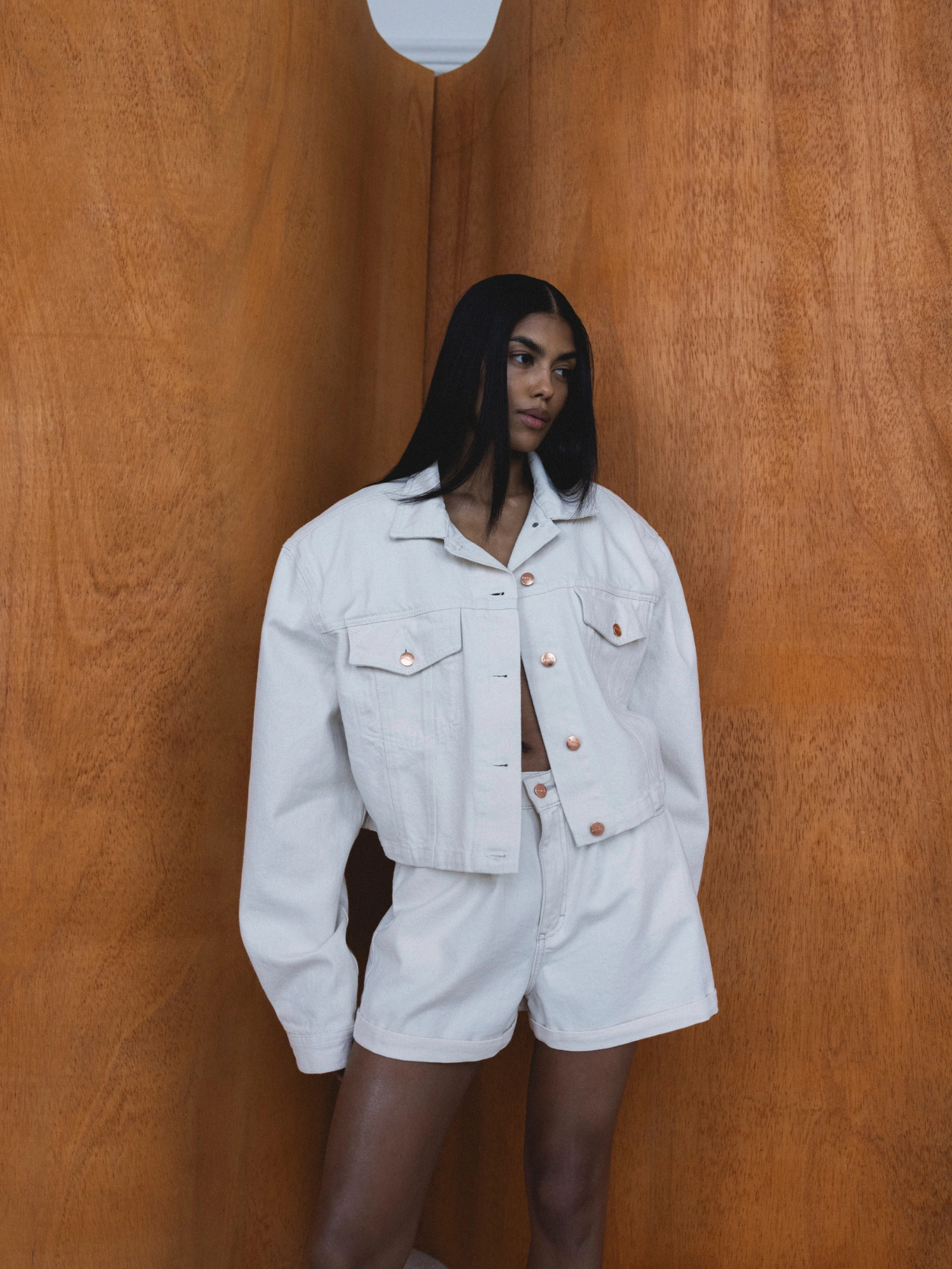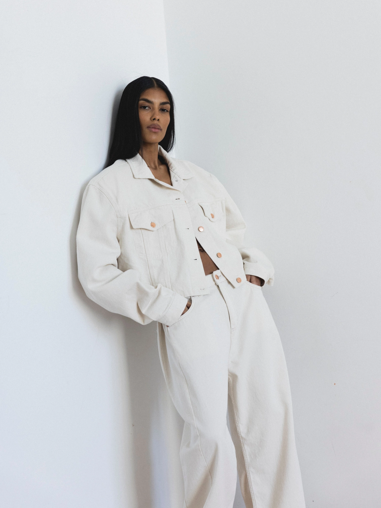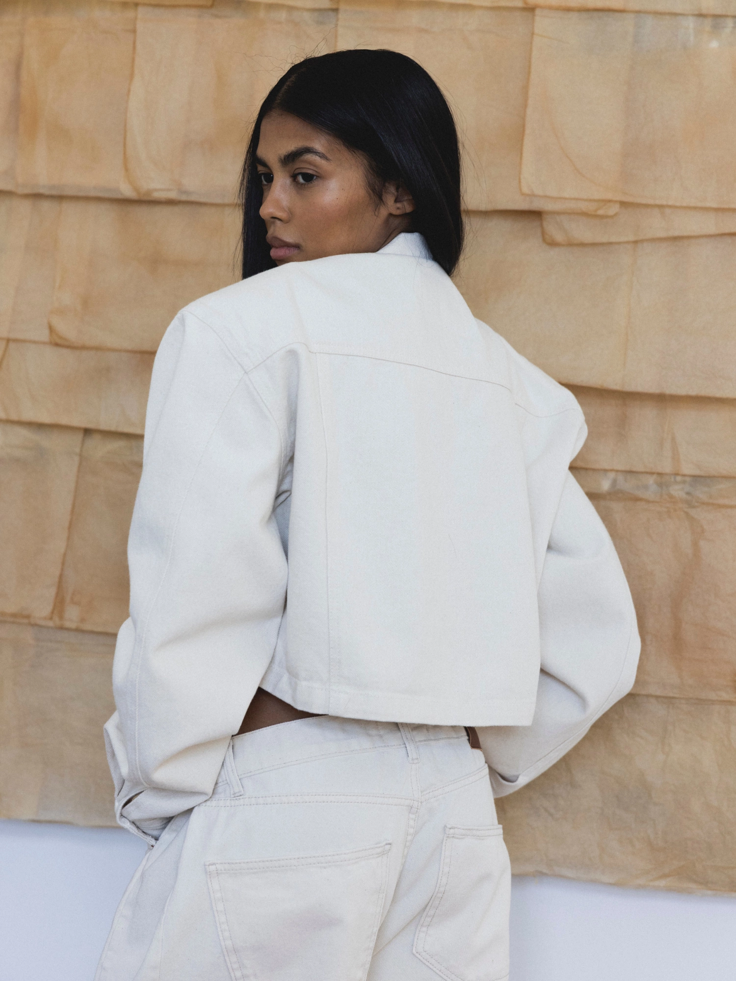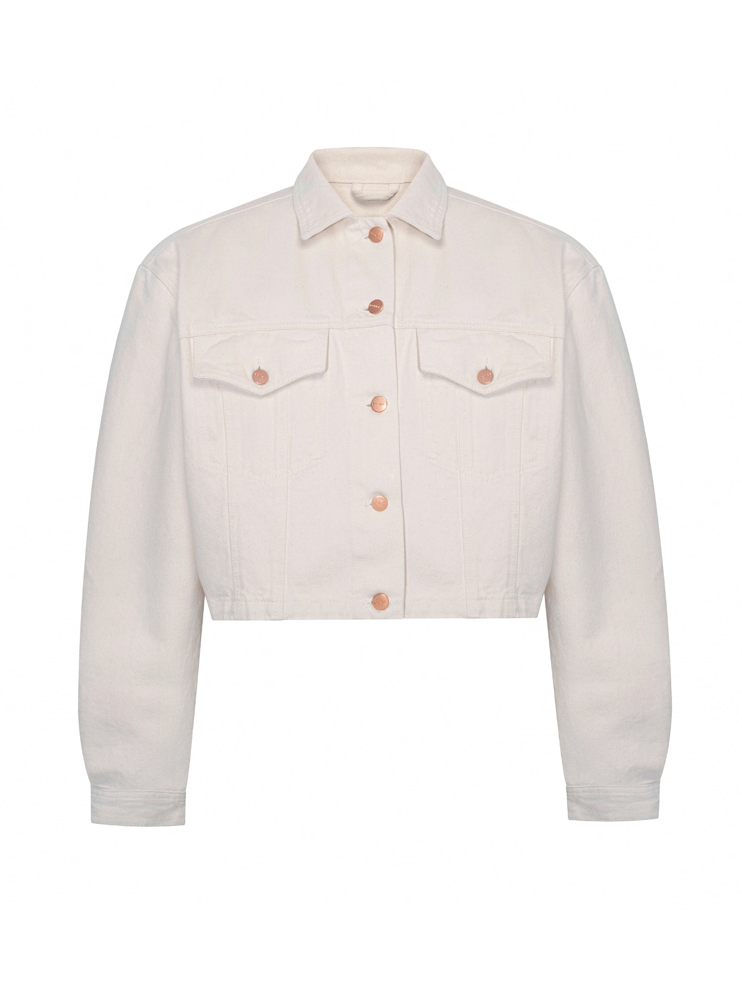 Krótka kurtka wykonana z miękkiego denimu w kremowym odcieniu. Klasyczny fason przełamuje optycznie podkreślająca talię długość, a całość dopełniają mocne ramiona z poduszkami. Zapinana na guziki z logo, na przodzie dwie, duże kieszenie. To ponadczasowa propozycja, która sprawdzi się zarówno z jeansami, szortami, jak i solo ze spodniami z materiału lub sukienką.