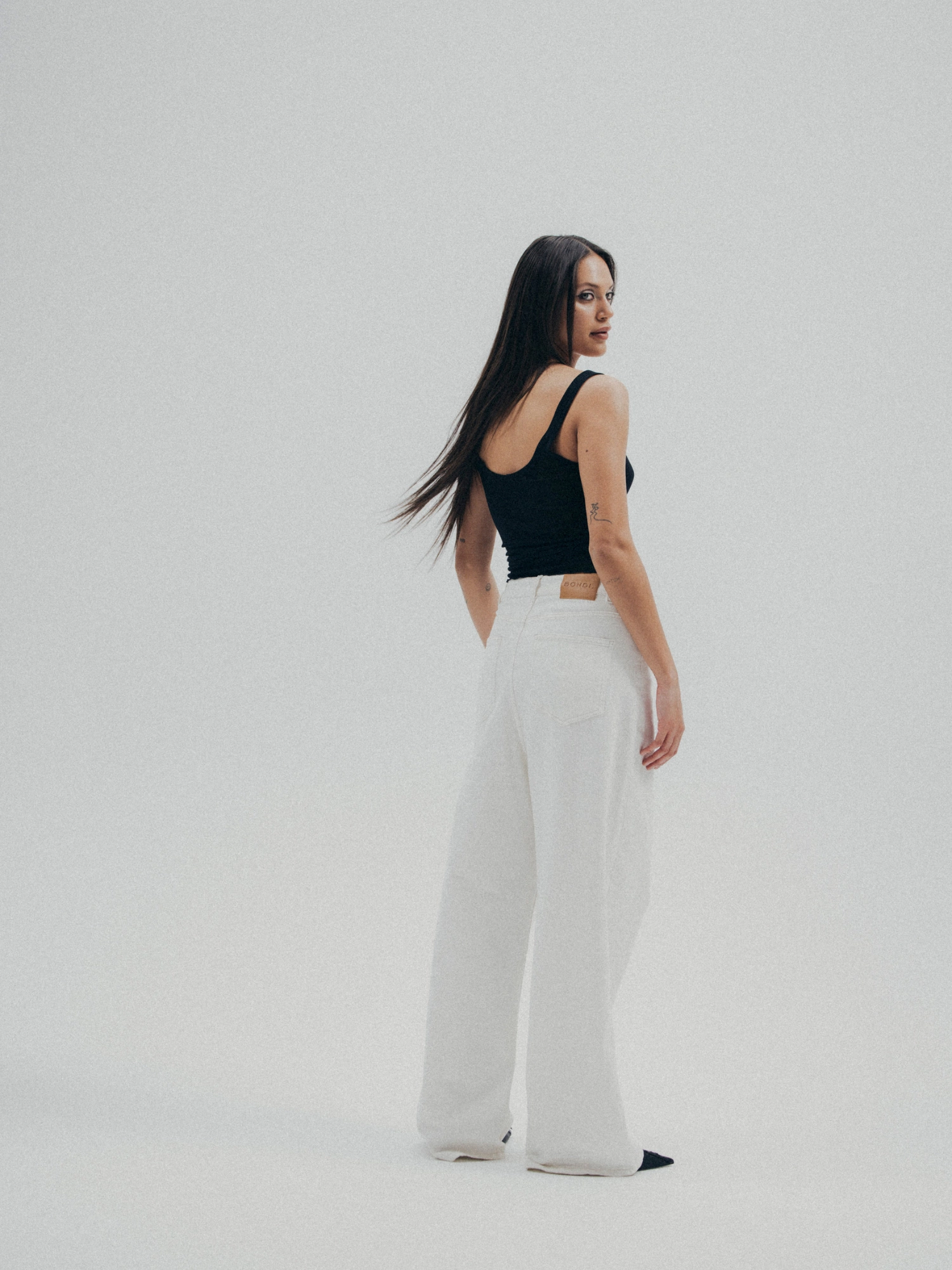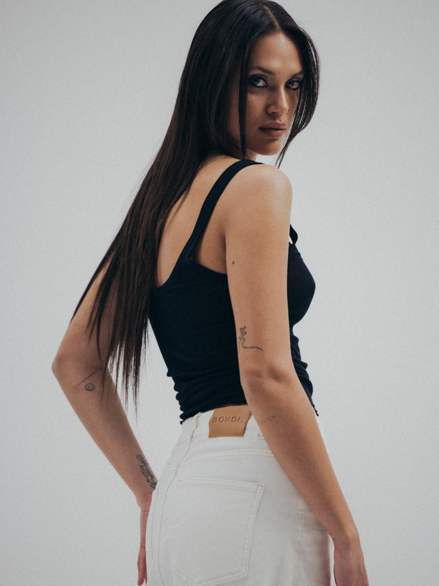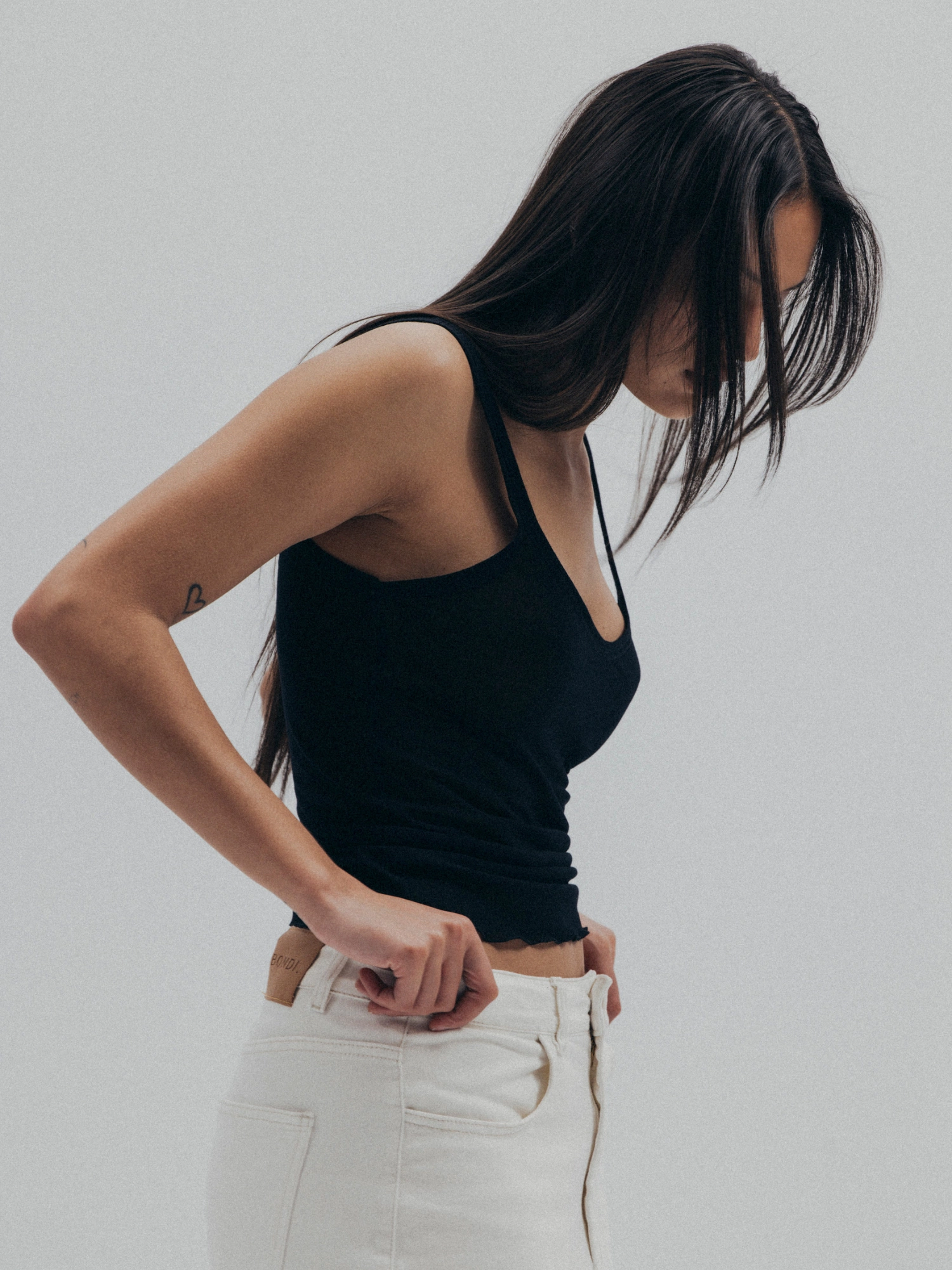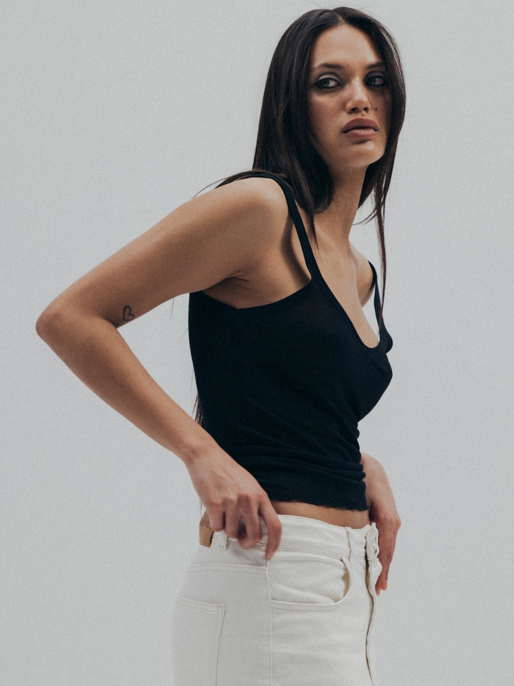 Krótka, transparentna koszulka, wykonana z delikatnej mieszanki wiskozy i jedwabiu o prążkowanej strukturze. Materiał zapewnia niezwykłą lekkość i komfort noszenia, a minimalistyczny fason podkreśla nonszalancki, surowy styl ze zmysłową nutą. Ma wąskie ramiączka i głęboko wycięty dekolt i plecy. Idealna do noszenia solo z subtelną bielizną, jak i w zestawieniu z marynarką lub oversize’ową koszulą dla bardziej zrównoważonego looku.