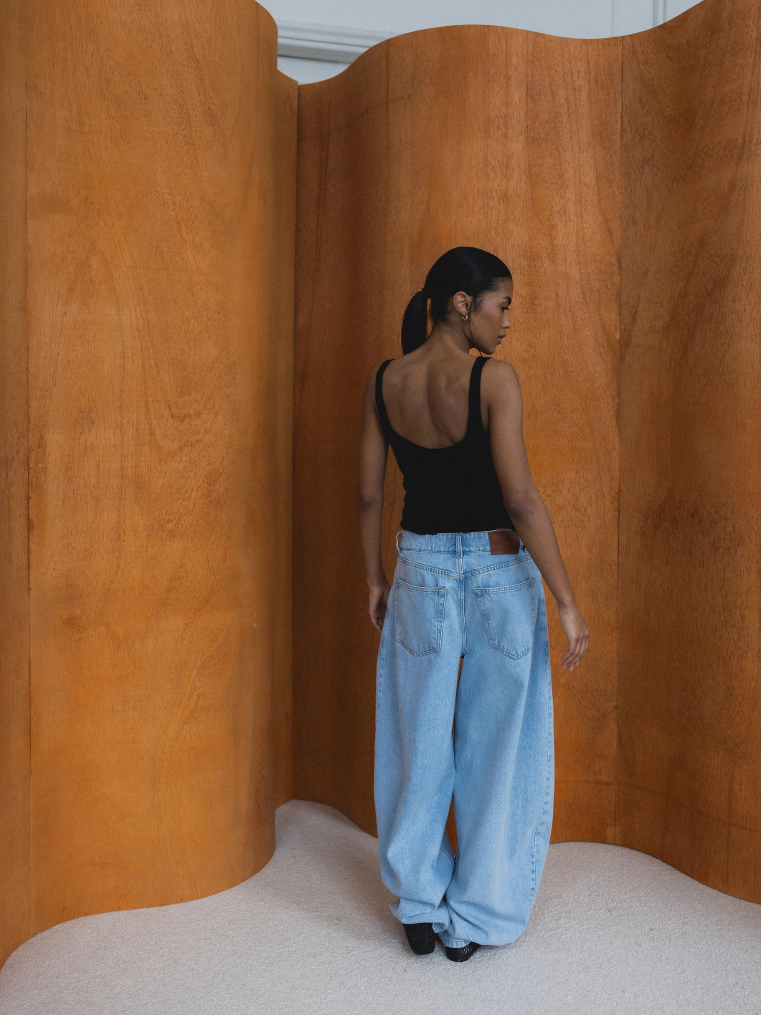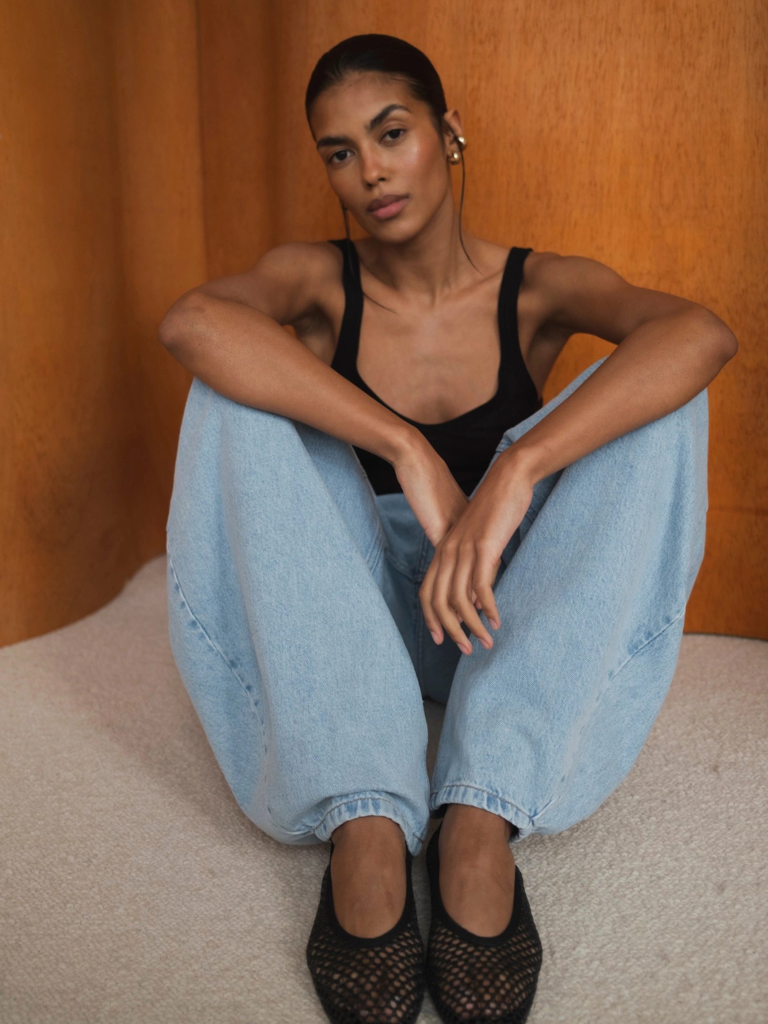 Jeansy o fasonie balloon, z charakterystycznie zaokrągloną linią nogawek, delikatnie zwężających się ku dołowi. Dzięki wewnętrznej regulacji w pasie na gumki, z łatwością dopasujesz je do swojej sylwetki i będziesz mogła nosić tak, jak lubisz – wyżej w talii lub nisko na biodrach. Wykonane z miękkiego denimu, który dobrze trzyma formę, nie krępując przy tym ruchów i zapewniając wygodę przez cały dzień.
