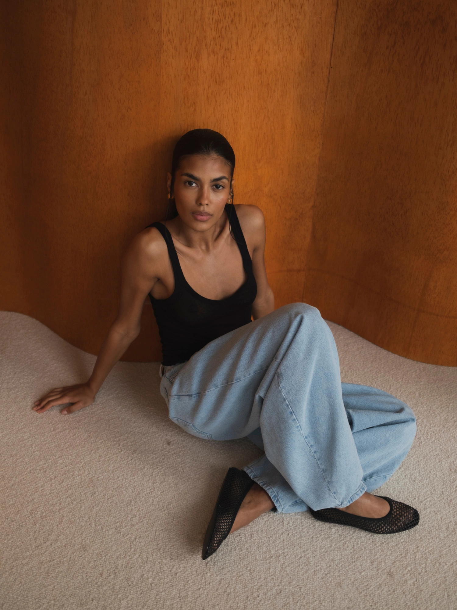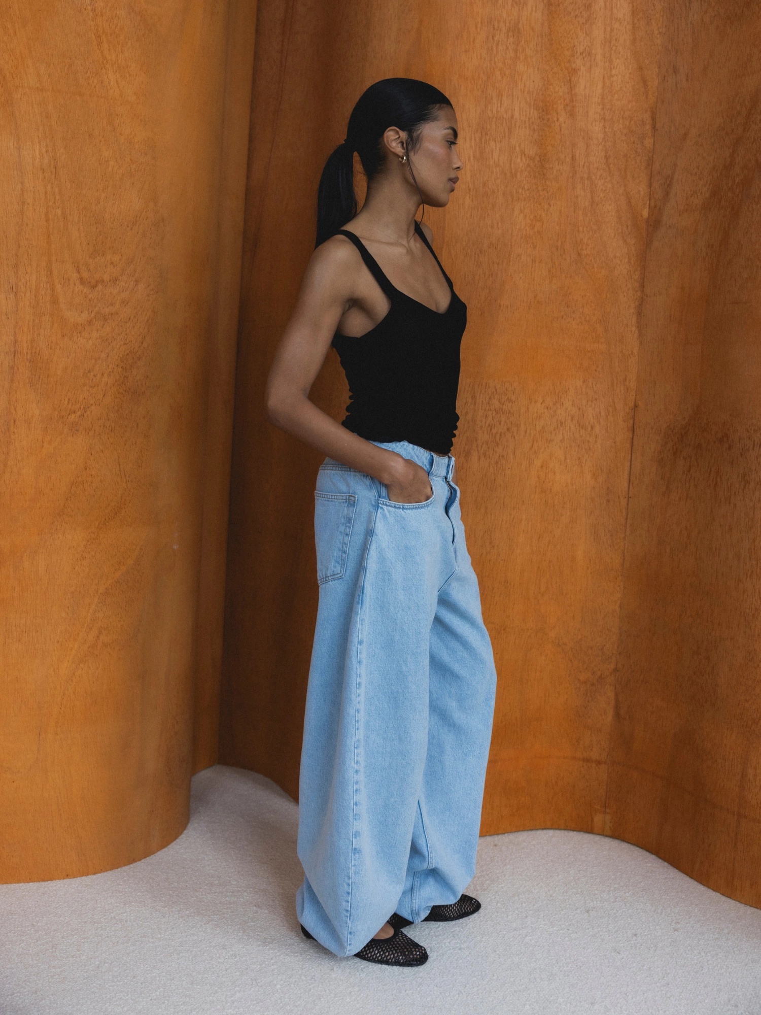 Jeansy o fasonie balloon, z charakterystycznie zaokrągloną linią nogawek, delikatnie zwężających się ku dołowi. Dzięki wewnętrznej regulacji w pasie na gumki, z łatwością dopasujesz je do swojej sylwetki i będziesz mogła nosić tak, jak lubisz – wyżej w talii lub nisko na biodrach. Wykonane z miękkiego denimu, który dobrze trzyma formę, nie krępując przy tym ruchów i zapewniając wygodę przez cały dzień.