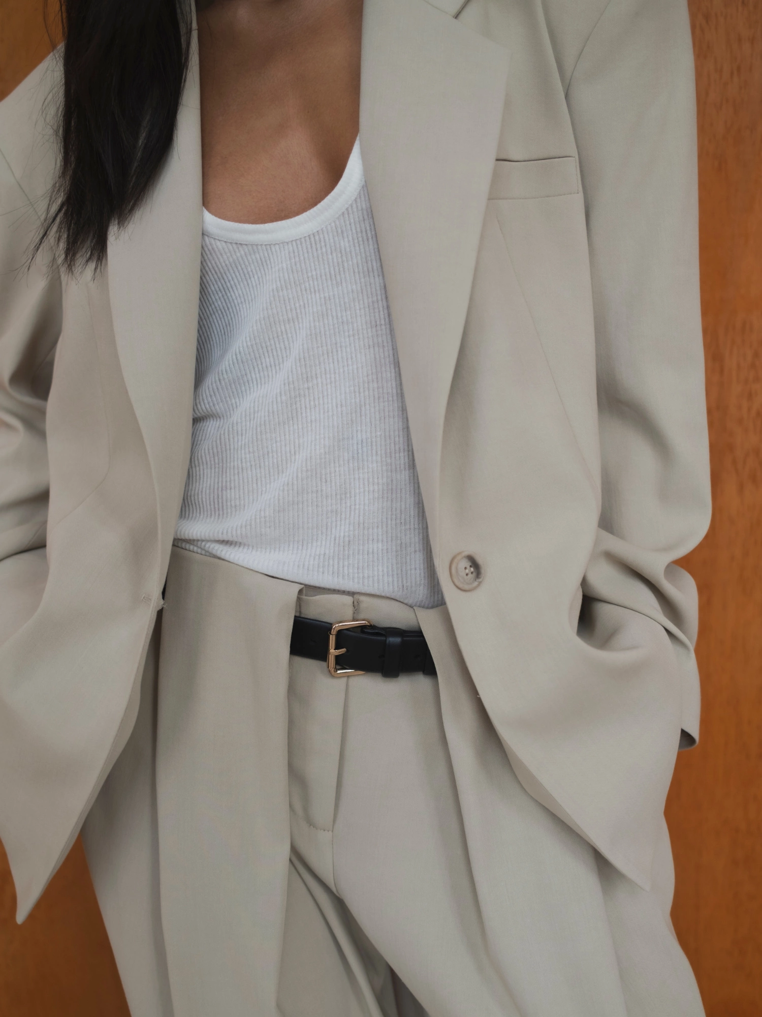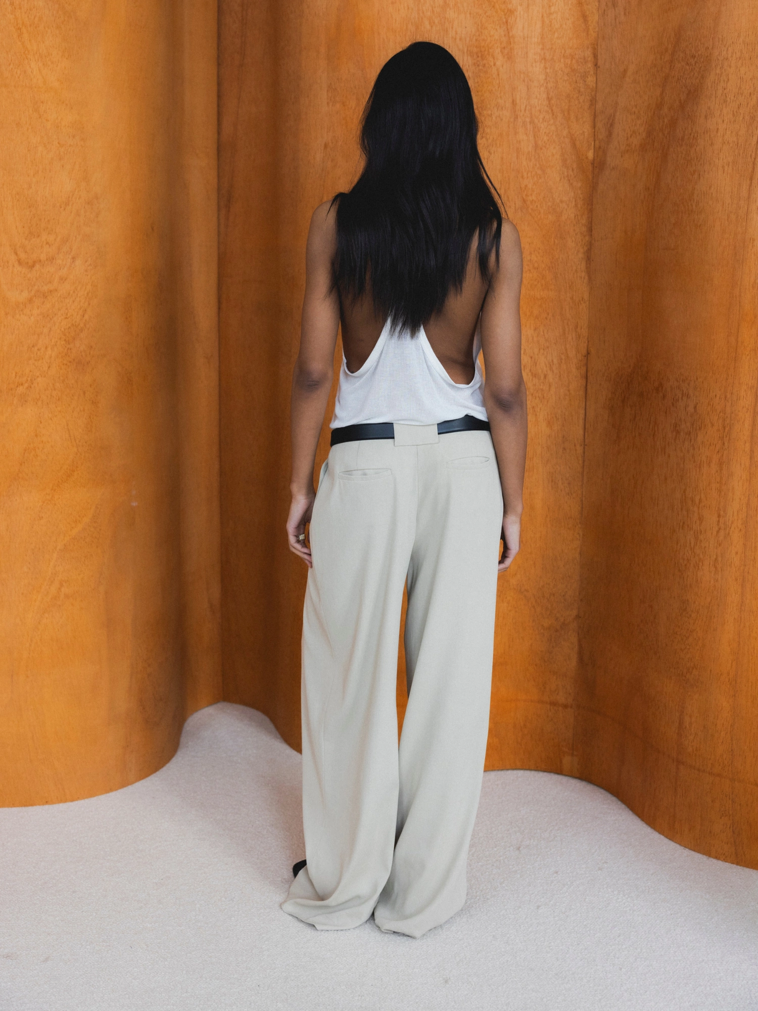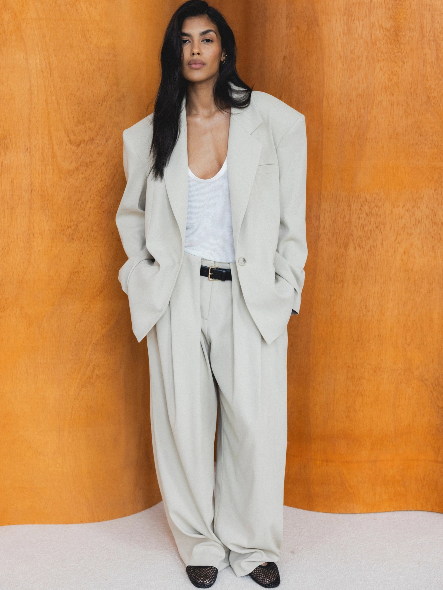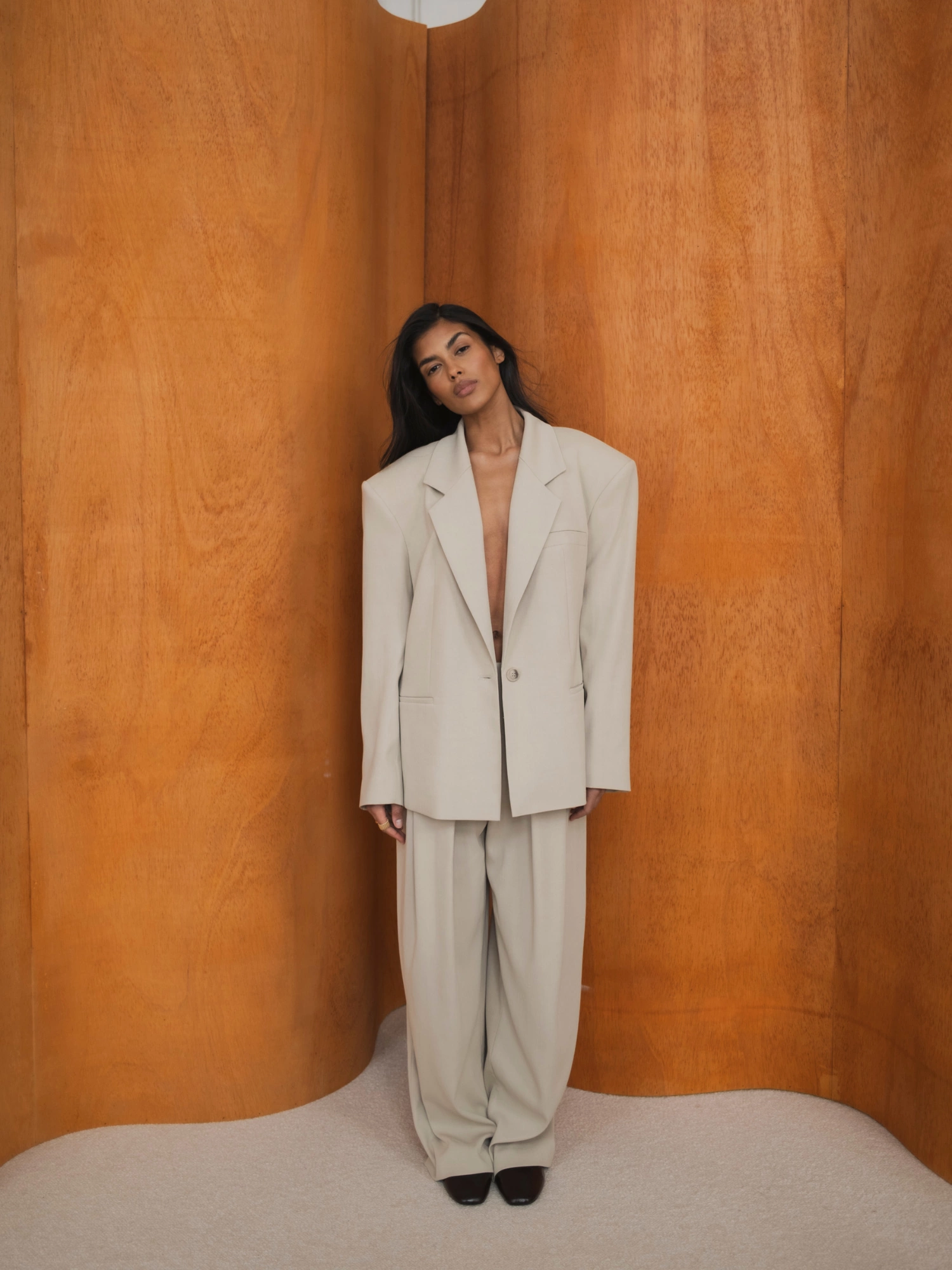 Luźne spodnie garniturowe inspirowane klasycznym, męskim krawiectwem. Charakteryzują się obniżonym stanem, głębokimi zaszewkami oraz prostą, wydłużoną nogawką, która miękko układa się na sylwetce. Wyposażone w szlufki na pasek i boczne kieszenie, łączą w sobie funkcjonalność z wyrafinowaną formą. Uszyte z wysokogatunkowej tkaniny – mieszanki bawełny i wiskozy – w eleganckim, kamiennym odcieniu beżu.