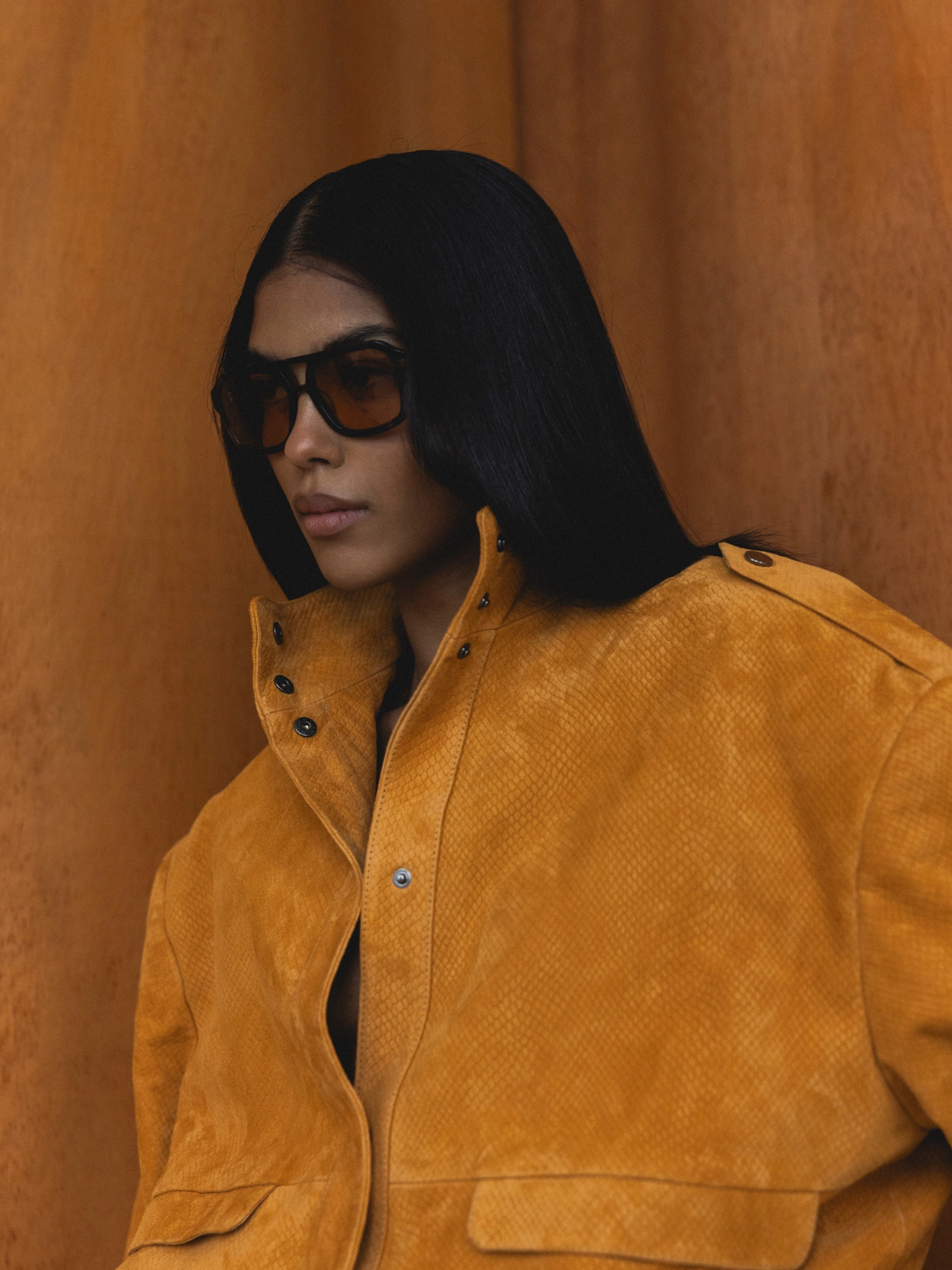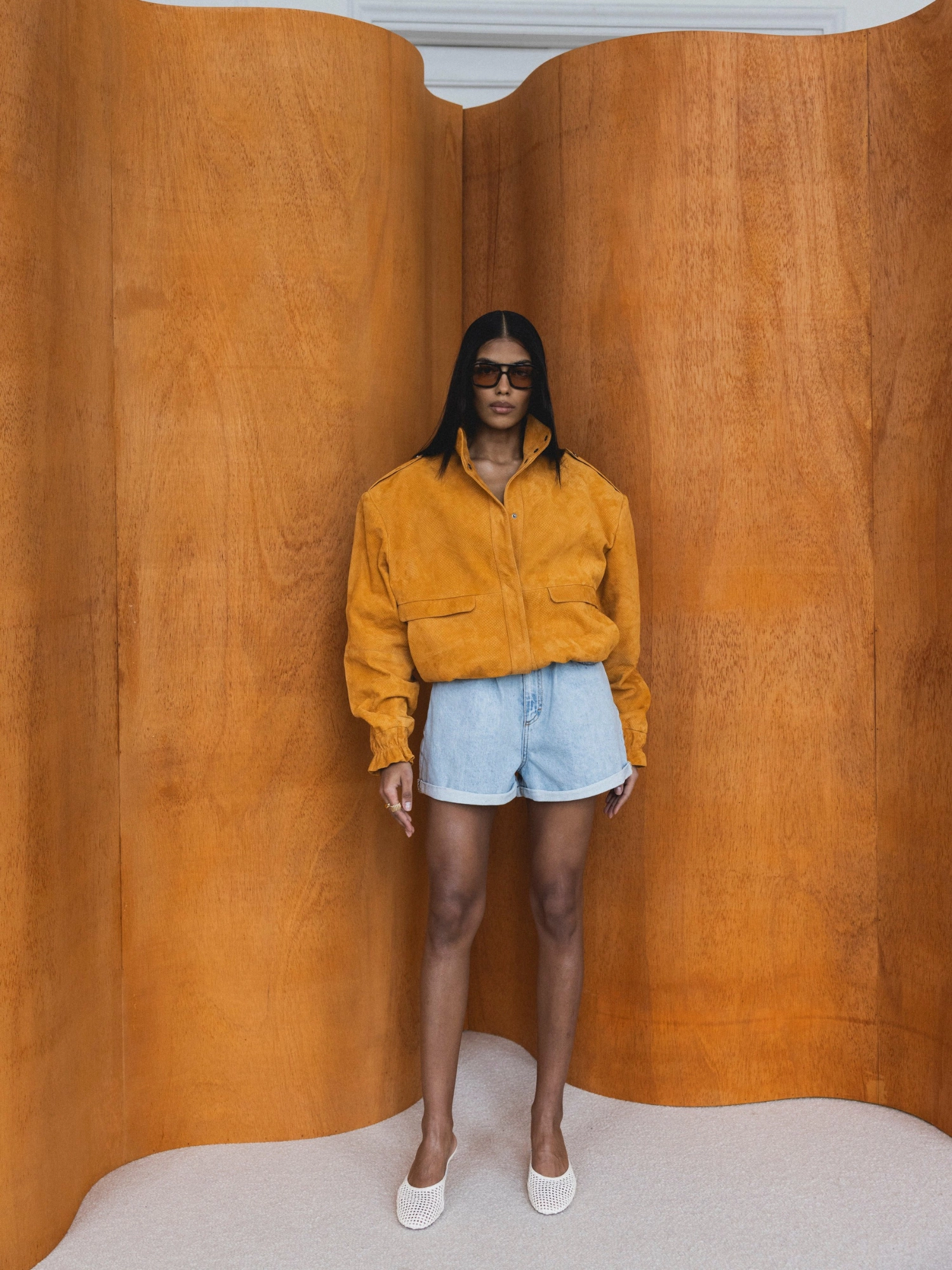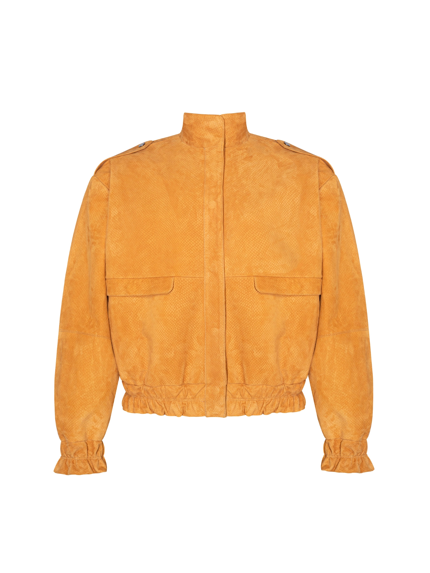 Skórzana kurtka o kroju bomberki z wąskim ściągaczem w pasie. Wykonana z wysokiej jakości teksturowanej skóry, wewnątrz wykończona podszewką z wiskozy. Jej miękka powierzchnia z charakterystyczną łuską i nasycony kolor sprawiają, że całość stylizacji zyskuje na wyjątkowym, modowym sznycie. Ma mocne ramiona z poduszkami, luźne rękawy zakończone marszczonym mankietem i klasyczną stójkę. Dodatkowo zapięcie na napy i naszywane kieszenie dodają funkcjonalności i podkreślają jej nonszalancki klimat retro.