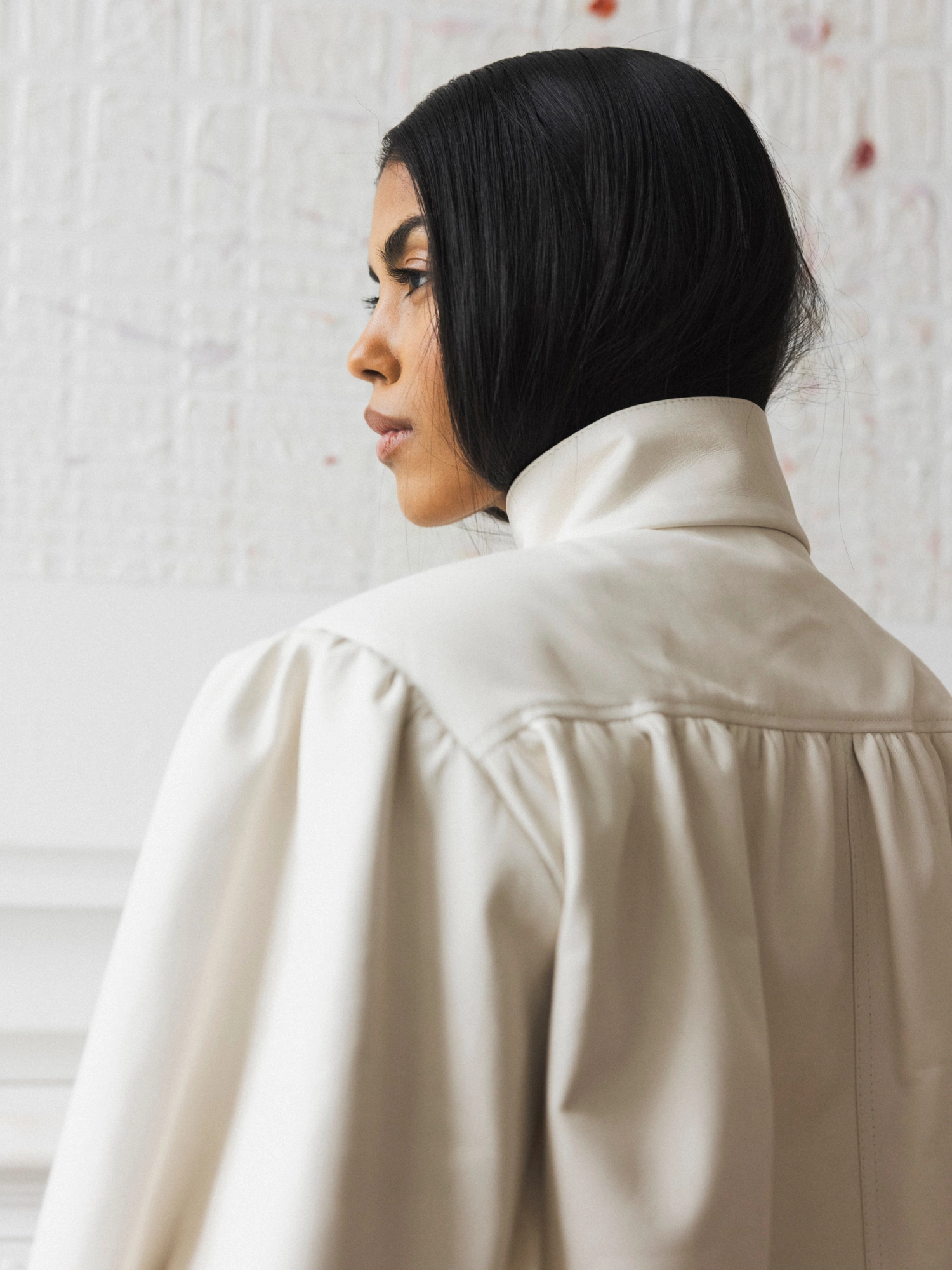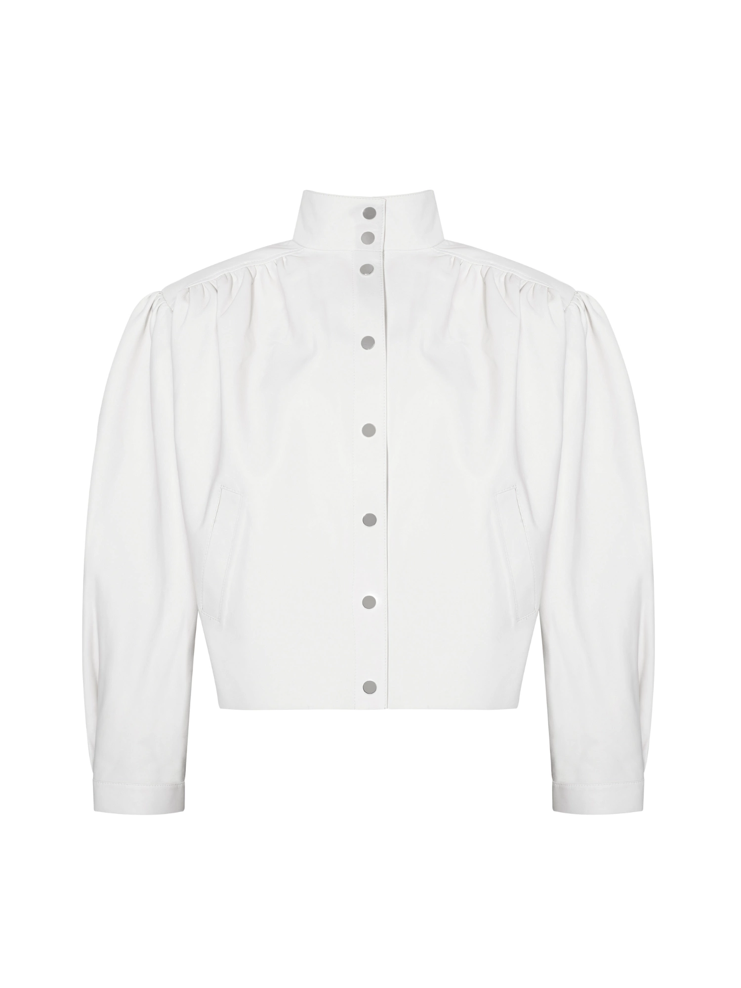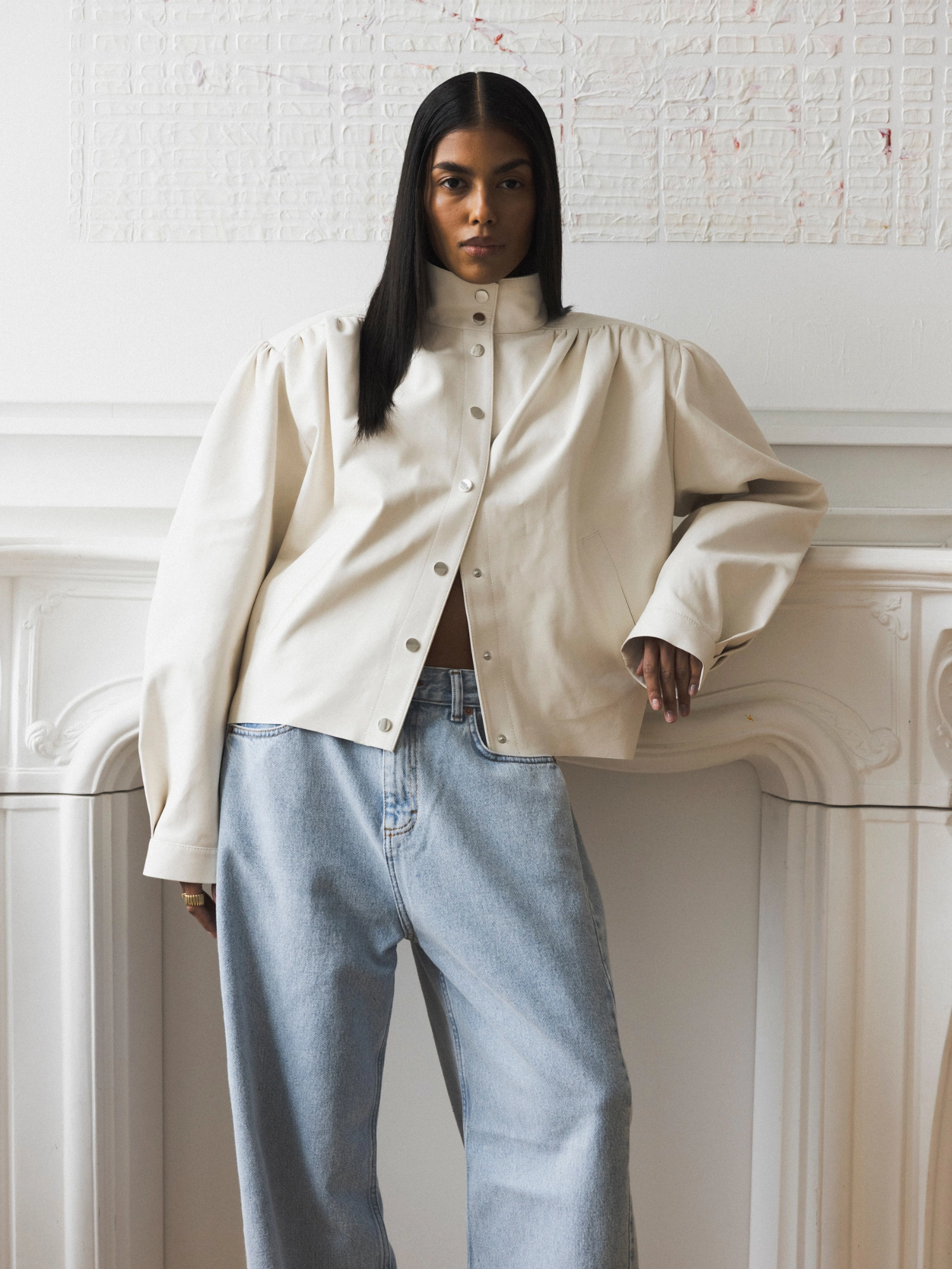 Lekka skórzana kurtka o luźnym kroju, wykonana w 100% z wyjątkowo miękkiej skóry jagnięcej. Jej gładka faktura i świeży, kremowy odcień nadają całości subtelnego luksusu, a przeskalowane rękawy oraz delikatne marszczenia przy ramionach wprowadzają nutę nonszalancji. Zapięcie na napy oraz wysoka stójka dodają jej nowoczesnego sznytu, nie tracąc przy tym klasycznego wyrazu.