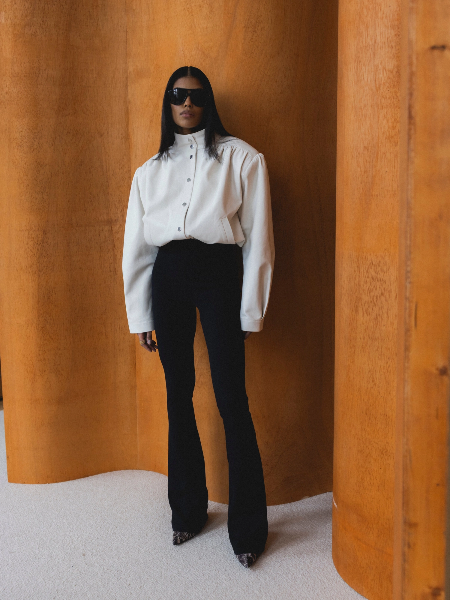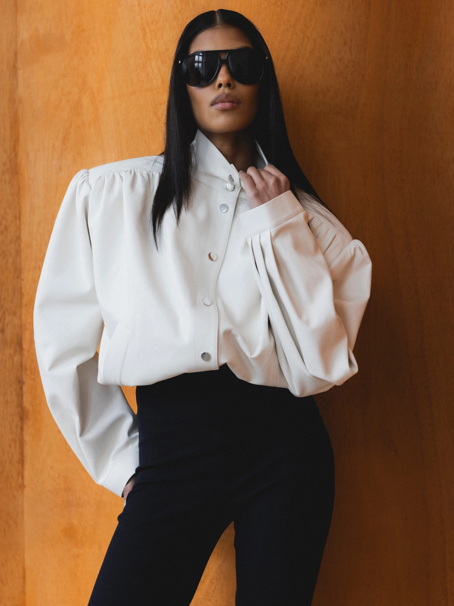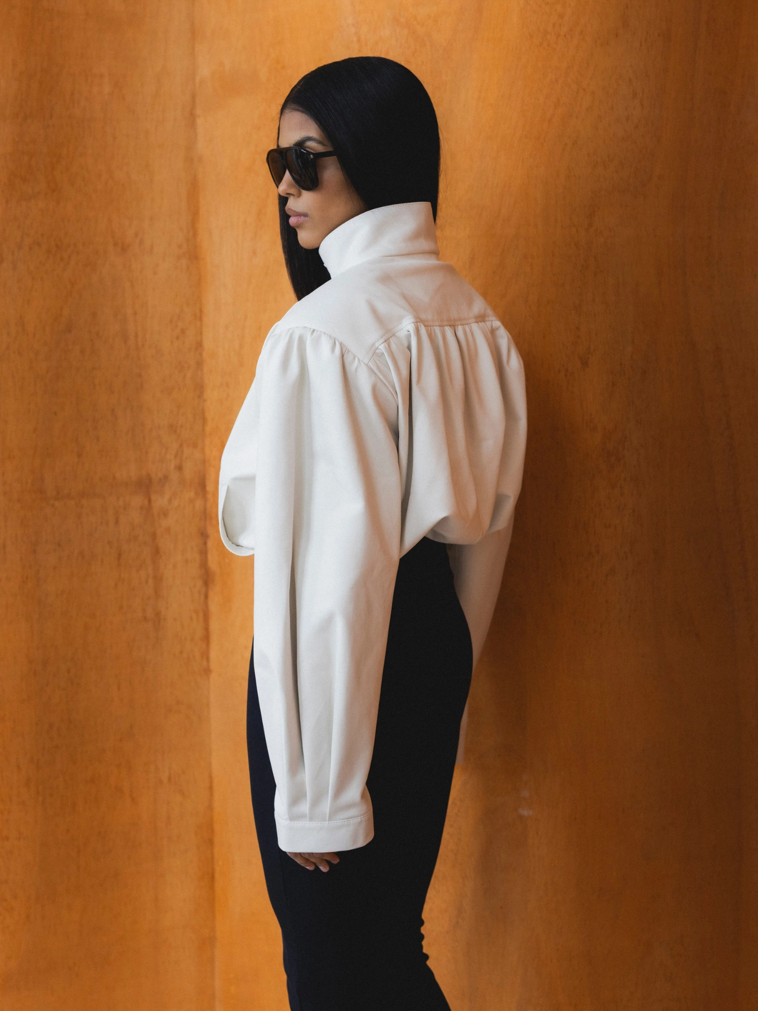 Lekka skórzana kurtka o luźnym kroju, wykonana w 100% z wyjątkowo miękkiej skóry jagnięcej. Jej gładka faktura i świeży, kremowy odcień nadają całości subtelnego luksusu, a przeskalowane rękawy oraz delikatne marszczenia przy ramionach wprowadzają nutę nonszalancji. Zapięcie na napy oraz wysoka stójka dodają jej nowoczesnego sznytu, nie tracąc przy tym klasycznego wyrazu.