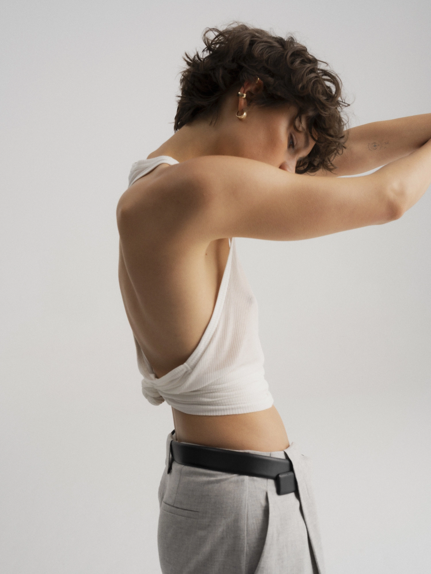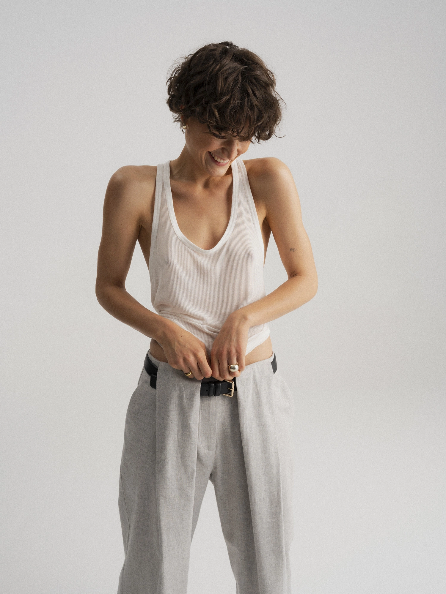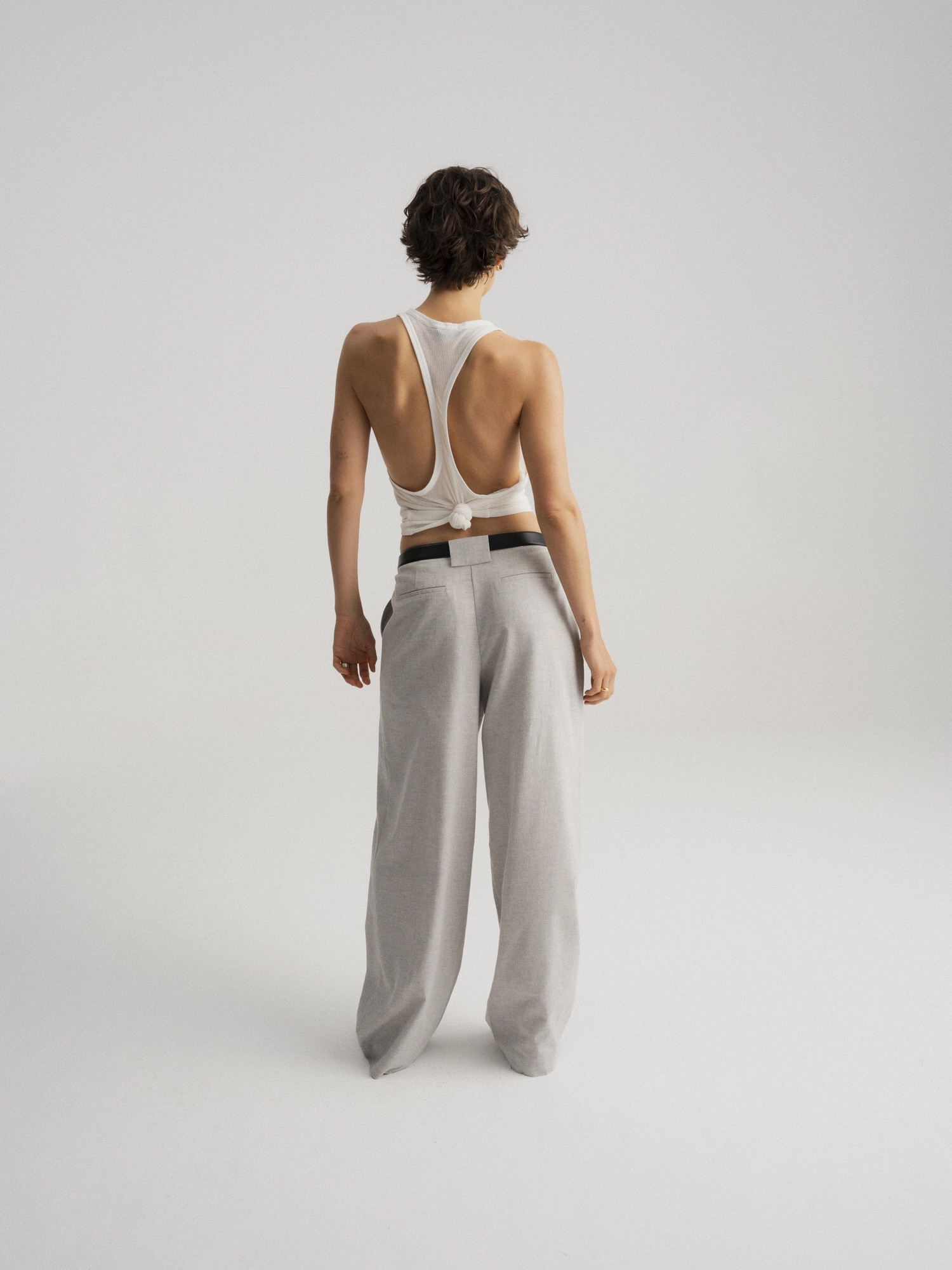 Luźne spodnie inspirowane klasycznym, męskim krawiectwem. Charakteryzują się obniżonym stanem, głębokimi zaszewkami oraz prostą, wydłużoną nogawką, która miękko układa się na sylwetce. Wyposażone w szlufki na pasek i boczne kieszenie, łączą w sobie funkcjonalność z wyrafinowaną formą. Uszyte z wiskozy w klasycznym, jasnoszarym odcieniu.
