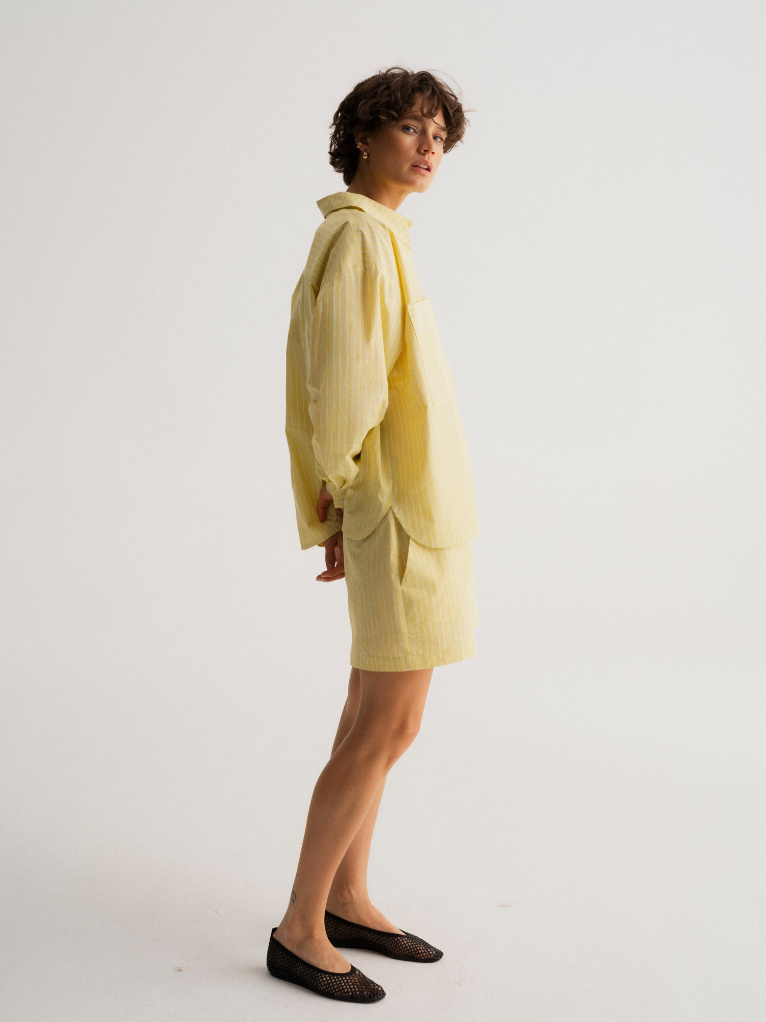 Koszula oversize wykonana w 100% z miękkiej, przewiewnej bawełny. Klasyczny kołnierzyk, długi rękaw i luźny, męski krój nadają jej nonszalanego, wakacyjnego charakteru. Delikatny, pastelowy kolor i subtelny prążek sprawiają, że całość wygląda świeżo i lekko. Idealna do narzucenia na bikini w drodze na plażę, jako część letniego zestawu z szortami albo nonszalancko wpuszczona w jeansy. Noś na wiele sposobów — solo lub jako warstwę — zawsze z luzem i swobodą.