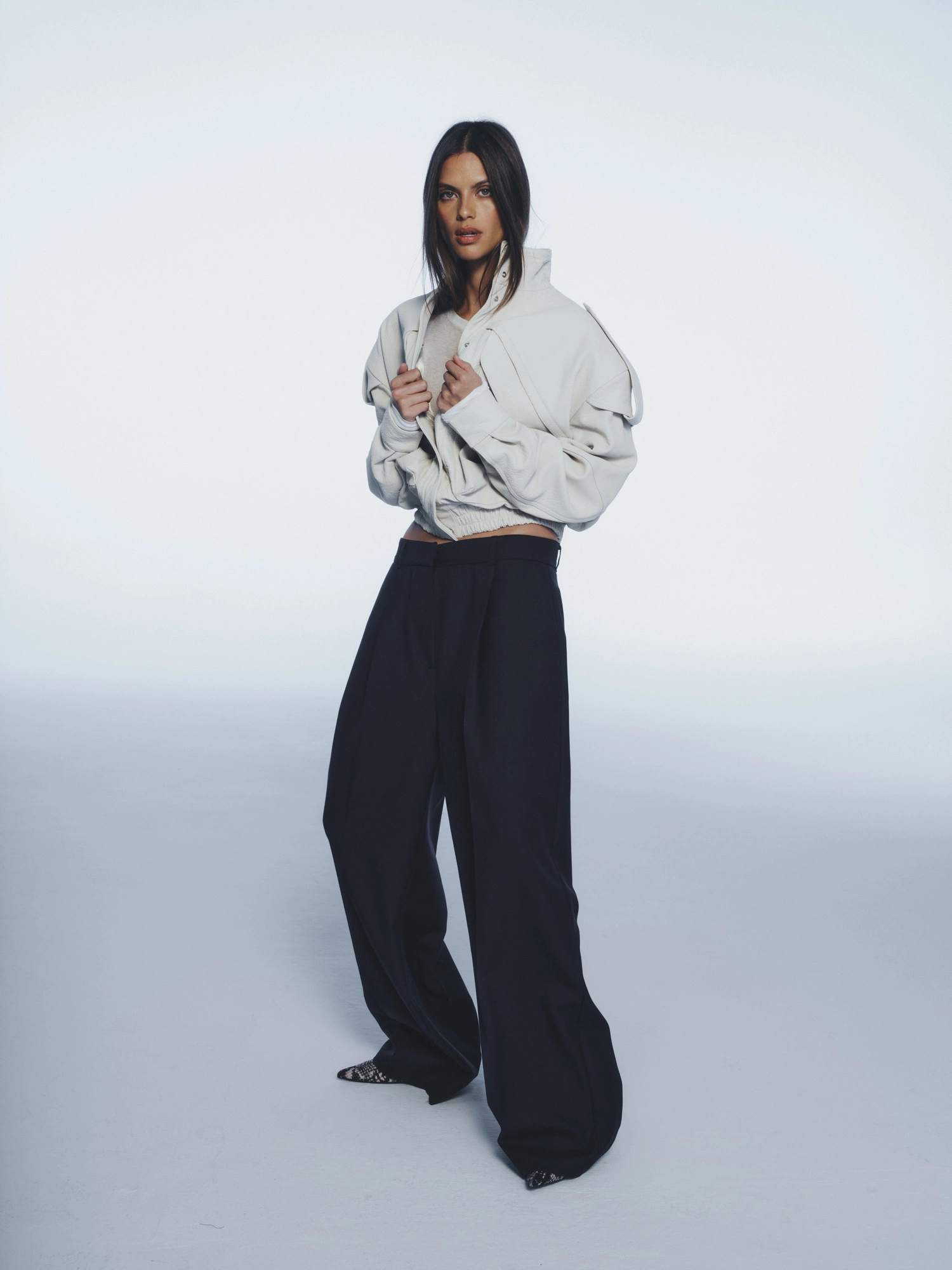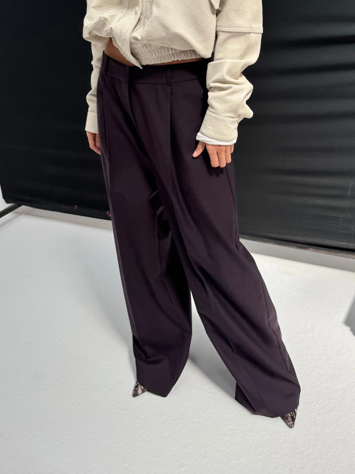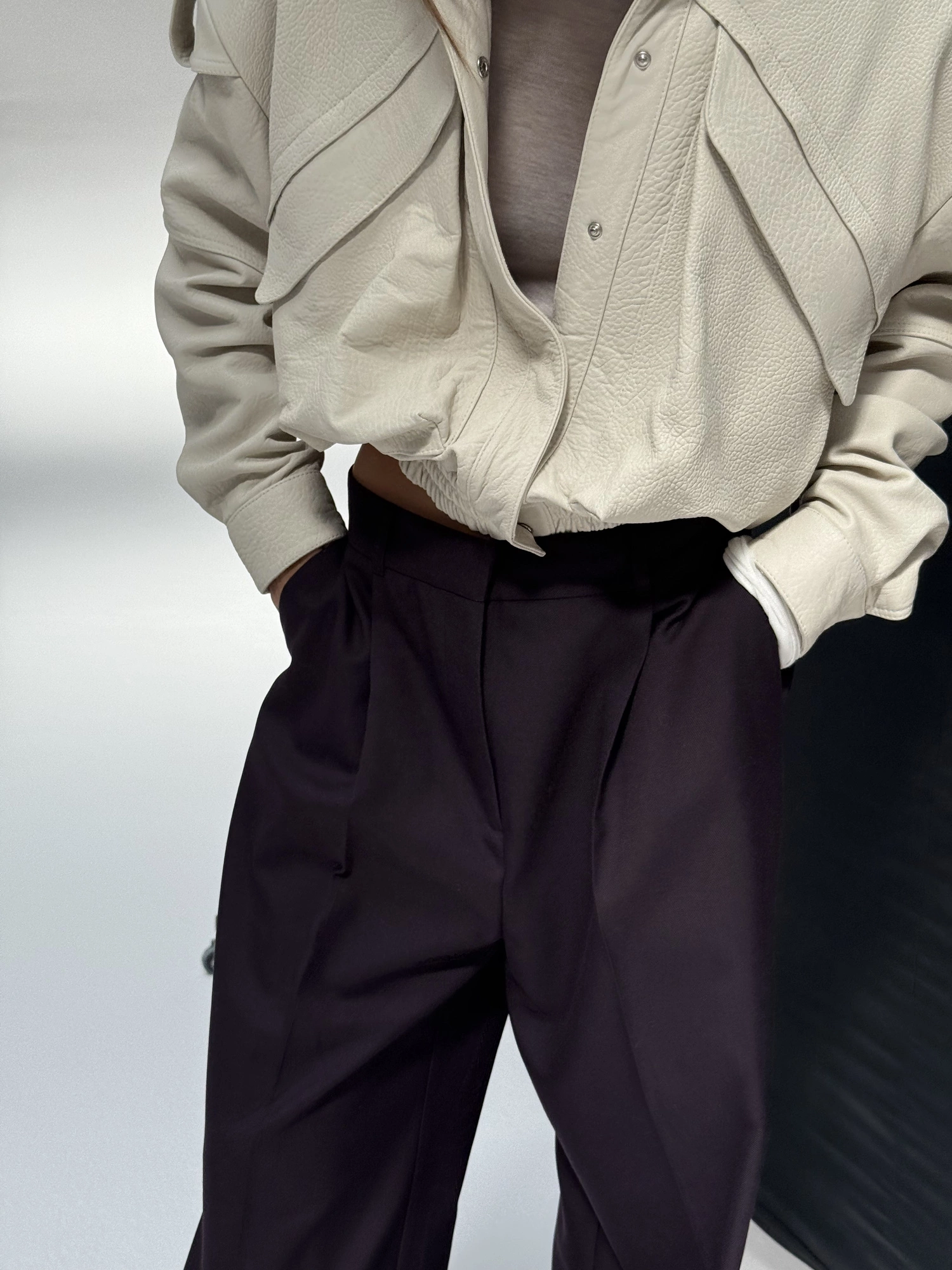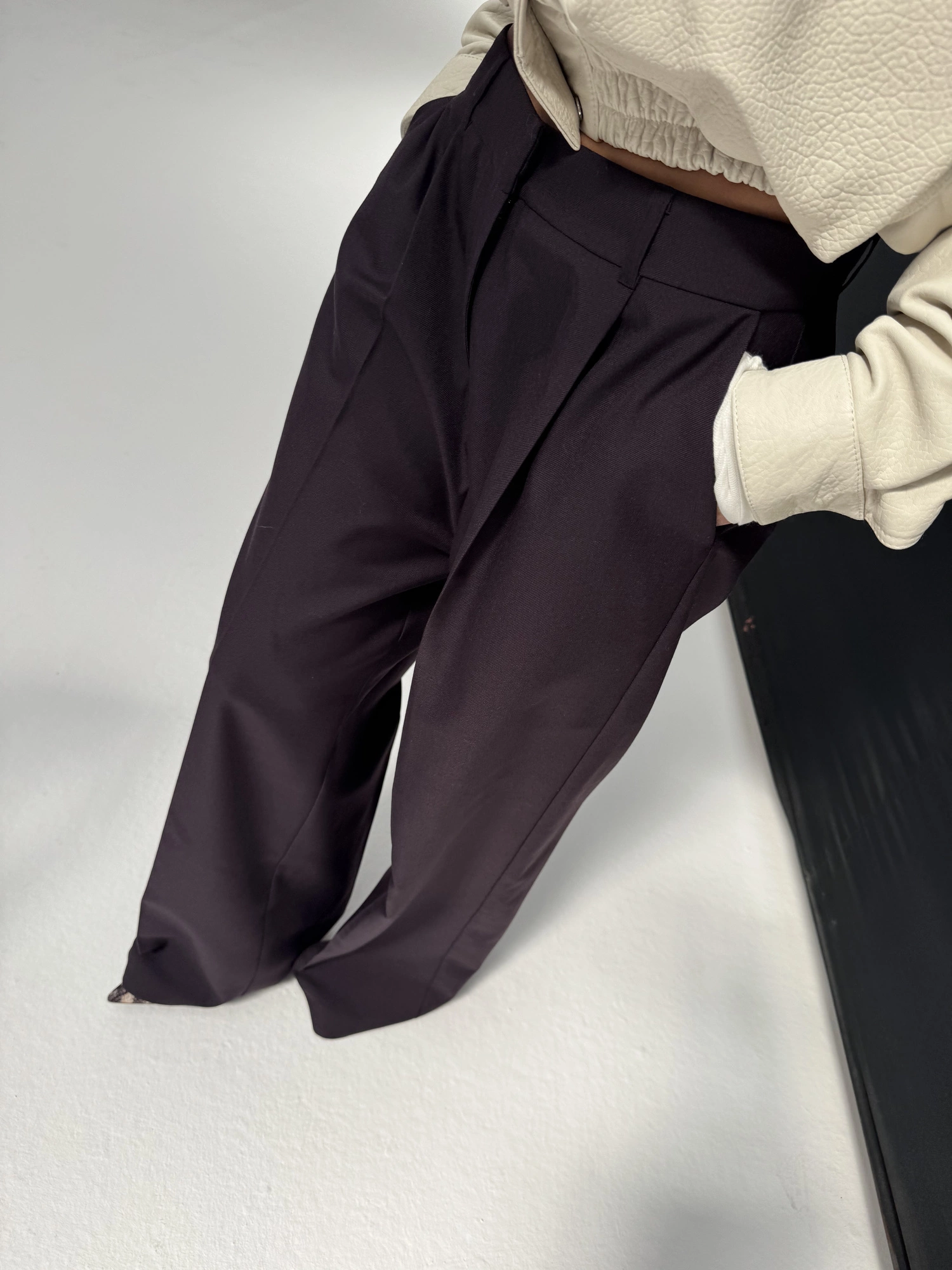 Spodnie z zakładkami o szerokim, stylizowanym na męski kroju. Wykonane w 100% z miękkiej wełny w wyjątkowym, głębokim odcieniu burgundu. Mają proste, długie nogawki, dwie boczne kieszenie, są zapinane na zamek i haftkę. Z pewnością będą silnym akcentem każdej stylizacji - zarówno tej eleganckiej, jak i codziennej ze sneakersami i bluzą. Połącz z pozostałymi projektami z kolekcji i stwórz minimalistyczny, ponadczasowy zestaw, który nie będzie Cię w niczym ograniczał.