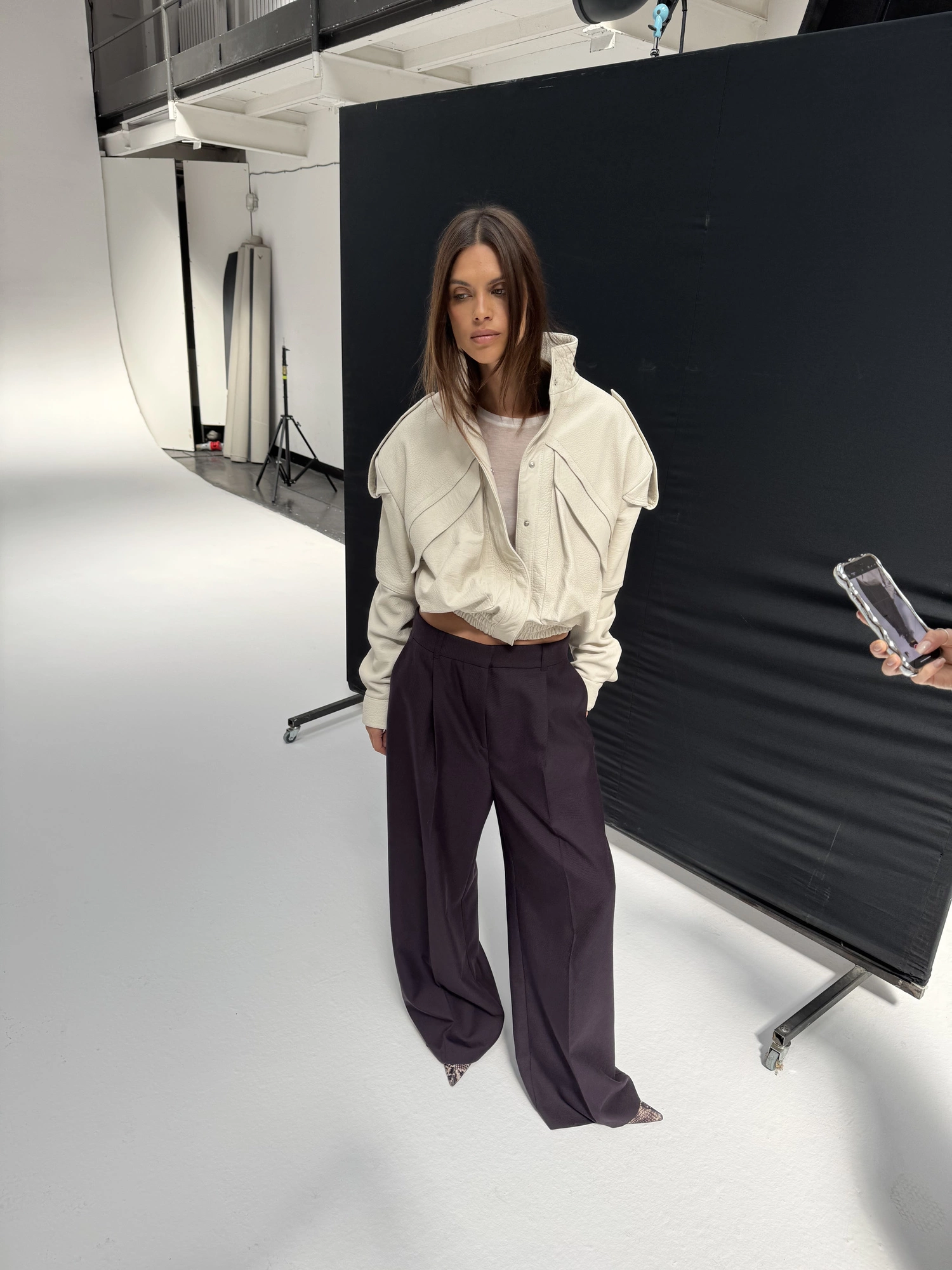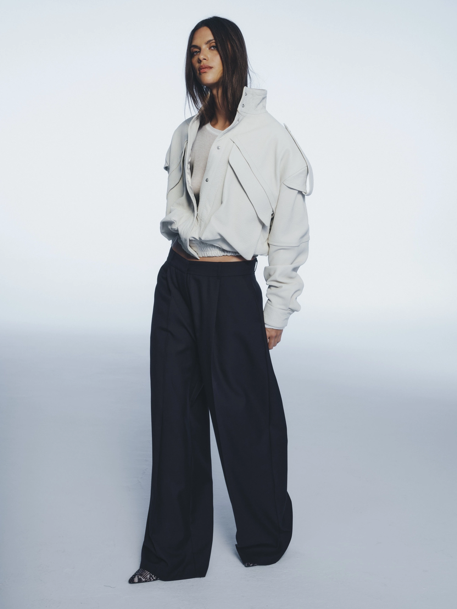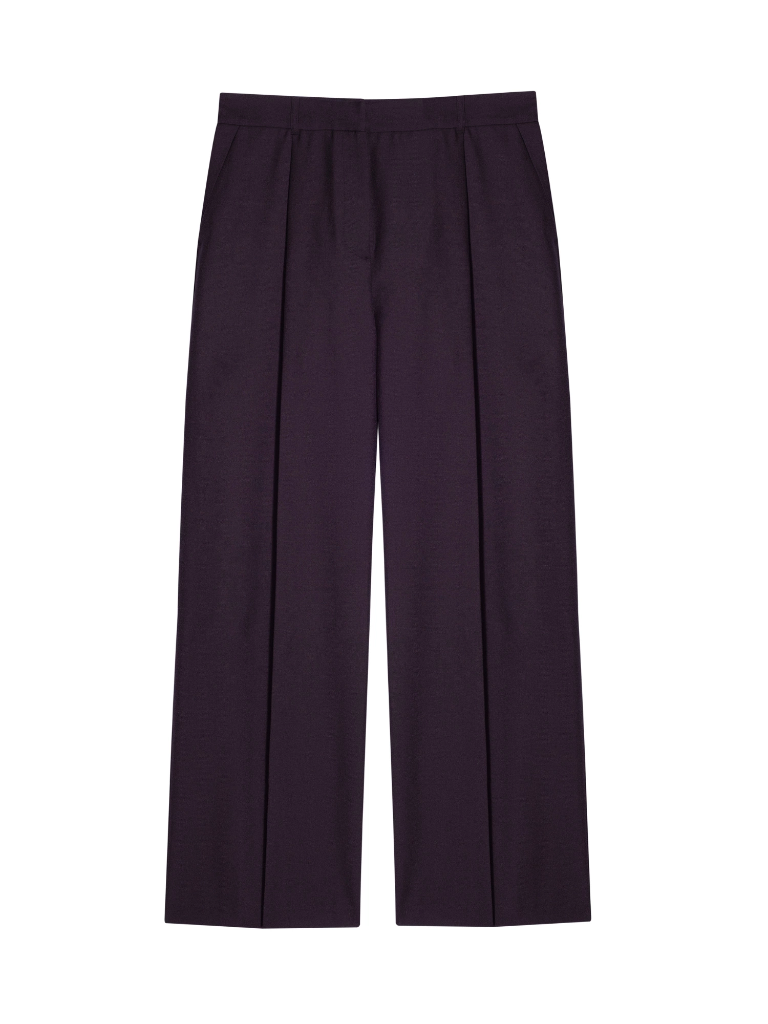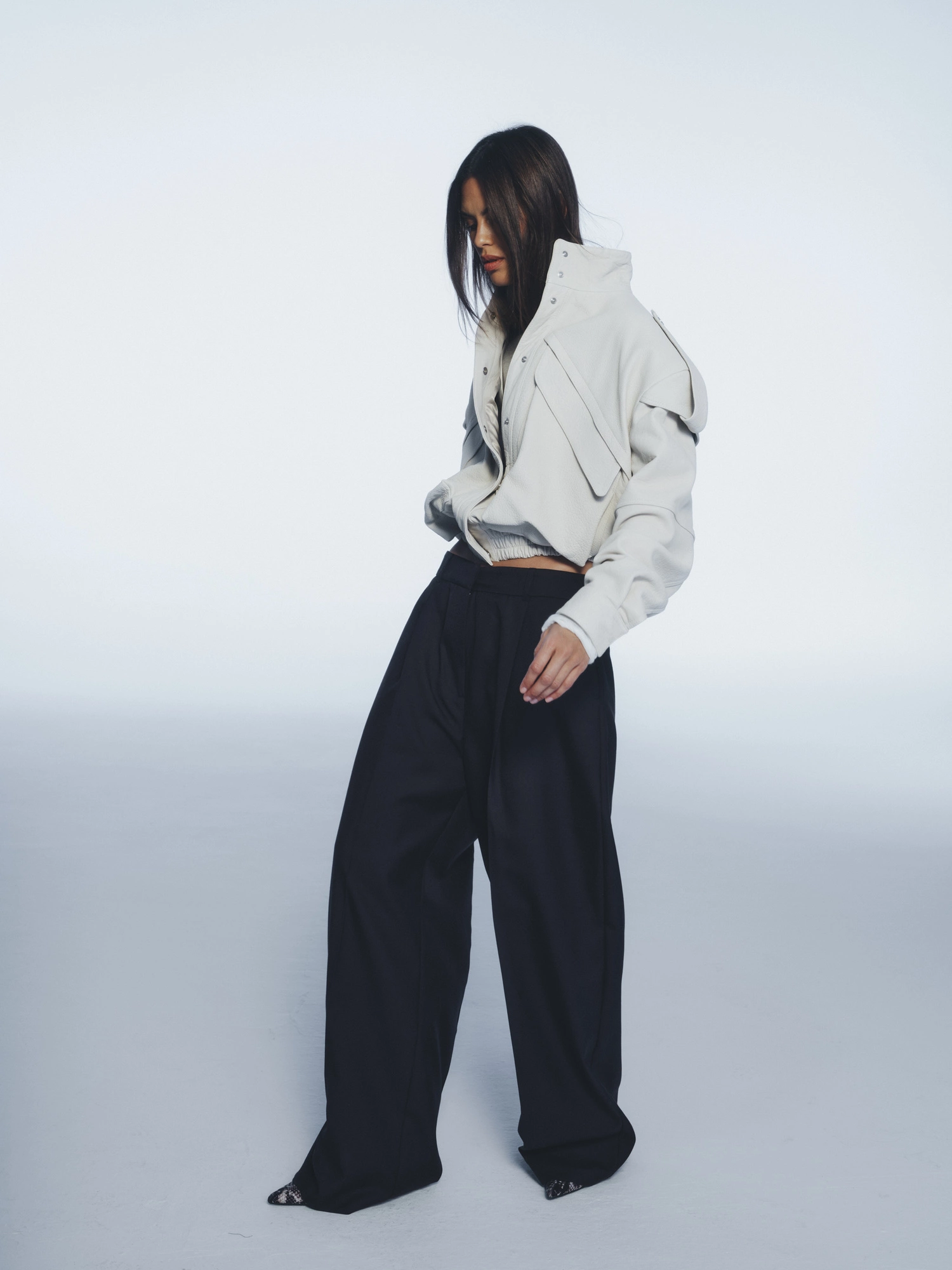 Spodnie z zakładkami o szerokim, stylizowanym na męski kroju. Wykonane w 100% z miękkiej wełny w wyjątkowym, głębokim odcieniu burgundu. Mają proste, długie nogawki, dwie boczne kieszenie, są zapinane na zamek i haftkę. Z pewnością będą silnym akcentem każdej stylizacji - zarówno tej eleganckiej, jak i codziennej ze sneakersami i bluzą. Połącz z pozostałymi projektami z kolekcji i stwórz minimalistyczny, ponadczasowy zestaw, który nie będzie Cię w niczym ograniczał.