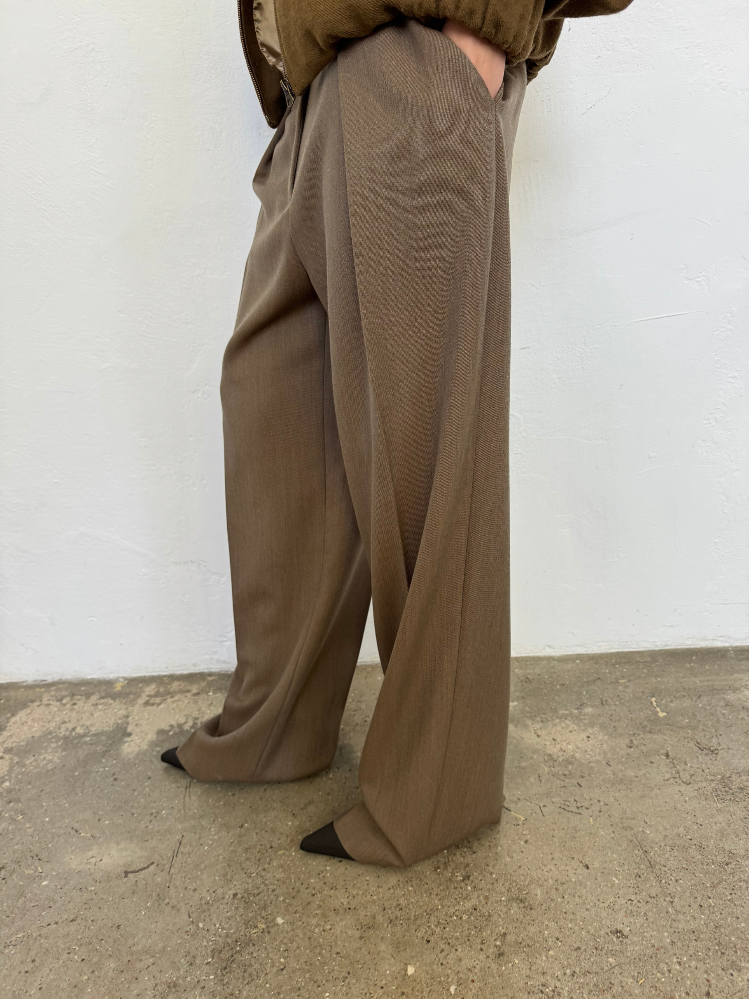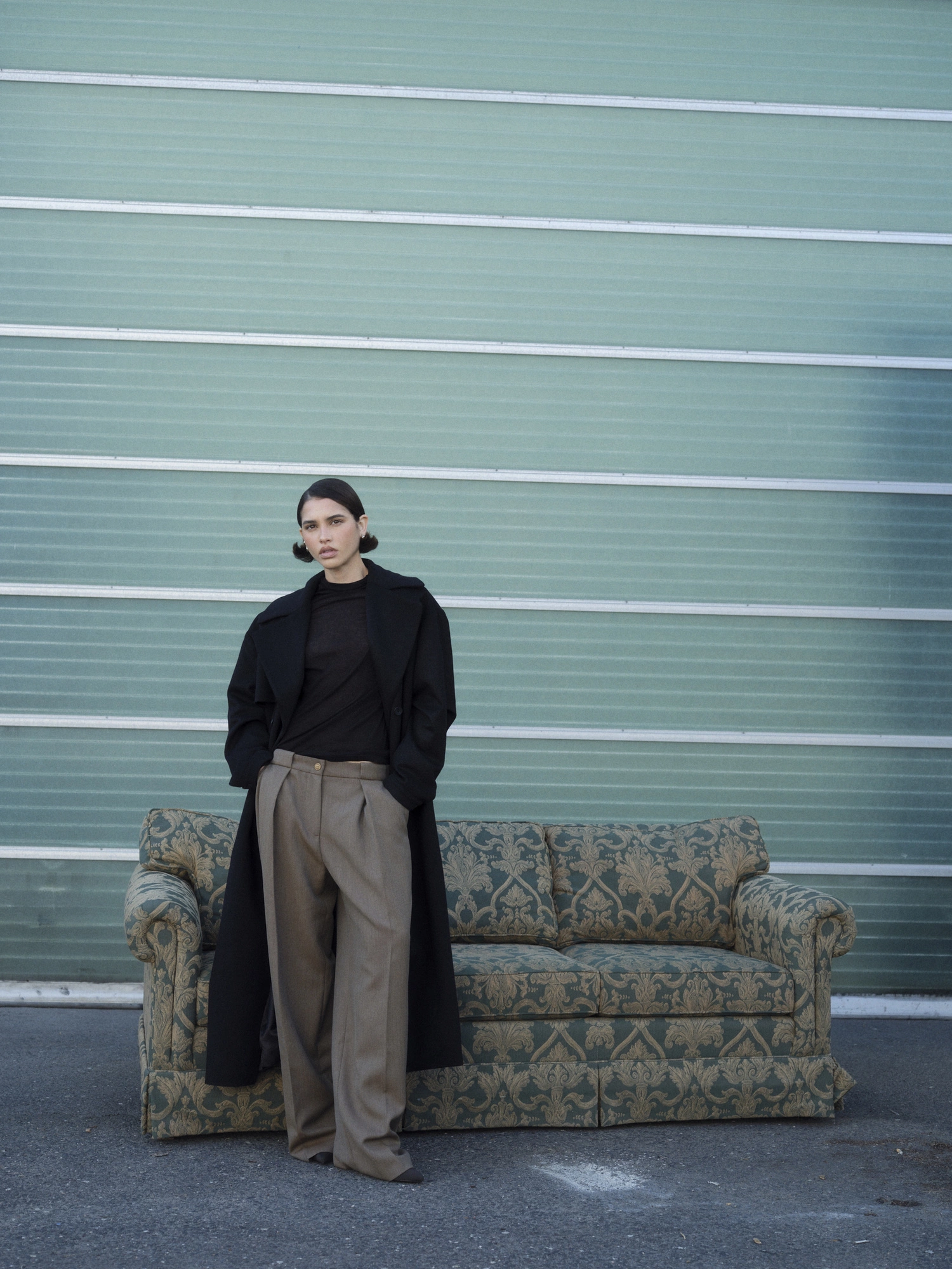 Luźne spodnie inspirowane klasycznym, męskim krawiectwem, uszyte z miękkiej wełny. Charakteryzują się obniżonym stanem, głębokimi zaszewkami oraz prostą, wydłużoną nogawką, która miękko układa się na sylwetce. Wyposażone w szlufki na pasek i boczne kieszenie, łączą w sobie funkcjonalność z wyrafinowaną formą.
