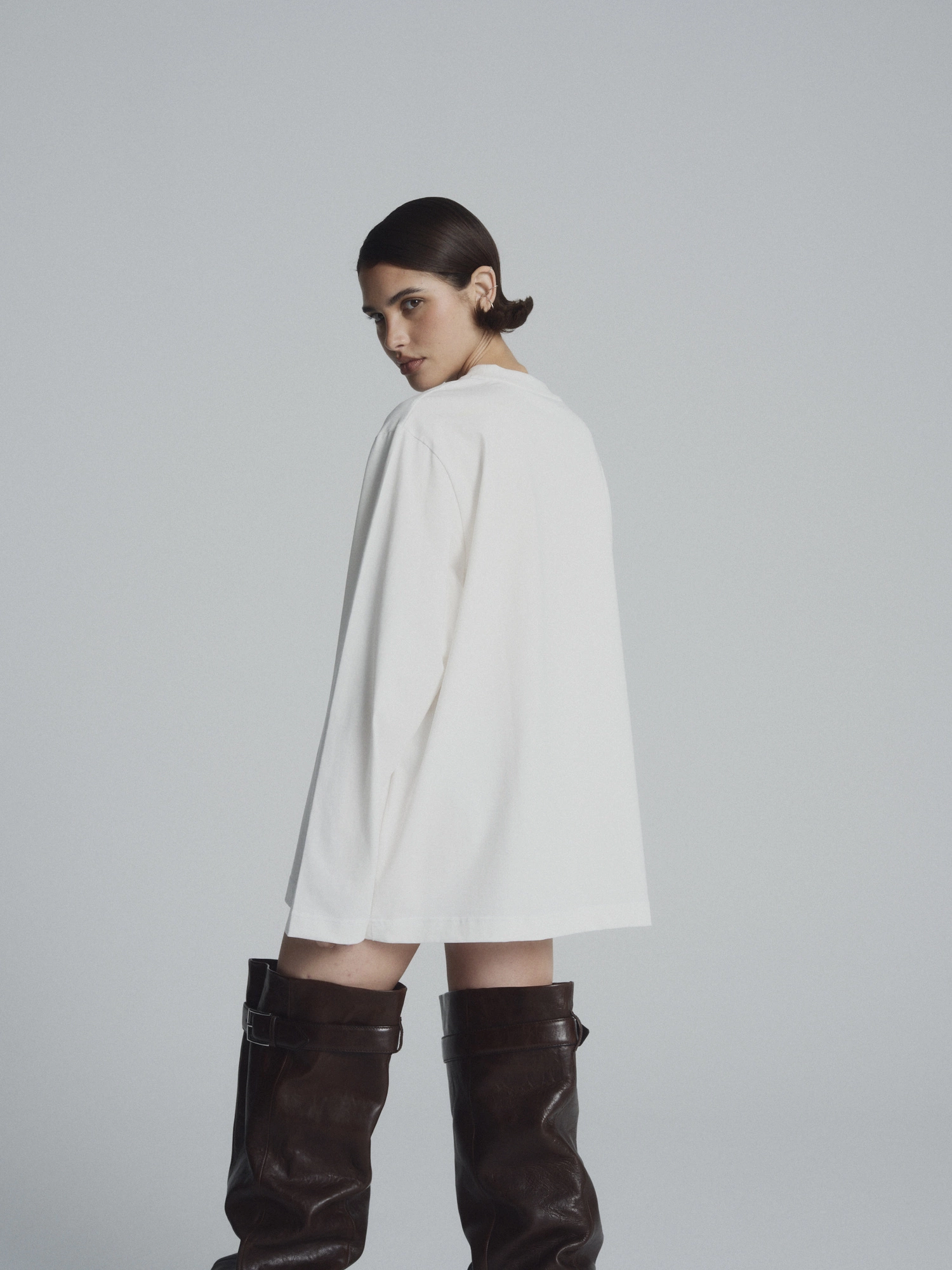 Longsleeve oversize uszyty w 100% z mięsistej, wysokogatunkowej bawełny. Miękki, przyjemny w dotyku i wyjątkowo komfortowy w noszeniu. Luźny, lekko wydłużony krój nadaje mu nowoczesny, swobodny charakter i sprawia, że doskonale układa się na sylwetce.