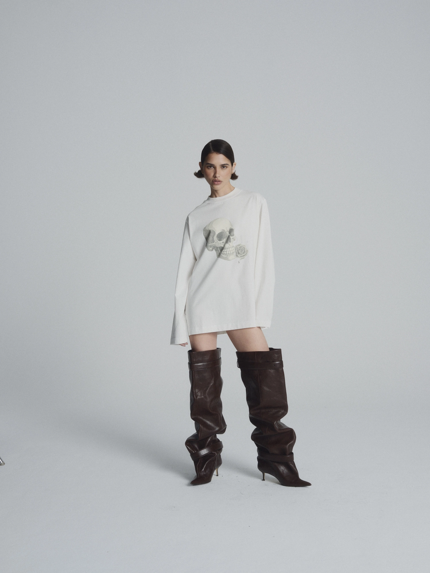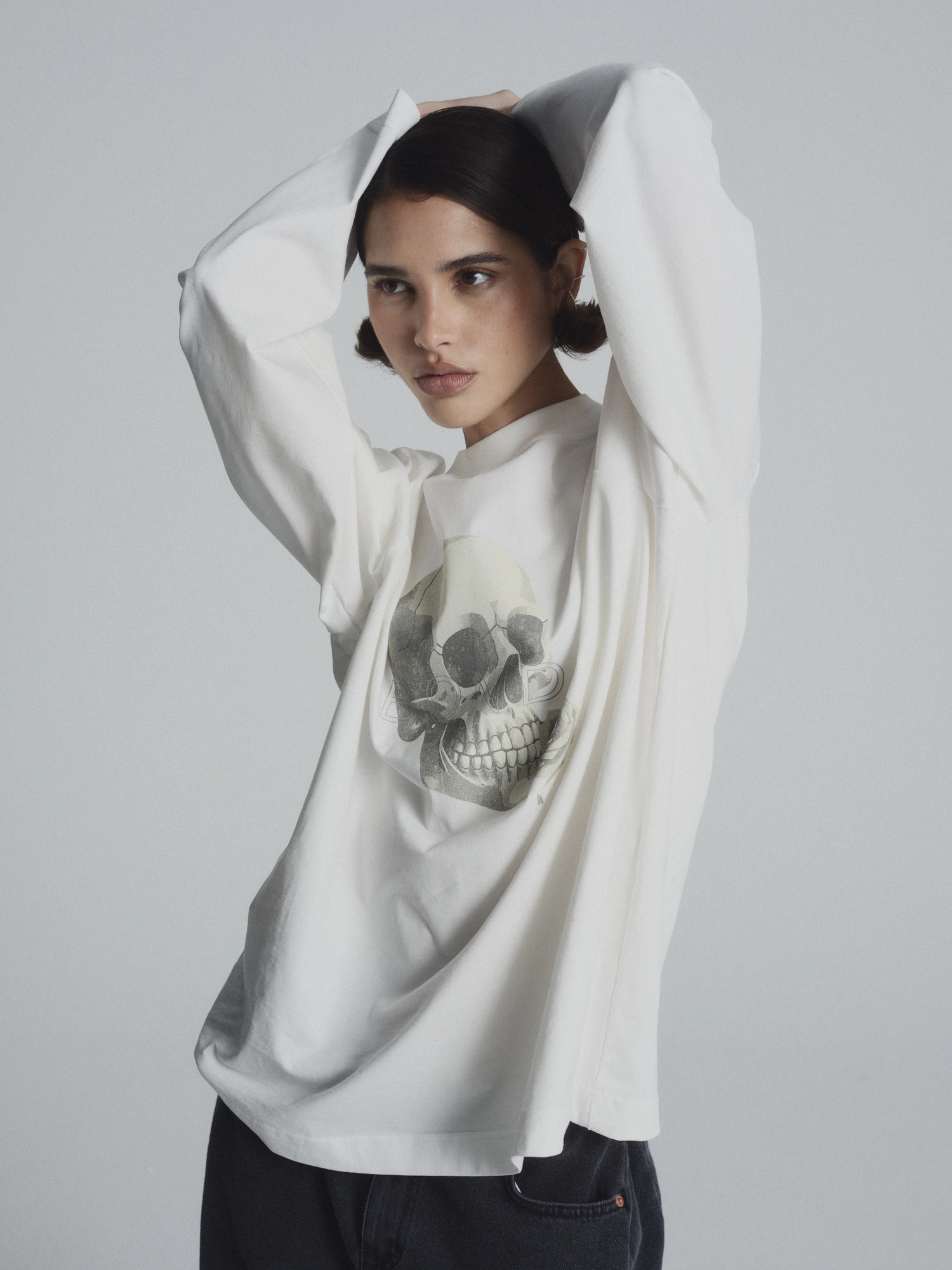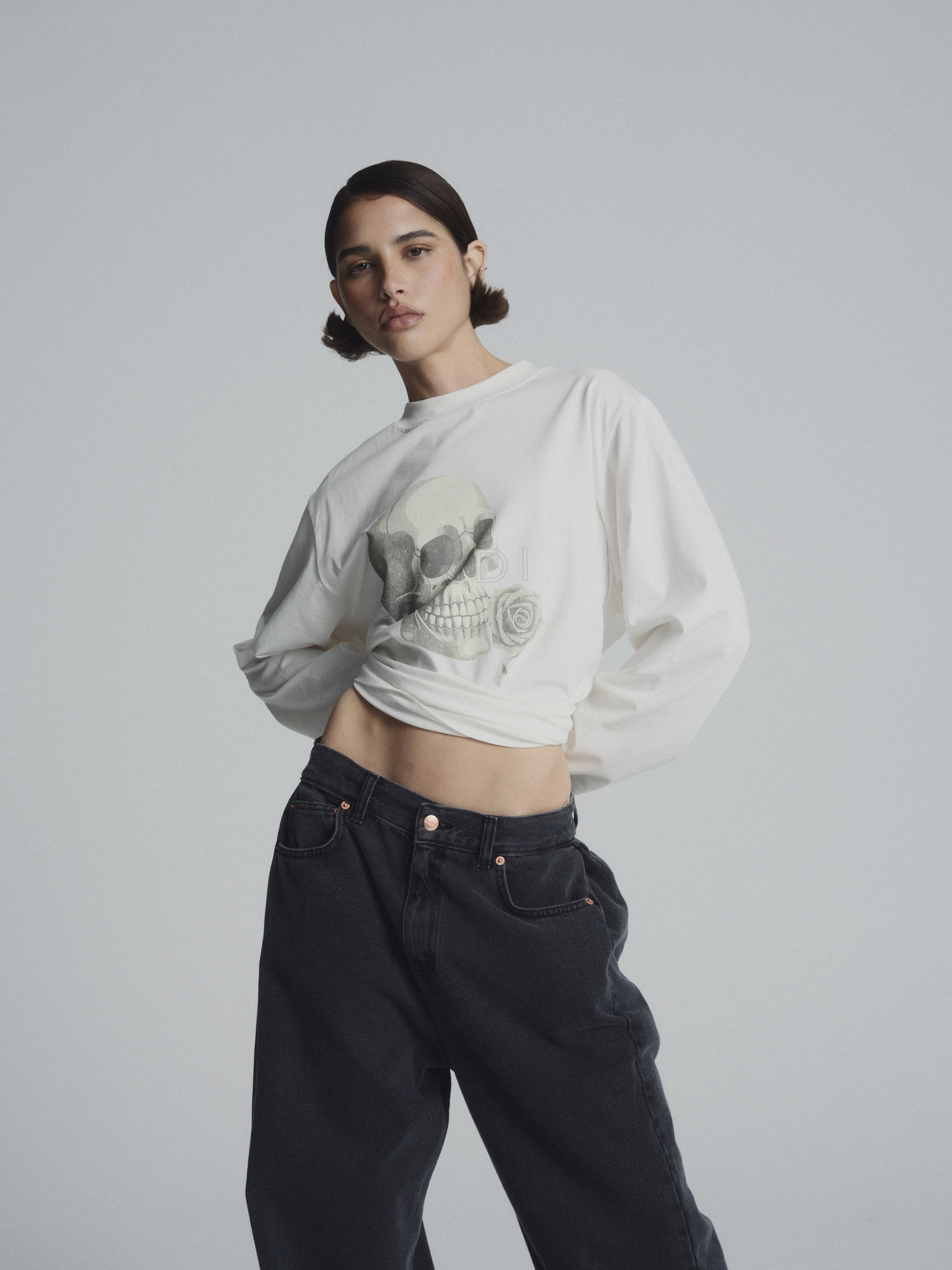 Centralnym punktem projektu jest grafika z motywem czaszki i róży, która przełamuje minimalistyczną formę i dodaje całości wyrazistego, buntowniczego tonu.