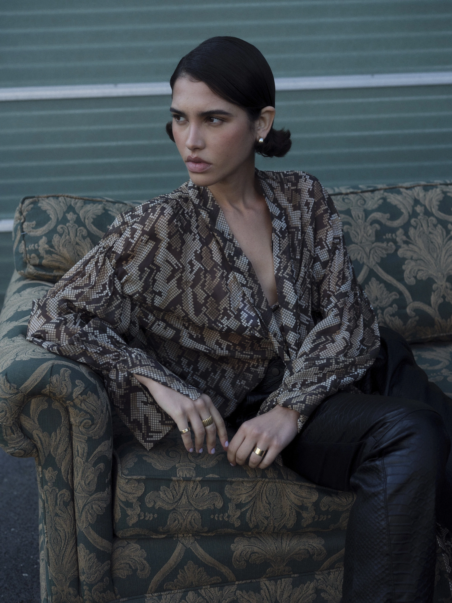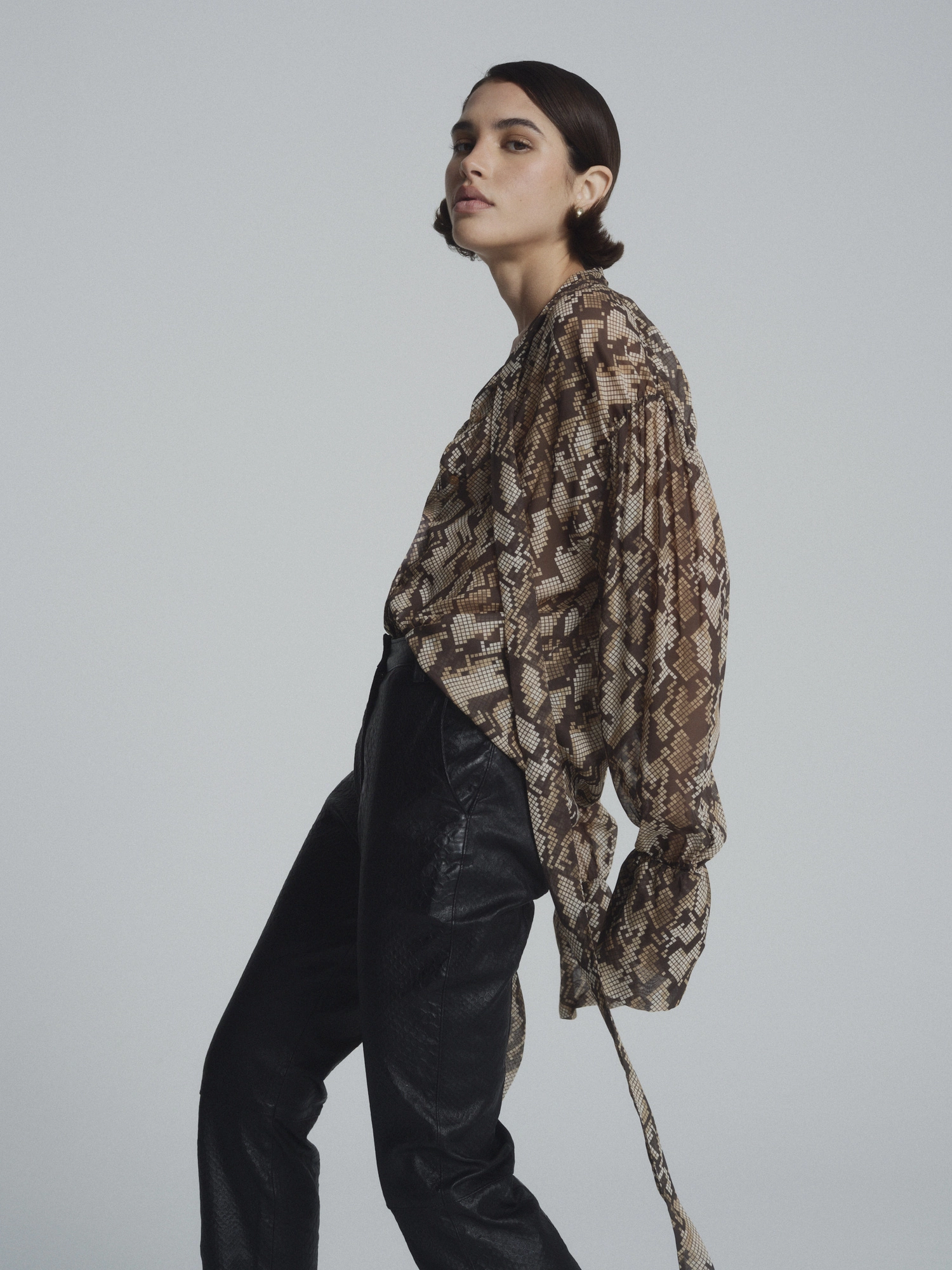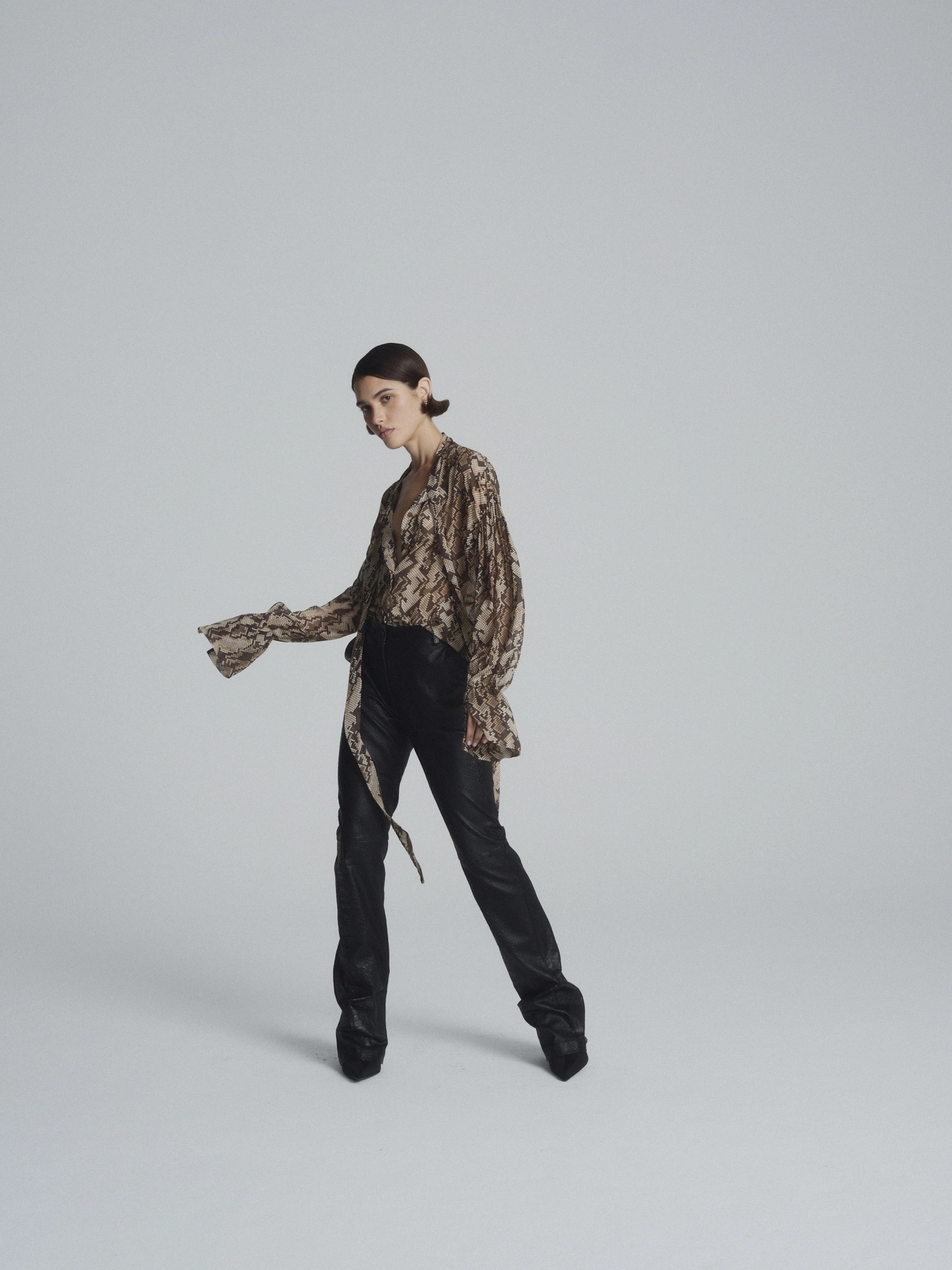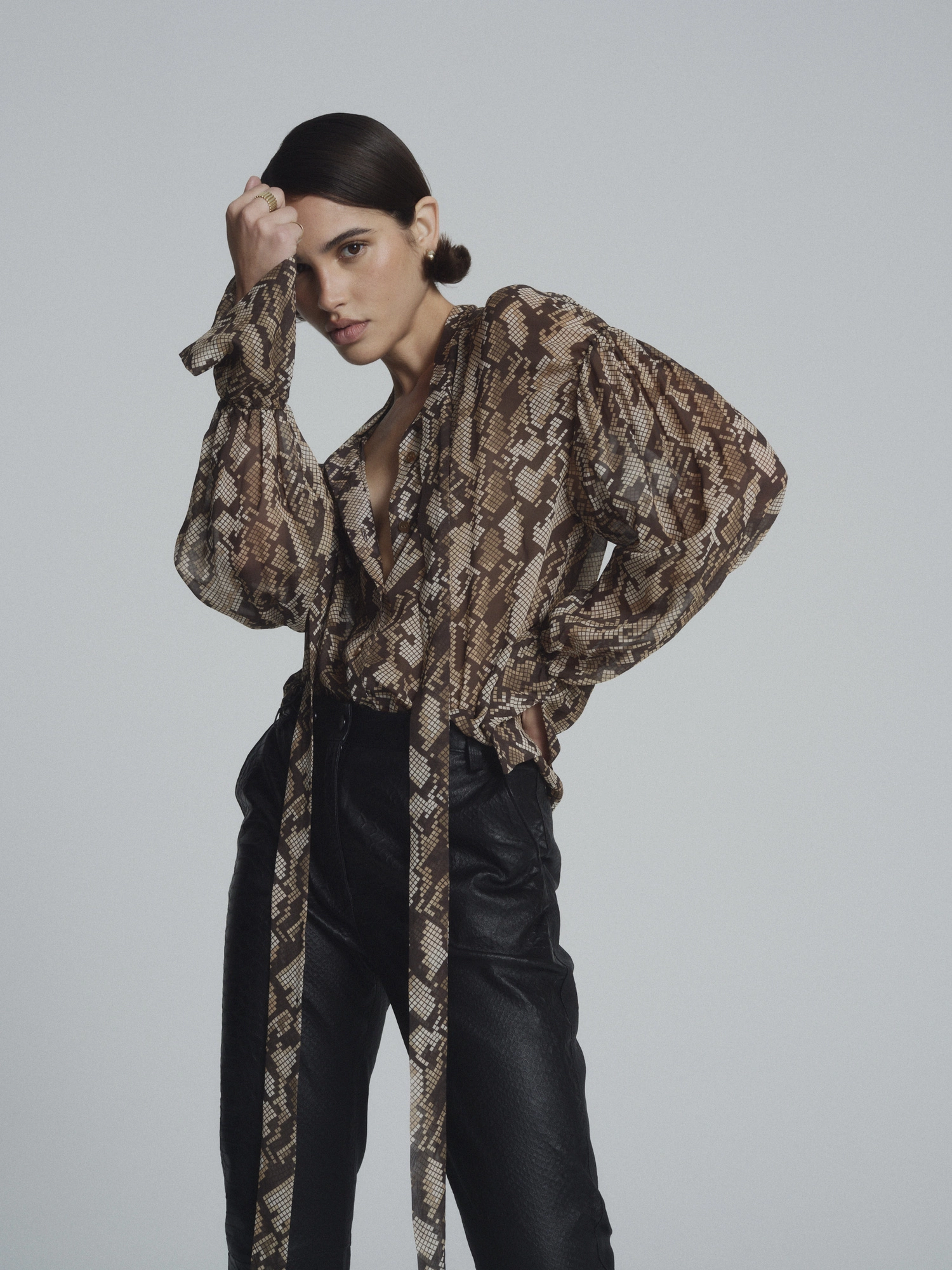 Koszula, która łączy zmysłowość z odważnym zwierzęcym printem - zwiewna, kobieca i pełna elegancji. Ma lekko bufiaste rękawy, zakończone efektowym mankietem z rozcięciem oraz wysmuklający szyję dekolt w kształcie litery V. Jest zapinana na guziki, a nonszalancji dodaje jej ozdobna szarfa, którą możesz zawiązać na szyi lub pozostawić swobodnie opadającą - dzięki temu dopasujesz ją do swojego stylu i preferencji. Luźny krój sprawia, że koszula jest niezwykle komfortowa i idealnie sprawdzi się zarówno w casualowych, jak i bardziej eleganckich zestawach.